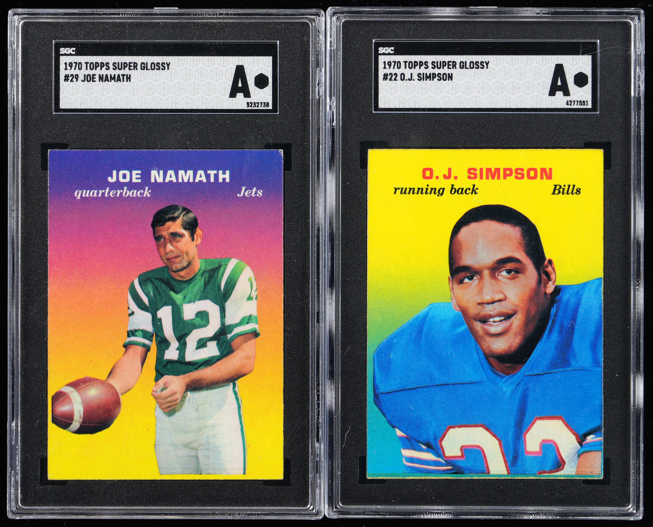 1970 Topps Super Glossy Proof Hall of Fame SGC Graded Pair with #22 O.J. Simpson & #29 Joe Namath - both SGC Authentic