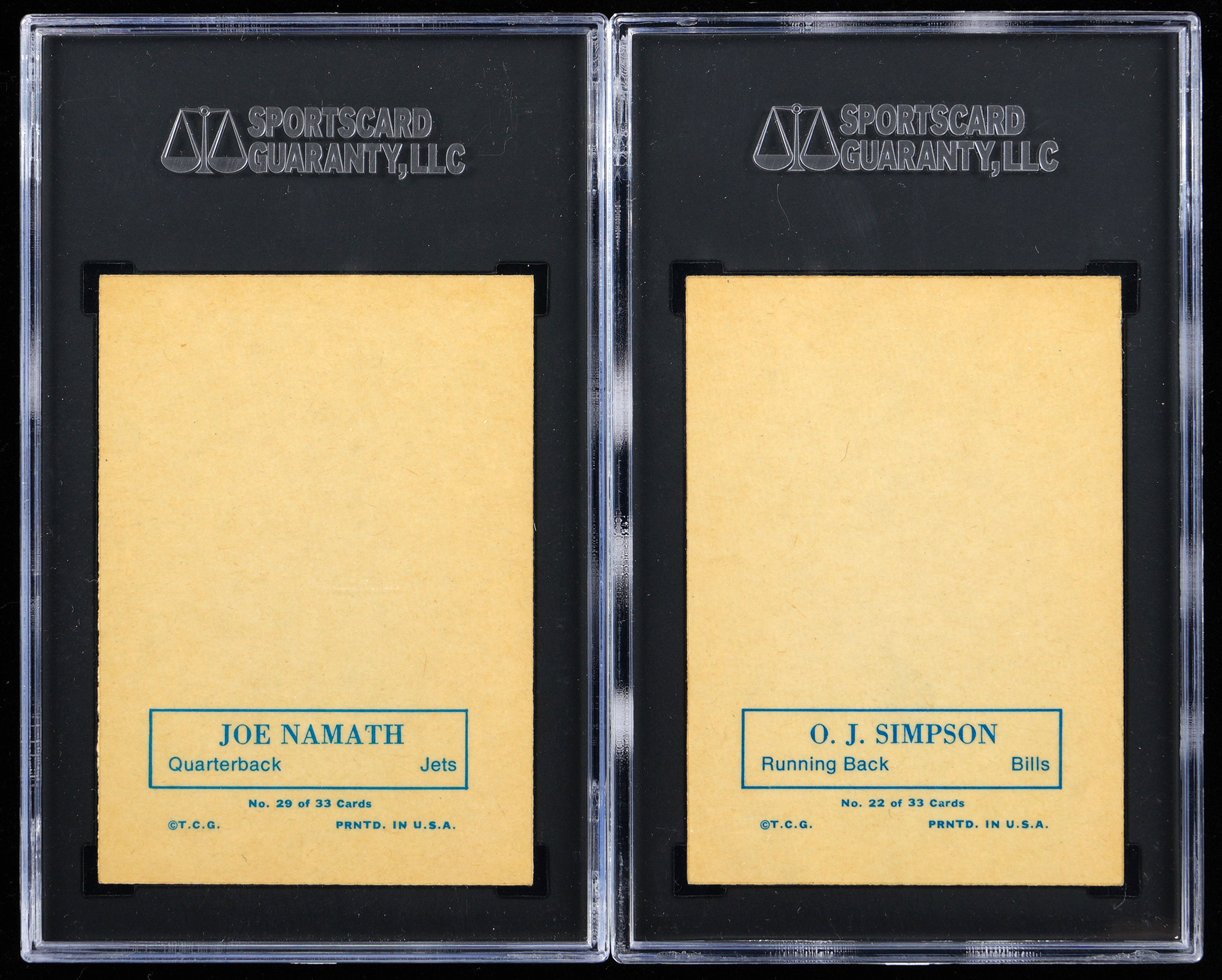 Each graded Authentic by SGC. These glossy square corner proofs were neatly extracted from a larger uncut sheet. Includes: 1.) #22 Simpson RC and 2.) #29 Namath.
