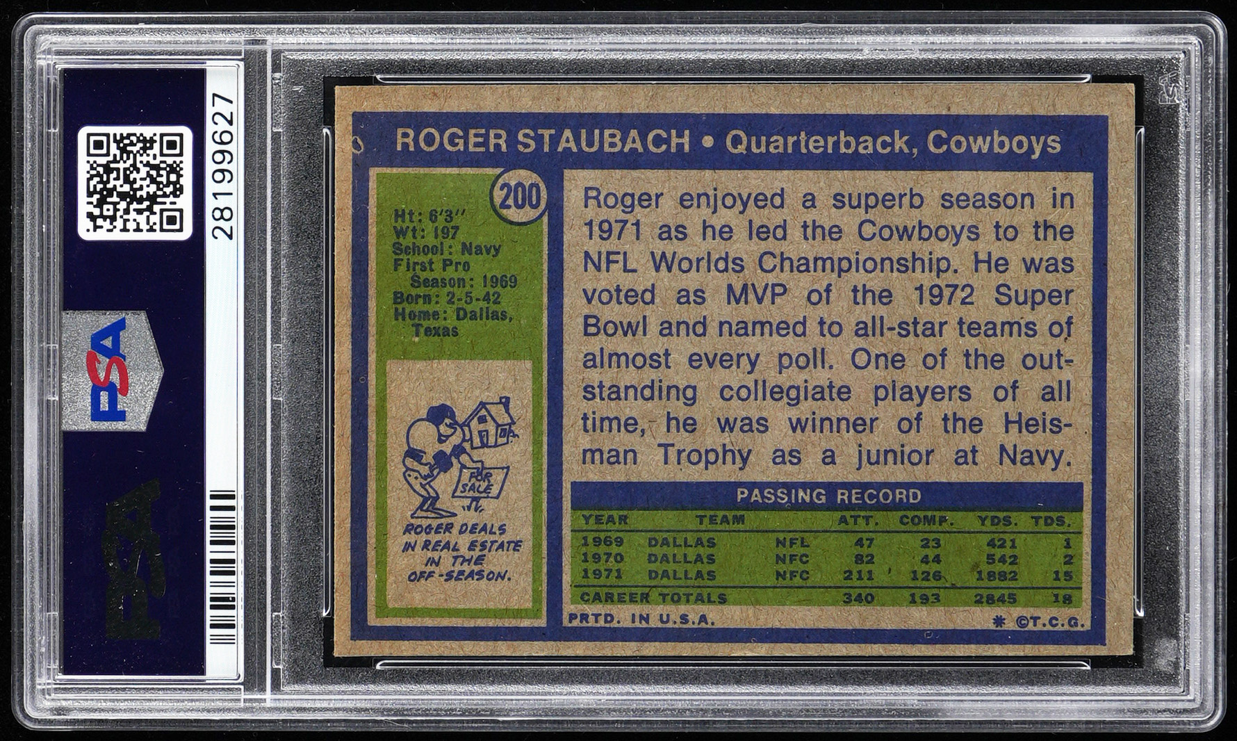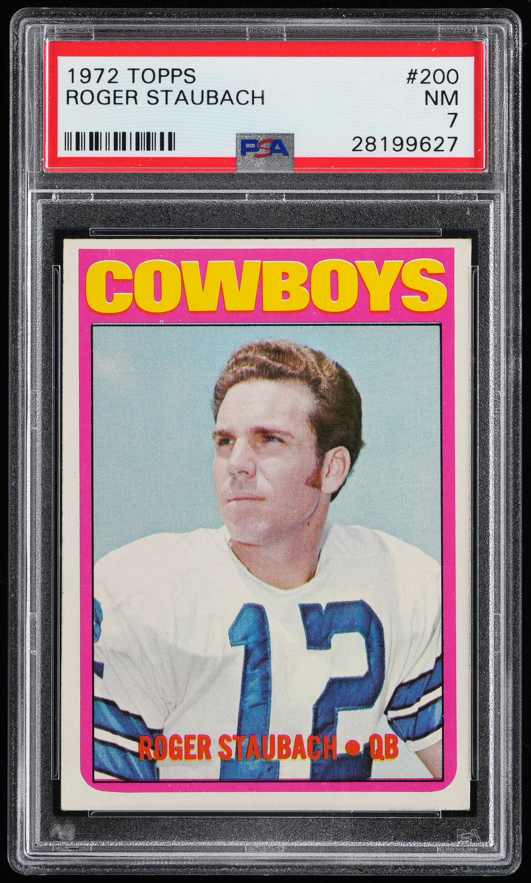 Graded NM 7 by PSA. Blazing 1972 Topps Football #200 Roger Staubach rookie card featuring the Dallas Cowboys Hall of Fame quarterback following his service with the United States Navy.