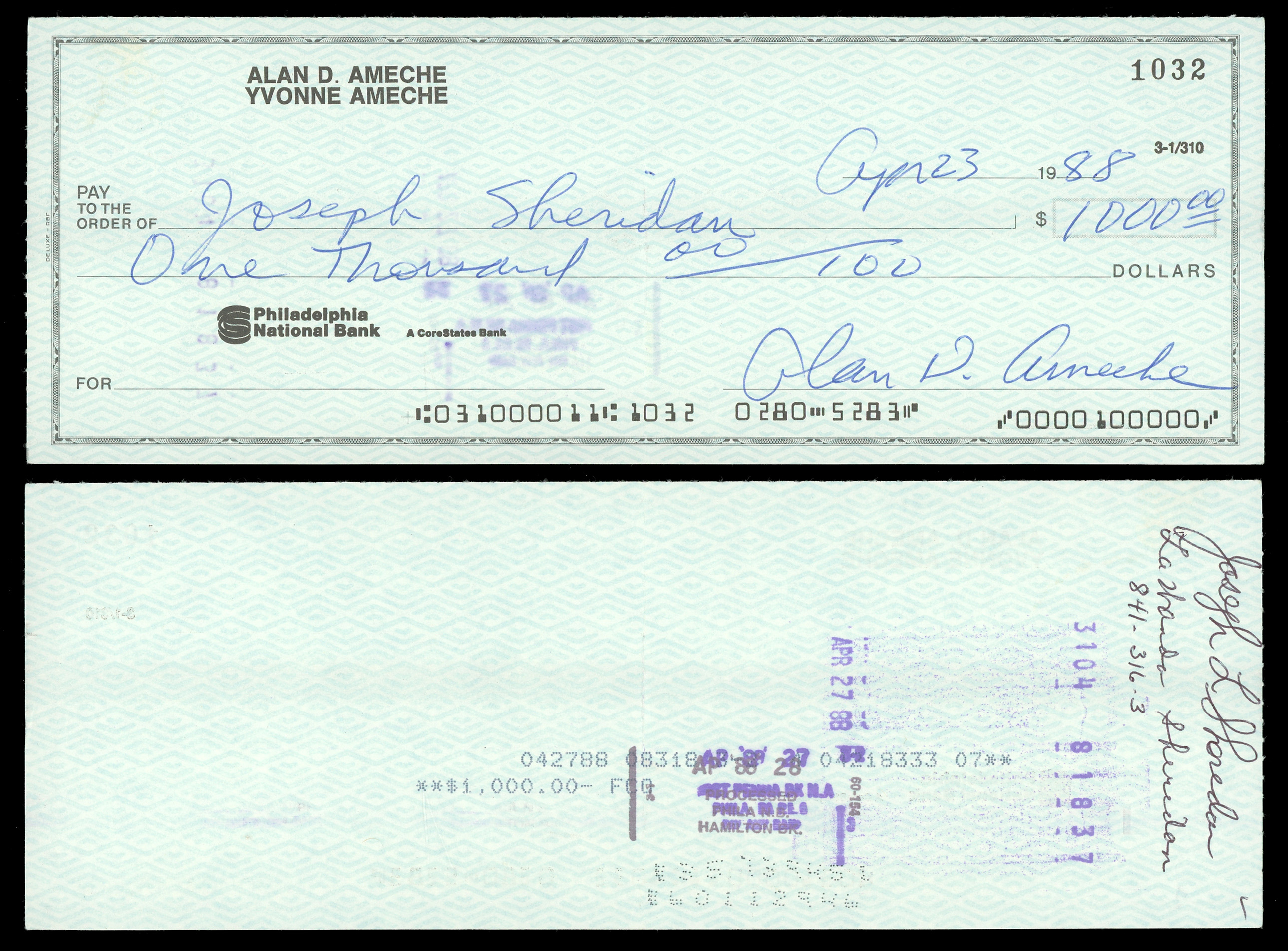 2X NFL champion turned fast food king Alan Ameche serves up a tasty treat, with this signed check. Upon the conclusion of his 1955-1960 NFL career as a running back with the Baltimore Colts, Ameche opened a successful chain of drive-in burger restaurants in the Baltimore region. Ameche's distinct signature on this 4/23/88 personal check, was applied just four months prior to his demise on 8/8/88.