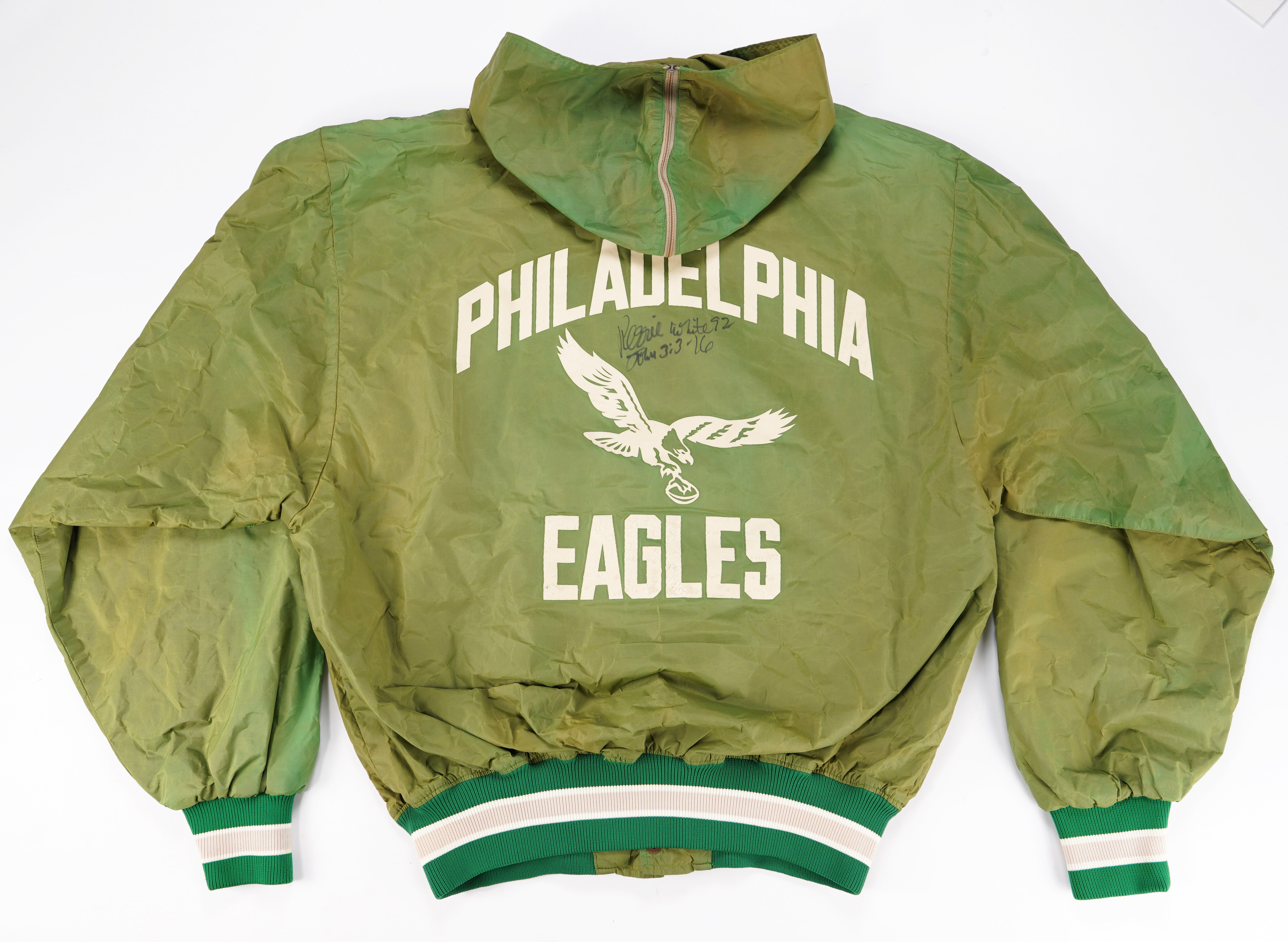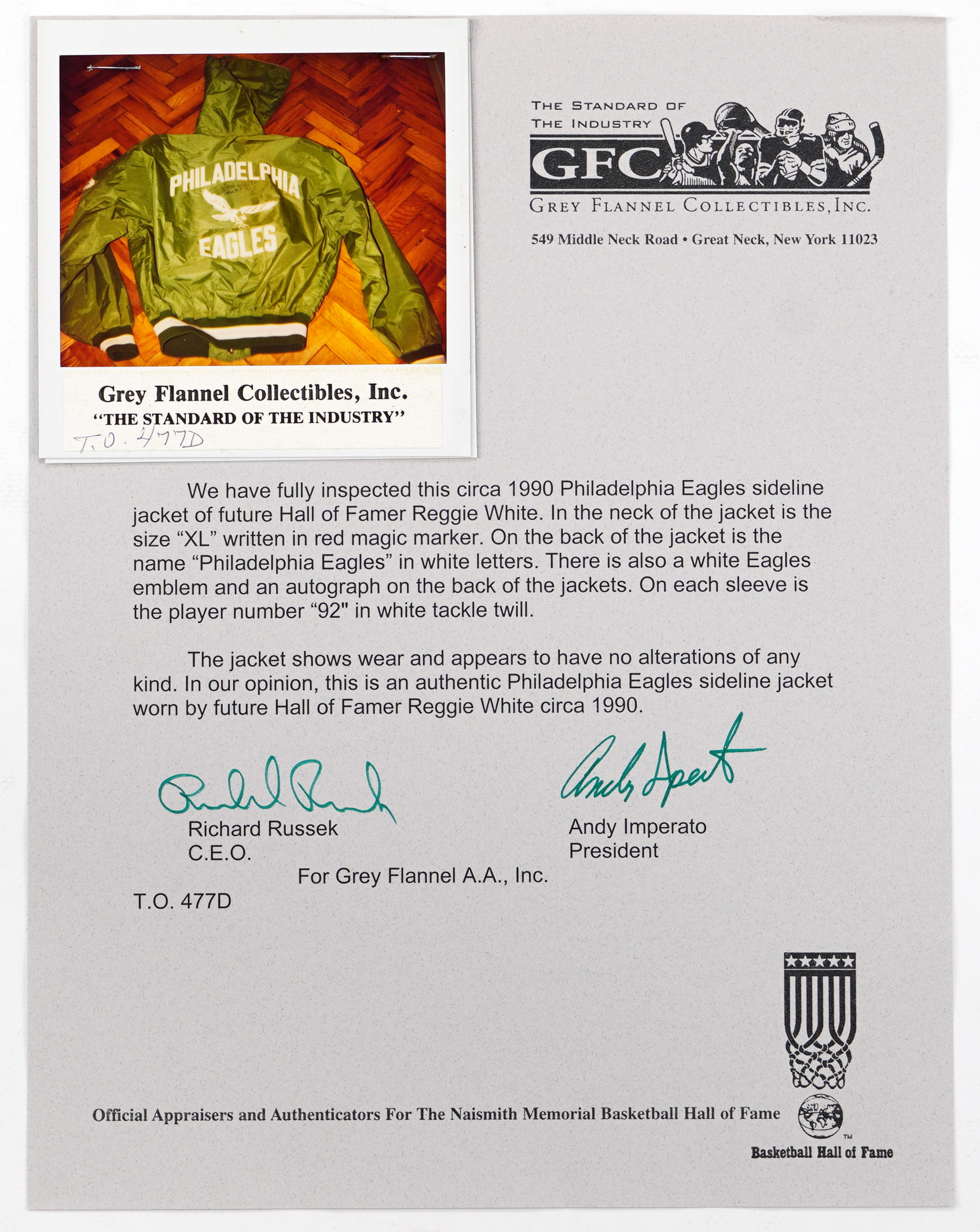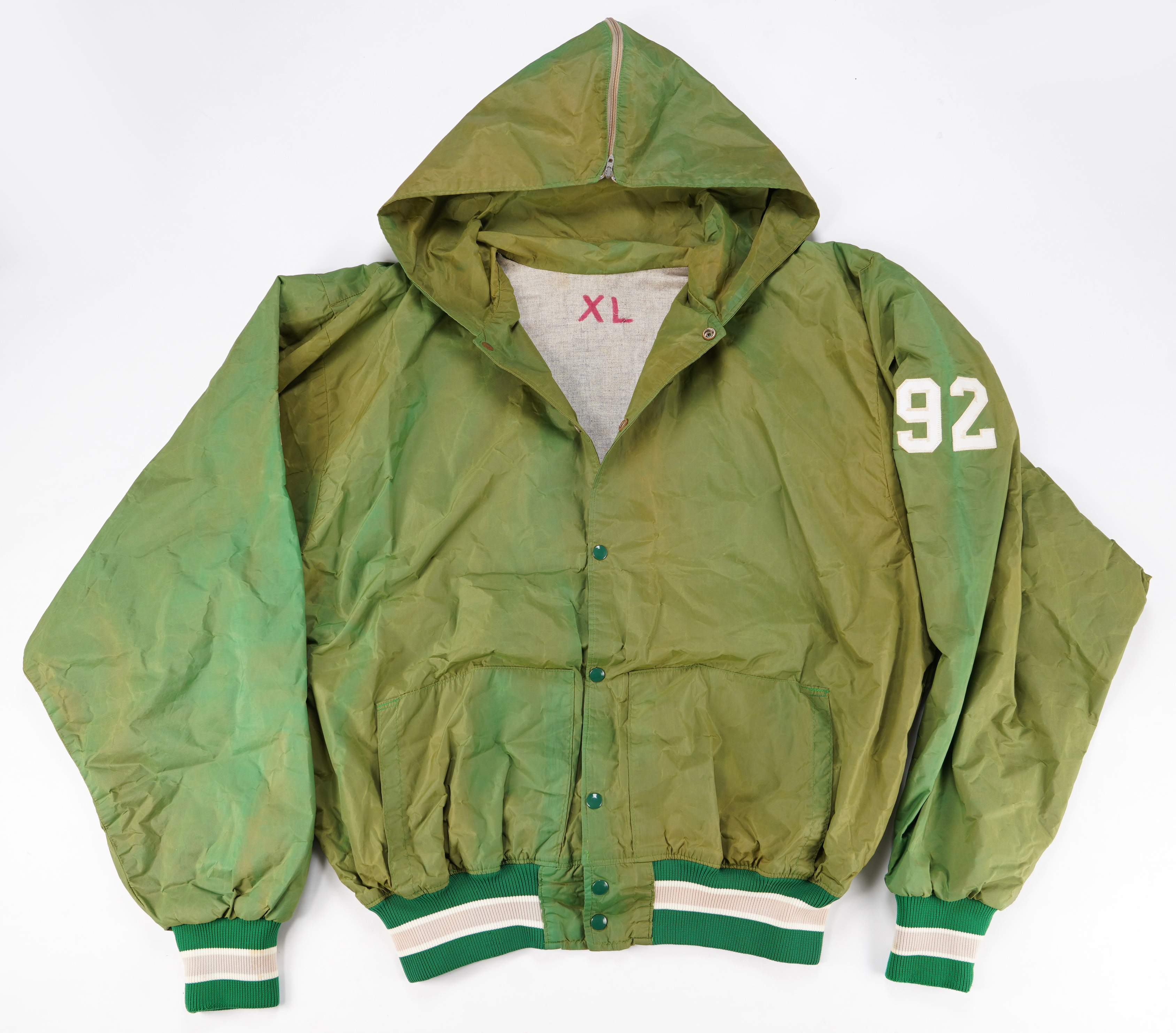 Reggie White is considered by many to be the greatest defensive player of all time. Certainly, he was one of the most awarded players of all time. He earned the nickname “the Minister of Defense” because he went on to become an evangelical minister. This historic jacket shows much wear and it appears to have no alterations of any kind. It comes with a Letter of Authenticity from Grey Flannel Collectibles stating, “This is an authentic Philadelphia Eagles sideline jacket worn by Hall of Famer Reggie White, circa 1990.” The jacket has size XL written in red magic marker and has “Philadelphia Eagles” in white letters on the back.