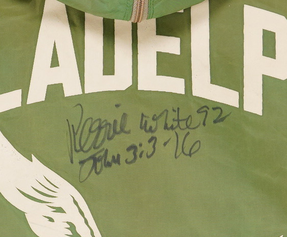 The signature on the back of the jacket is a large, strong “8-9” that reads, “Reggie White 92 - John 3:3-16.” It comes with a Full Letter of Authenticity from James Spence/JSA for the signature.