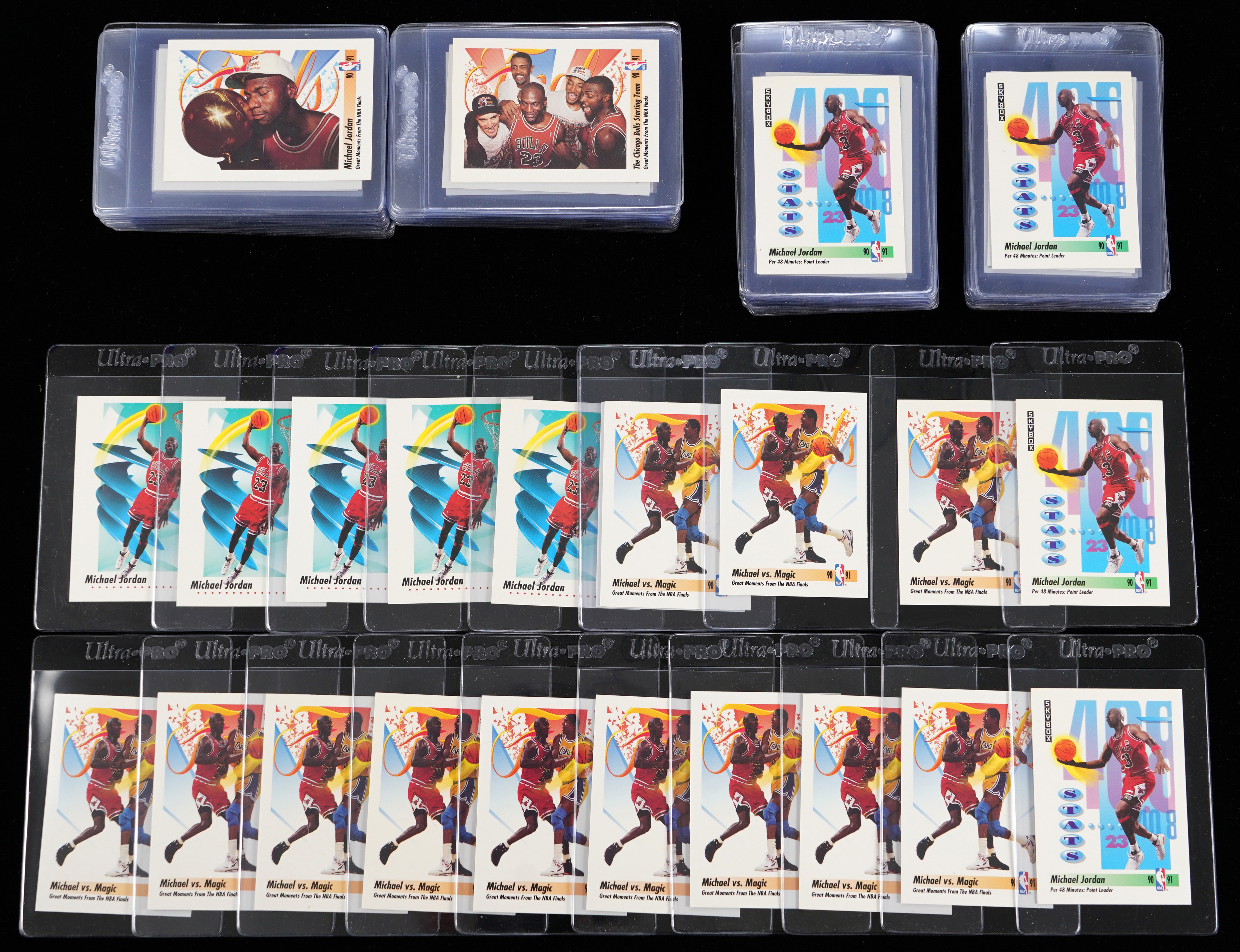 Chicago Bulls Hall of Fame legend Michael Jordan shows all aspects of his legendary game with these (120+) 1991-1992 Skybox singles. This high-grade accumulation includes the following: (5) #39, (20) #307 Point Leaders, (33) #333 with M. Johnson, (30) #334 NBA Finals and (33) #337 Bulls Starting Five.