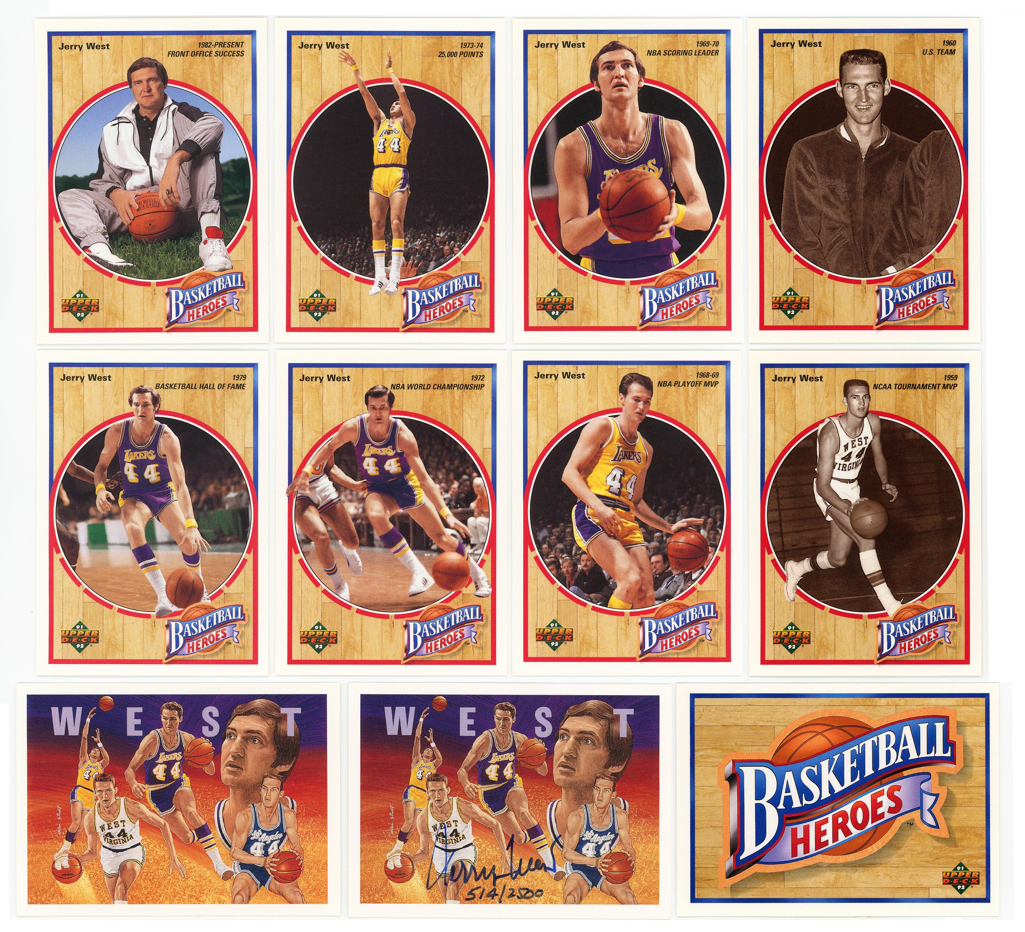 Long before his silhouetted image became incorporated as the NBA logo, Jerry West was a highly drafted, but unproven shooting guard from rural West Virginia. Fifteen seasons and 25,000 points later, “Mr. Clutch” left a Los Angeles Lakers legacy that even the glamour of Tinseltown could not surpass. Celebrate "Zeke from Cabin Creek" with the offered 1991-1992 Upper Deck Basketball Heroes Jerry West complete set of (9) cards. Most importantly, the Hall of Famer penned an additional high-grade insert card in blue Sharpie ("9") that is serially numbered #514/2500. Auction LOA from James Spence/JSA.
