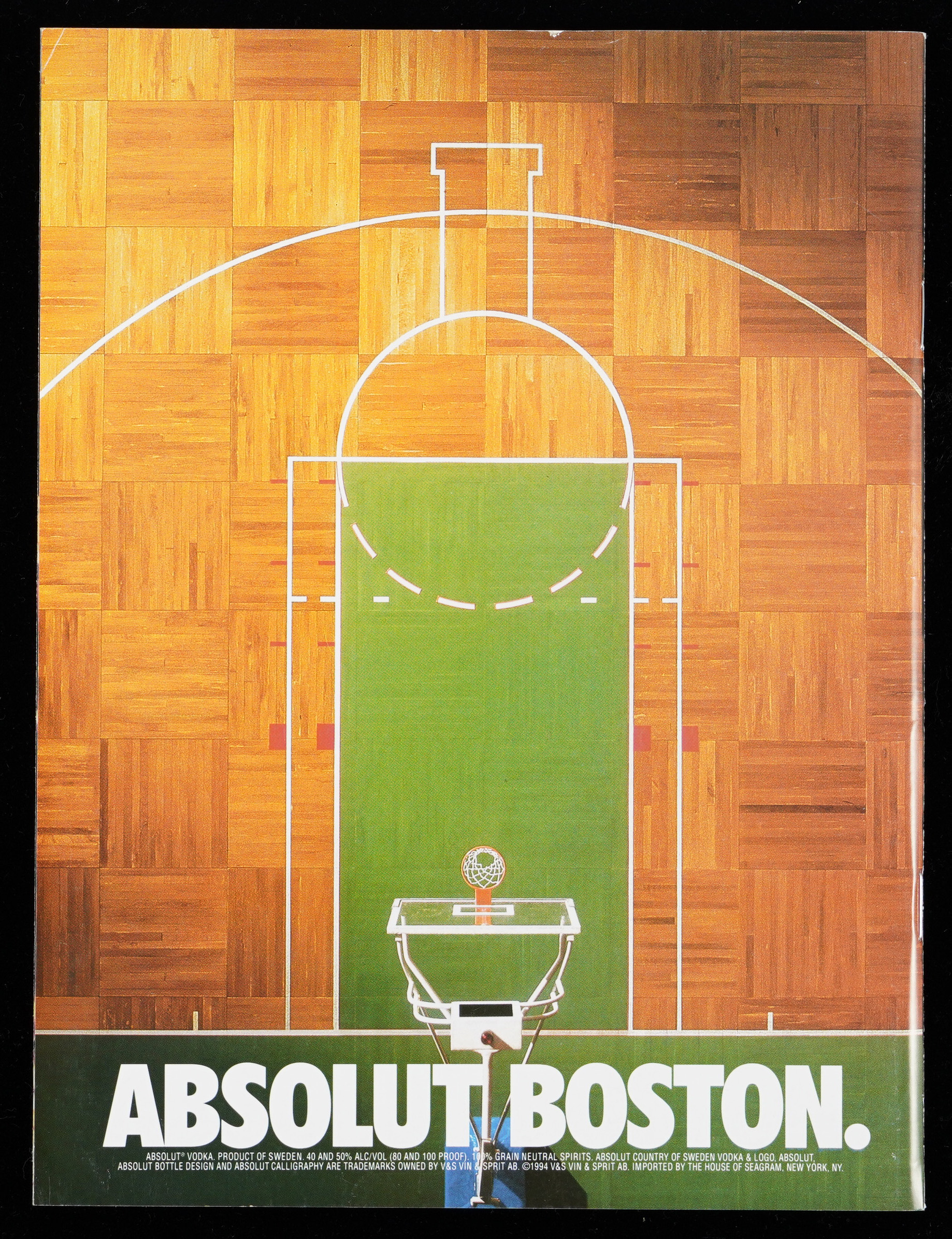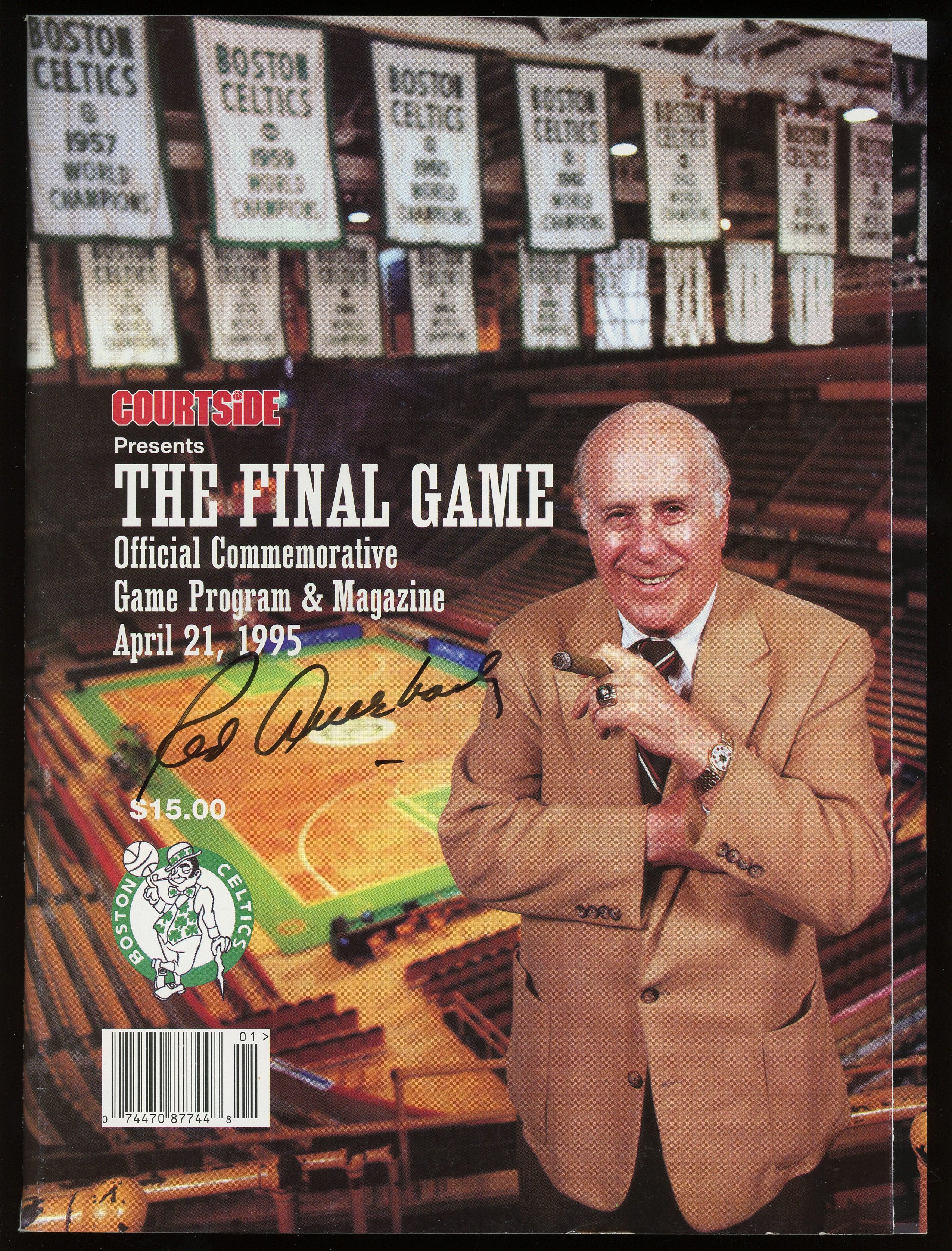 As ever, basketball’s greatest architect “Red” Auerbach is seen with a cigar in hand, on the front cover of this 4/21/95 Boston Celtics program. This commemorative program comes from the Celtics final game at the original Boston Garden arena. In one capacity or another, Auerbach was with a Celtics institution from 1950, until his death in 2006. During his tenure as head coach, general manager, president, and vice chairman, the Celtics won eighteen championships. Many talented players suited up for the NBA’s greatest dynasty, and Auerbach was always moving the pieces around, to keep the winning tradition going at full steam. As the man who built the Celtics dynasty, it's fitting that Auerbach was chosen to appear on the front cover of this commemorative publication. Auerbach has signed on the front, next his photograph, and his stylish signature is a solid application.