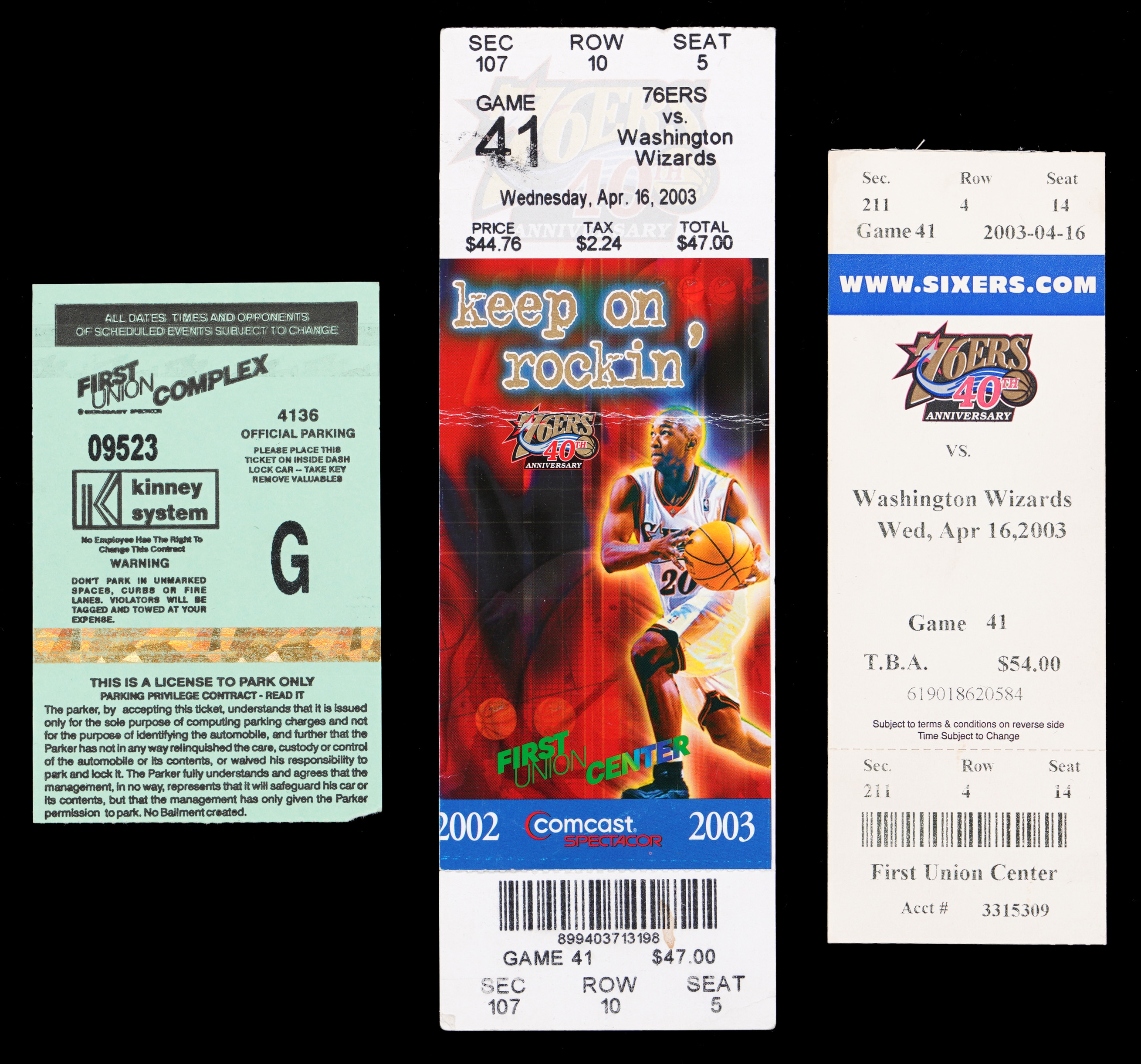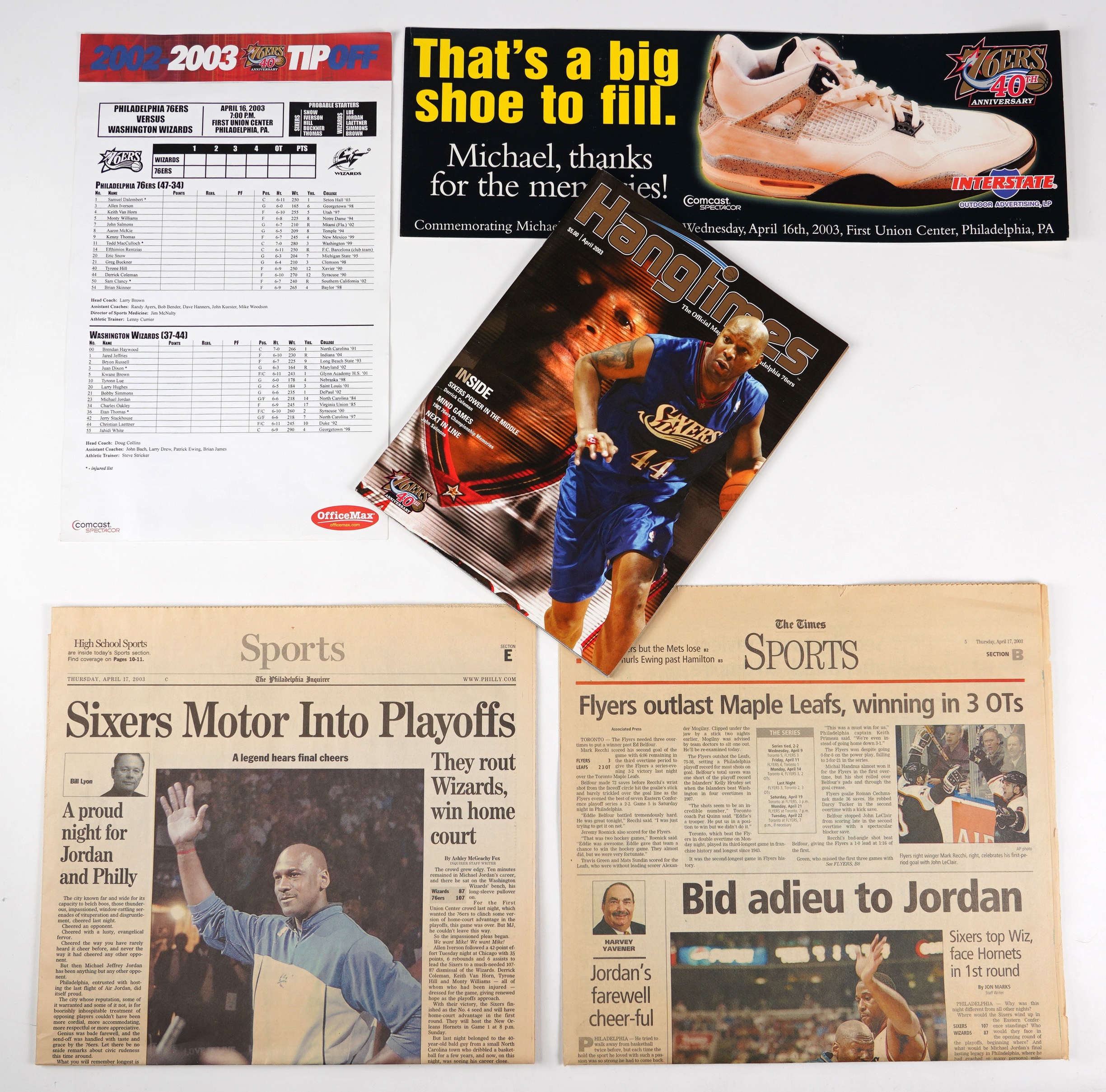 Revisit Michael Jordan’s last hurrah, with this April 16, 2003 final NBA game collection (8). A crowd of 21,257 fans got to bid “His Airness” goodbye, when he suited up for the last game of his glorious career, to face the Philadelphia 76ers at the First Union Center. This assembly of tickets, publications and other related items revolve around Jordan’s historic farewell.