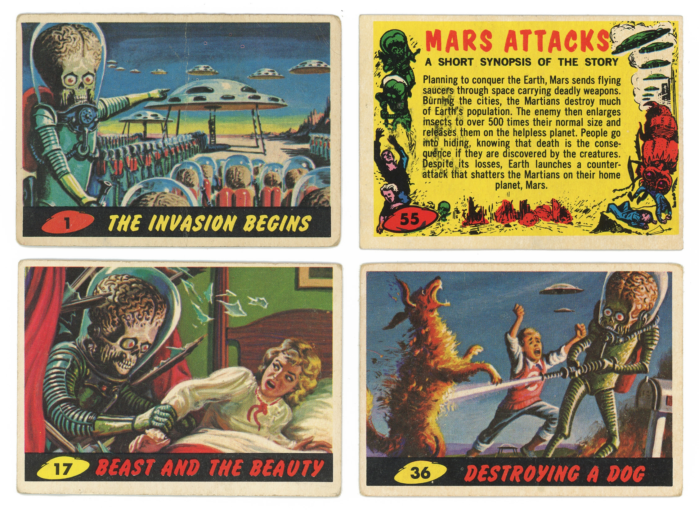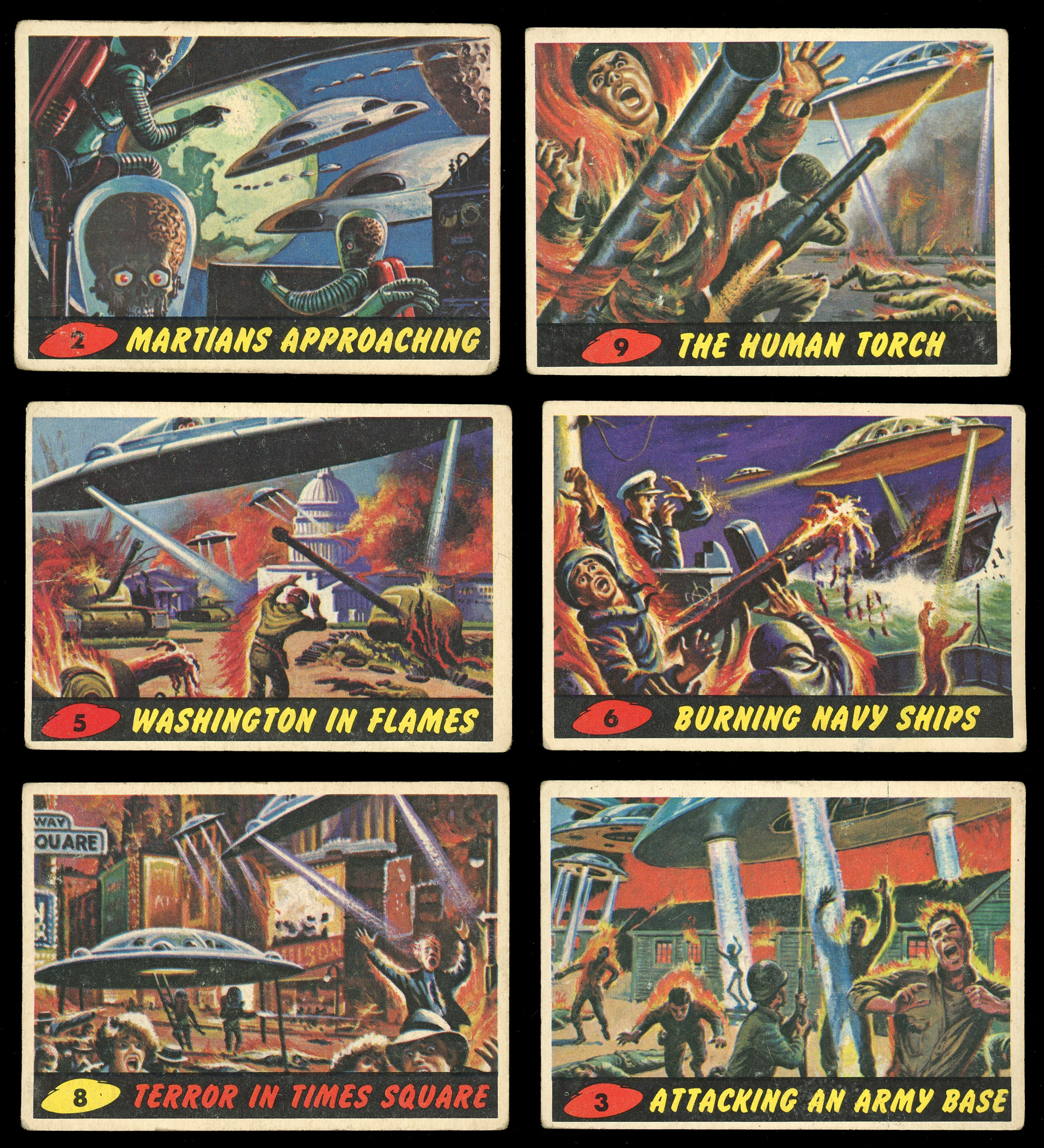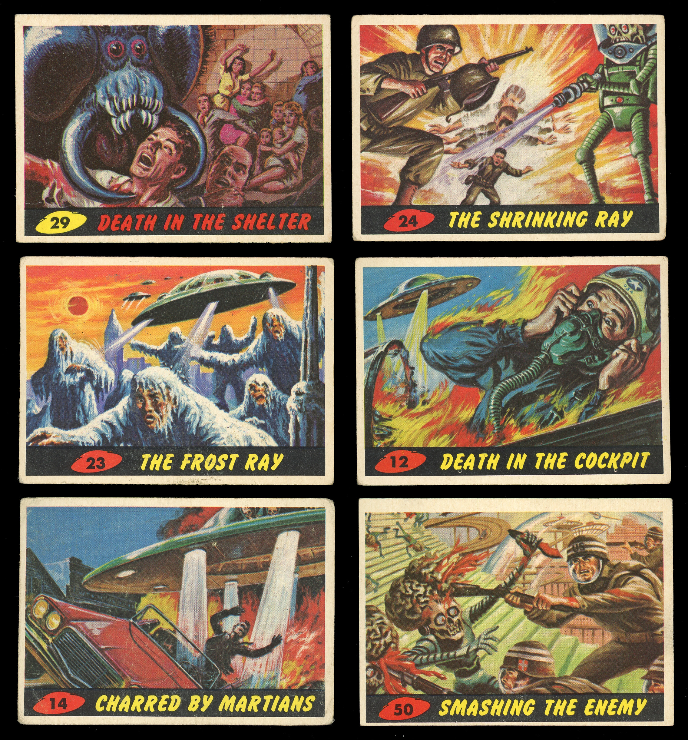 Buckle up for the wildest non-sport card romp ever with this 1962 Topps Mars Attacks near-complete set 54/55. Other non-sport issues have raised a fuss with parents, educators, clerics, and self-righteous media members, while delighting or frightening children, but none have matched the creative mayhem seen in Mars Attacks. Playing out like a cardboard sci-fi flick, this inventive set features a half-dozen cards depicting comely females being molested by bug-eyed, bulb-headed Martians, and it gets worse from there. It starts with the extraterrestrials embarking on their mission of conquest and destruction. Soldiers, civilians, and even a pet are disintegrated by death rays. A human pilot is engulfed in flames, cities are toppled, colossal insects gorge on helpless prey, and finally the earthlings get their heroic payback on their tormentors from space.