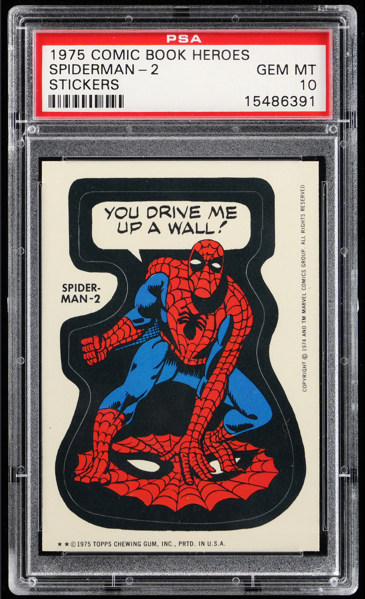 Collectors who demand the finest, set your sights on this 1975 Topps Comic Book Heroes Spiderman-2 sticker. Spotlighting Marvel Comic's leading attraction, this vintage sticker has earned a perfect (GEM MINT 10) rating from leading certification service PSA. Graced with dynamic artwork, this pristine example is as good as it gets, ranking as "1 of 21" at PSA's top grading tier, out of a total population of 155 examples of this colorful super-hero sticker.