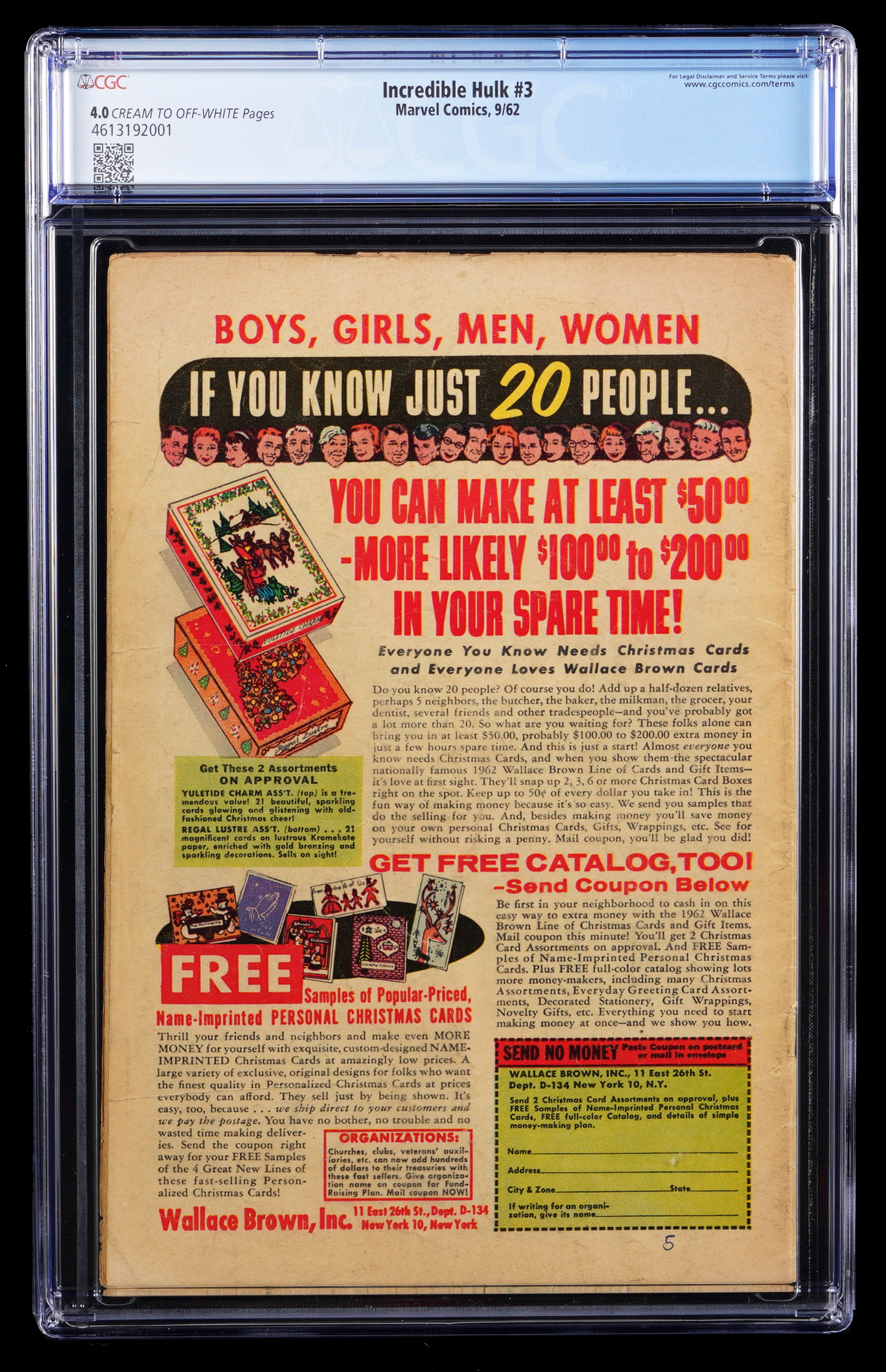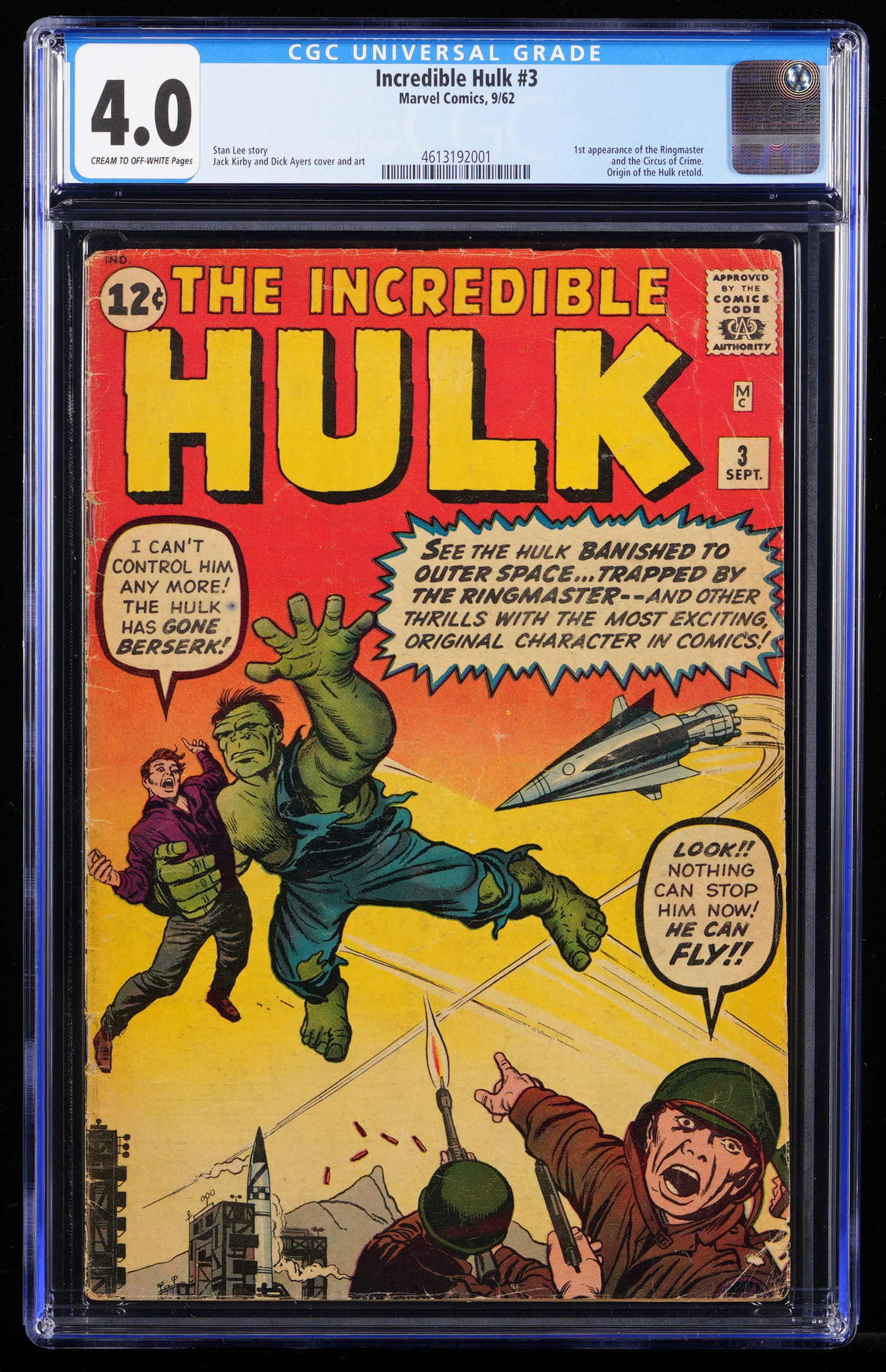 The thrills of the big top took an evil turn, with this 9/62 Marvel The Incredible Hulk #3 issue. One of the original first six Hulk issues published before the big green guy wandered off into other titles, this Silver Age classic marks the debut of the Ringmaster and the Circus of Crime. It was far from fun and games with this twisted troupe, as the price of the show left you with nothing but lint in your pockets. Donning a hypnosis-wave generator hat, the Ringmaster sent victims into a trance, leaving them vulnerable to his minions, the Human Cannonball, the Clown, Bruto the Strongman, the Great Gambonnos, and Princess Python. Our hero the Hulk broke free of Ringmaster's power, putting his crime career on ice. This nicely preserved comic has earned a respectable (4.0, Cream to Off-White Pages) rating from best in the grading business, CGC. Label notes are "Stan Lee story, Jack Kirby and Dick Ayers cover and art. 1st appearance of the Ringmaster and the Circus of Crime. Origin of the Hulk retold.".