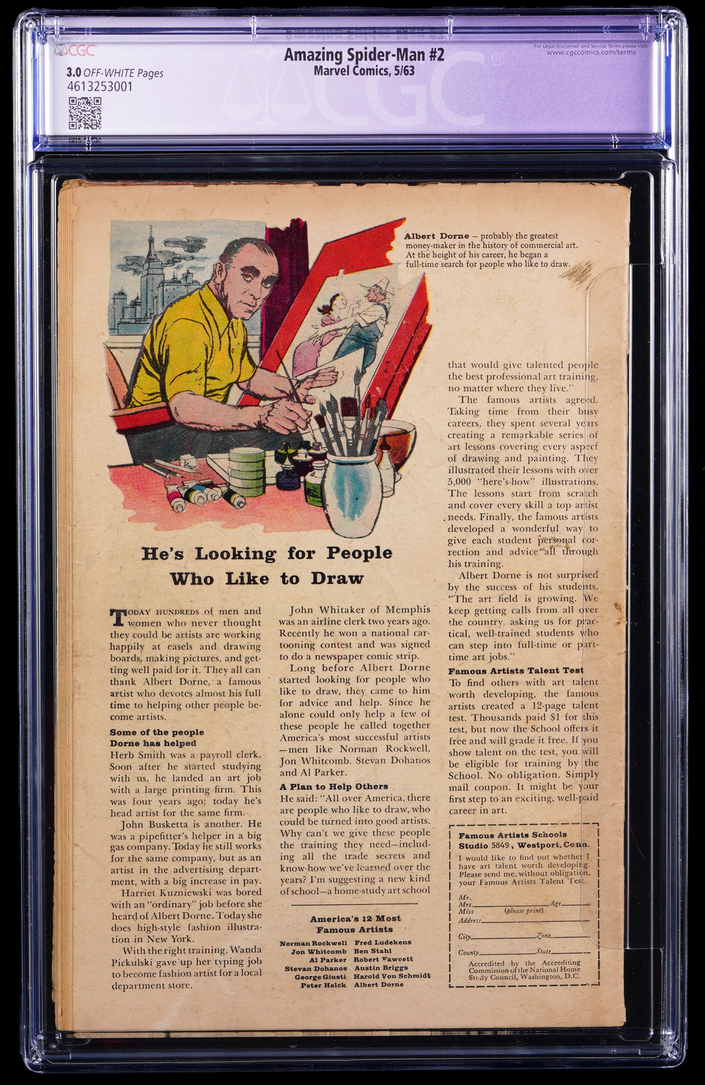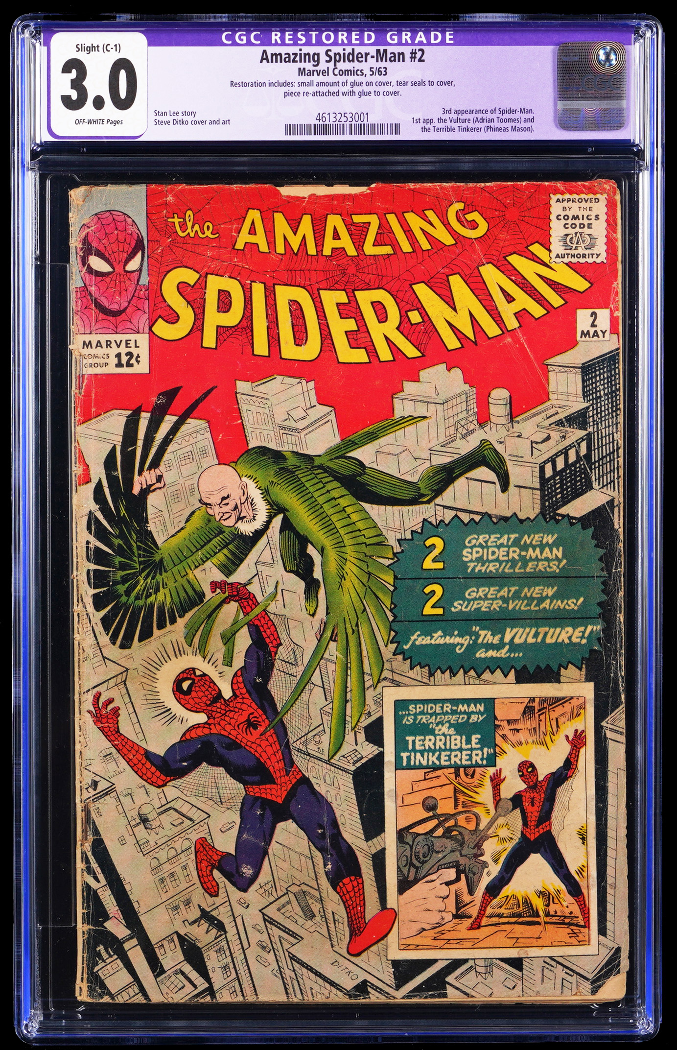 A strange bird gets his feathers plucked in this 5/63 Marvel Amazing Spider-Man #2 issue. Winged nightmare the Vulture made his first appearance in this Silver Age thriller, which also saw high schooler Peter Parker/Spider-Man take on the Terrible Tinkerer, also making his debut in this early Spidey comic. A fresh-faced hero battling two new super-villains makes this vintage comic a classic, and really, all early Amazing Spider-Man issues pack a lot of collecting clout. So make sure you're in on the action for this ASM #2 issue, which is CGC graded 3.0, Off-White Pages, Restored Slight C-1. Label notes are "Piece re-attached with glue to cover. Restoration includes: small amount of glue on cover, tear seals to cover. Stan Lee story, Steve Ditko cover and art. 3rd appearance of Spider-Man. 1st app. the Vulture (Adrian Toomes) and the Terrible Tinkerer (Phineas Mason)."