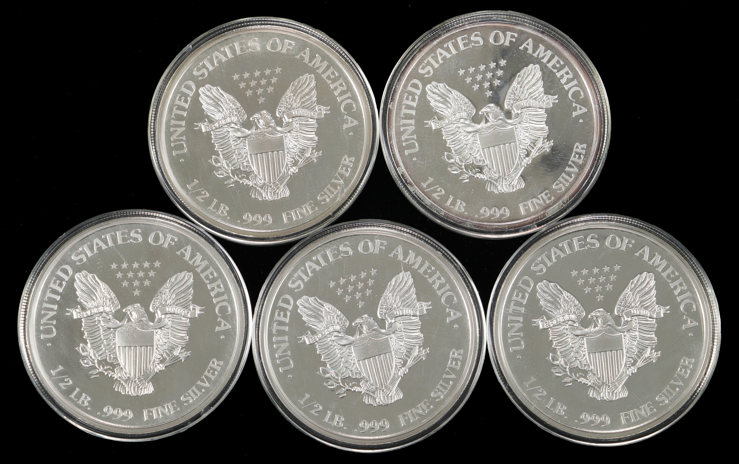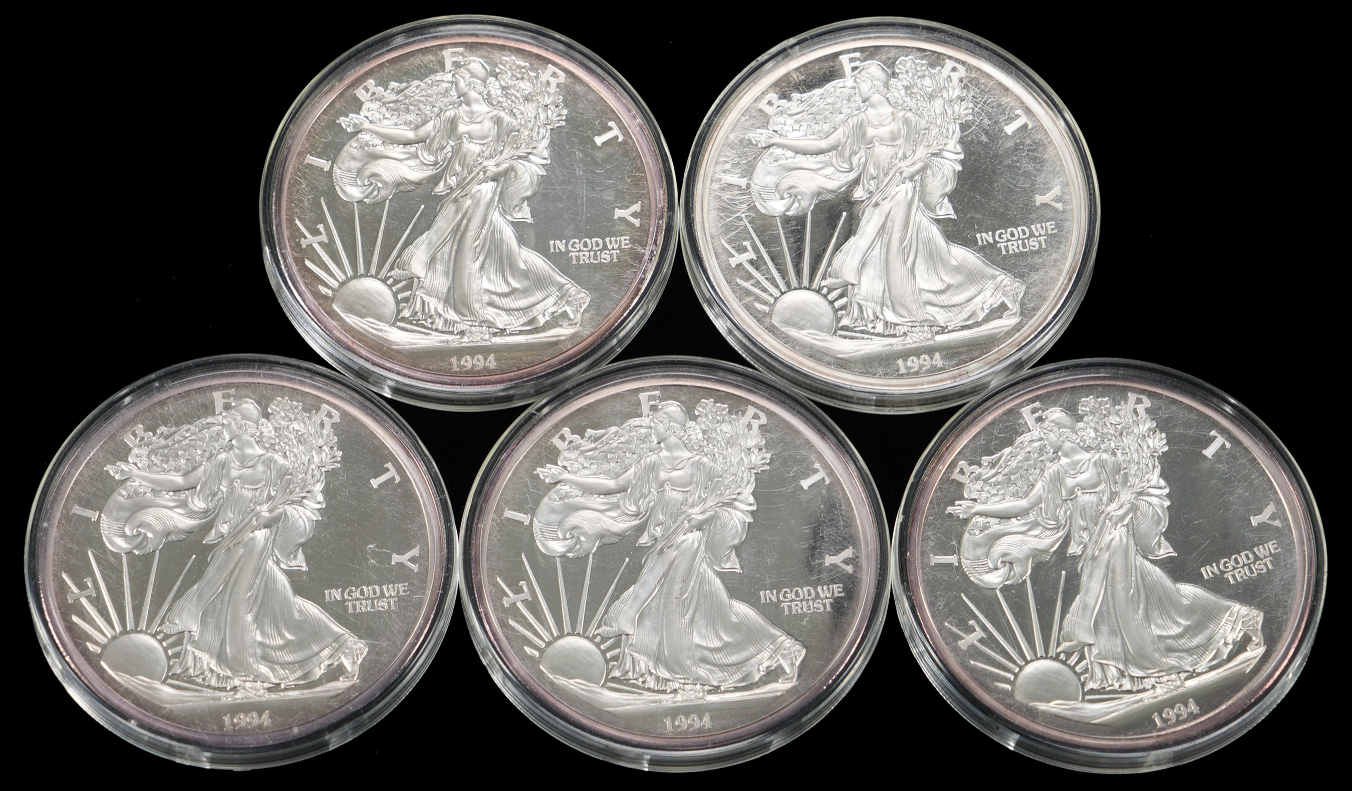 Silver comes in hot and heavy with this hefty bundle of five 1994 Walking Liberty 1/2-pound pure silver bullion proof rounds. The design employed for these colossal rounds was first seen on the 1916-1947 Walking Liberty half dollar series. After four decades out of the public eye, this design was resurrected in 1986 for $1 American Eagle silver bullion coin series. Here the classic design is super-sized for these proof strike .999 fine silver rounds, which have a diameter of 3-1/2." Reported as produced by the National Collectors Mint, these oversized coins present in pristine state, with deference to light-purple toning around the rims. Silver seems poised for a run at its all-time high in value, and if it gets there, these beauties are going along for the ride.