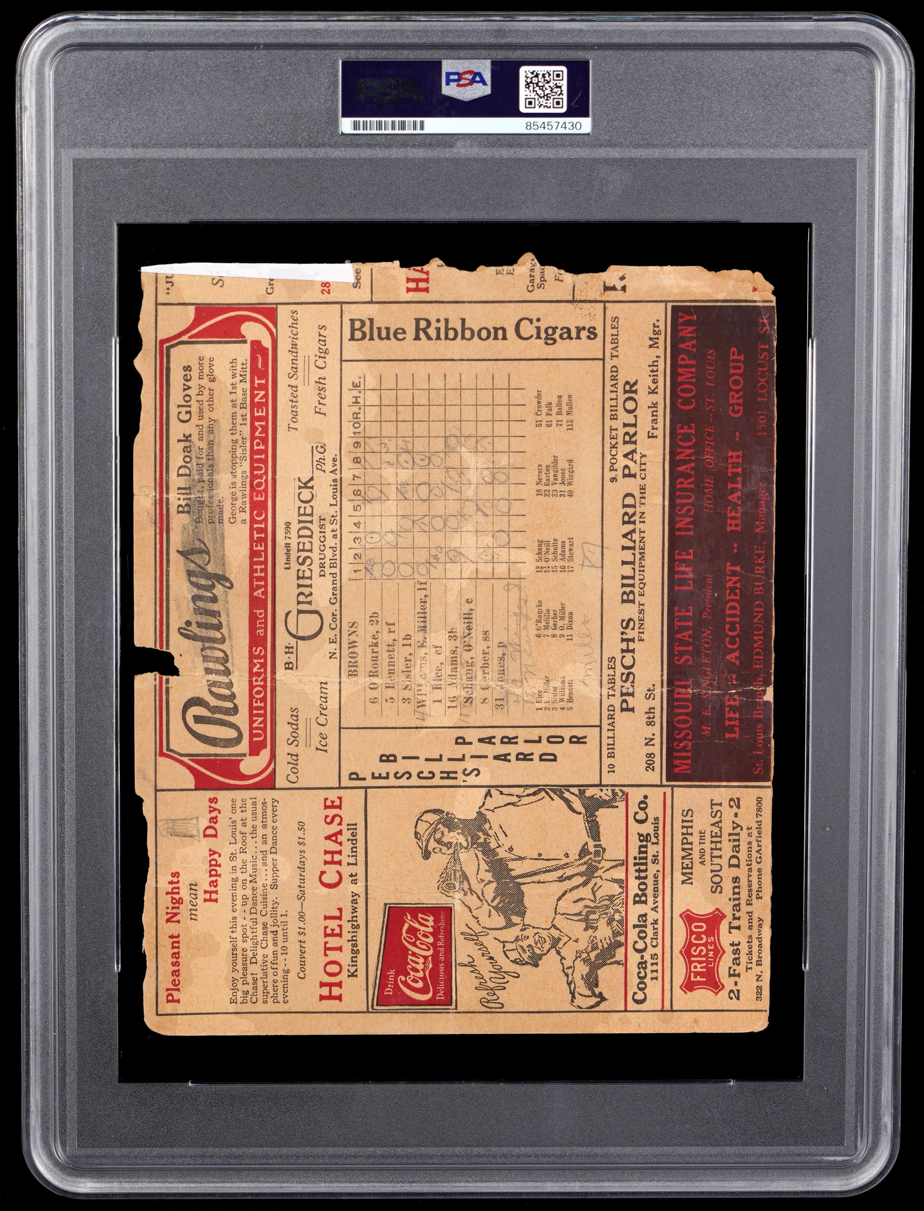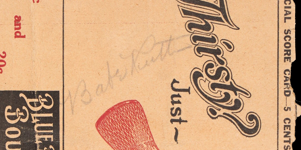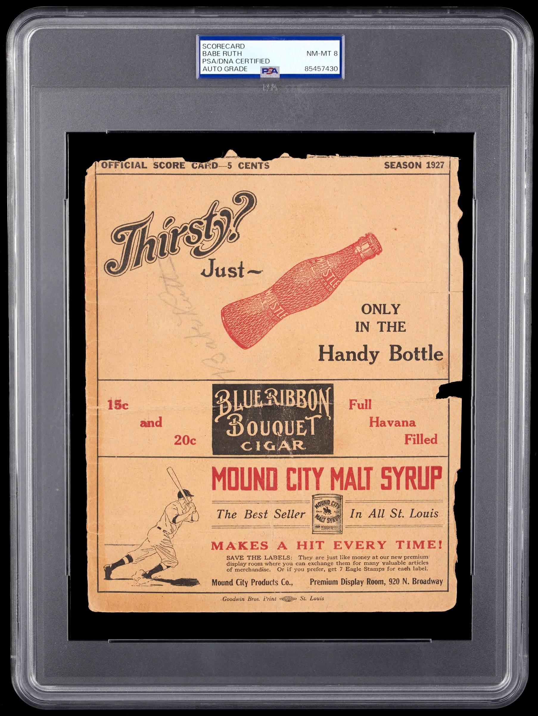 From one of the greatest seasons in baseball history comes this partial scorecard signed by arguably the greatest player of all time. The immortal Babe Ruth was at his peak when he boldly signed this July 18, 1927 St. Louis Browns game day souvenir. The "Sultan of Swat" broke his own single season home run record in 1927, blasting a total of 60 four-baggers. Renowned for their fearsome "Murderers' Row" lineup and a rock solid pitching staff, the '27 Yankees racked up an incredible record of 110-44-1 during the regular season, and then steamrolled the Pittsburgh Pirates in a World Series sweep. Ruth has signed over the cream background at top-left of this front cover only scorecard section, and PSA/DNA has seen fit to rate his treasured signature NM-MT 8. Ruth went 1 for 4 with a walk on the day, and teammate Lou Gehrig hit a 3-run homer in the top of the 8th inning. For the opposition, George Sisler belted a grand slam in the bottom of the 9th. It was too little, too late, however, as the Yankees prevailed by a score of 10-6.