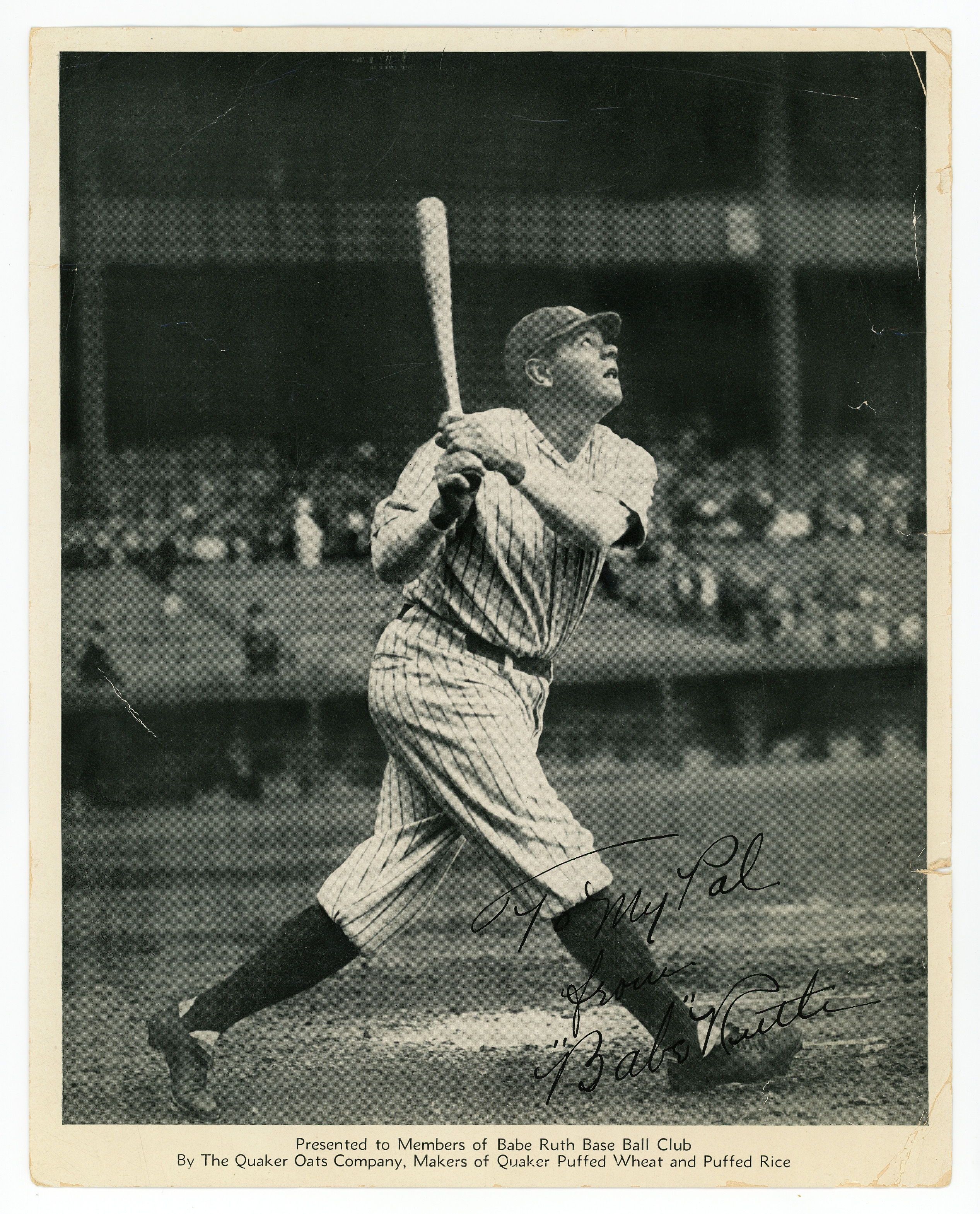 As he did so often during his remarkable career, "Babe" Ruth gazes skyward in this 1934 Quaker Oats premium, as he follows the trajectory of a rocket he just launched into the bleachers. A facsimile of Ruth's signature is printed at bottom-right, and the Quaker Oats credit is located on the bottom border of this 8" x 10" photograph. Considerable wear is evident, including small tears on the right edge, however the image area of Ruth in follow through has avoided most of the attrition.