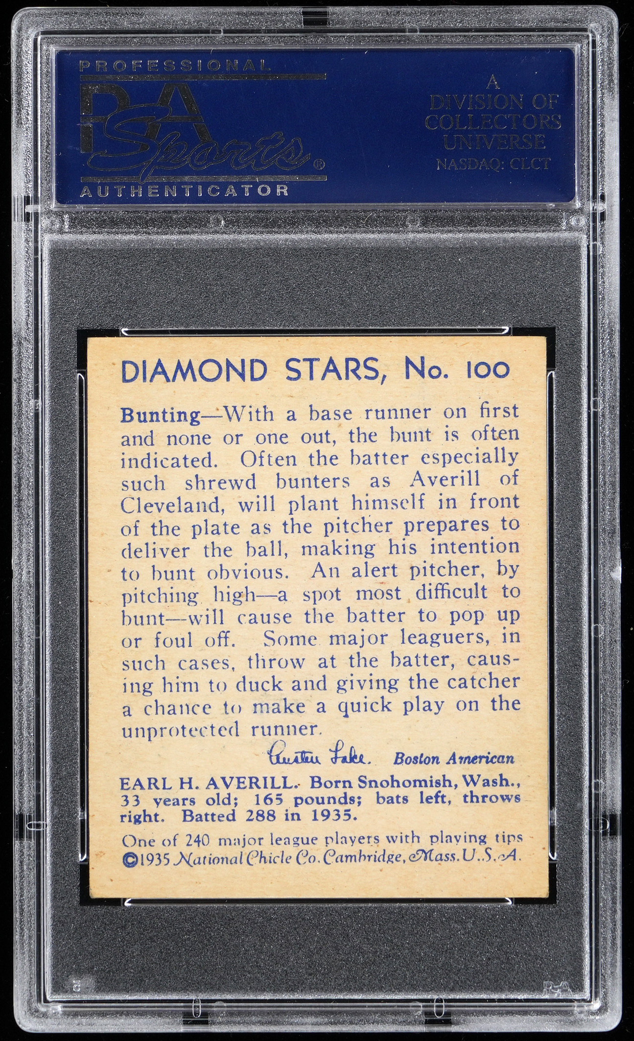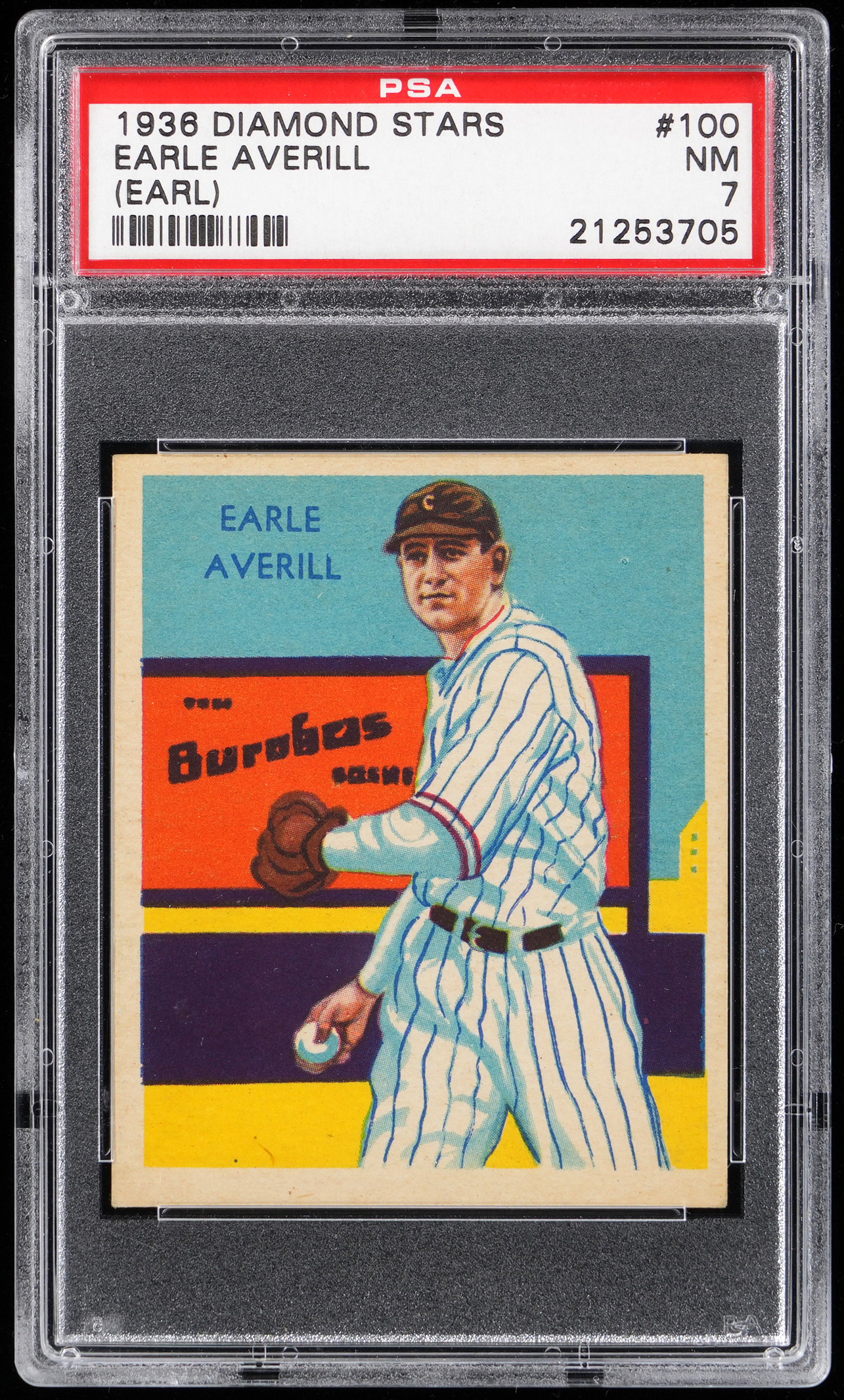 Graded NM 7 by PSA. Cleveland Indians Hall of Fame outfielder Earl Averill. This tough high number is part of a 1934-1936 Diamond Stars PSA graded near set break available throughout this auction.