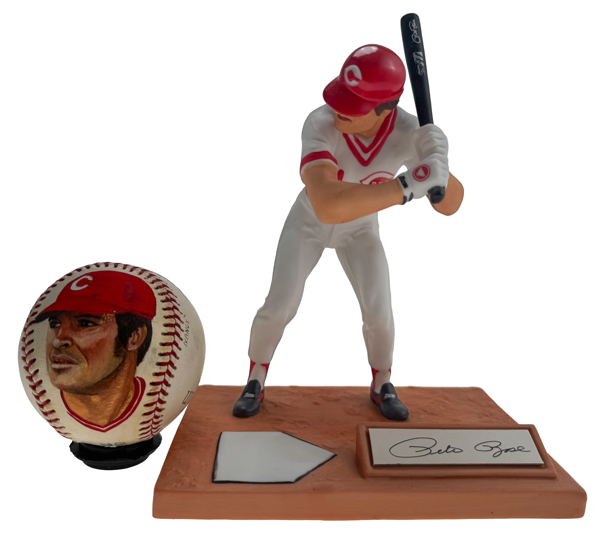 The lineup cards, each of which measure 5.25 x 7 inches, are the top copy retained by the Padres and the carbon copy exchanged from the Reds. Each is neatly filled out by the respective manager, which in the case of the Cincinnati Reds was Pete Rose himself. His signature appears in carbon copy at the bottom of the lineup card. Familiar names are present on each side. Gwynn and Garvey started for the Padres while Rose bat second and Concepcion sixth for the Reds. Also included is a full ticket to the game as well as a Pete Rose signed portrait baseball and a small figurine of Rose in a swinging pose. This is an incredible offering, made public for the first time ever, dating from one of baseball's most iconic records! Total: 5 items (2 lineup cards, 1 ticket, 1 baseball, 1 figurine). The size/weight of this item requires that there will be an additional shipping charge for this lot.