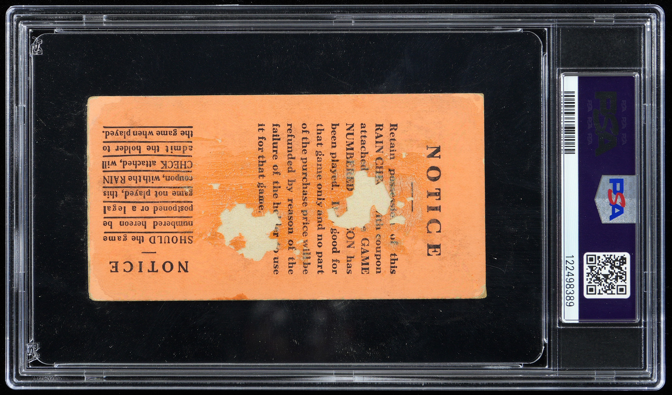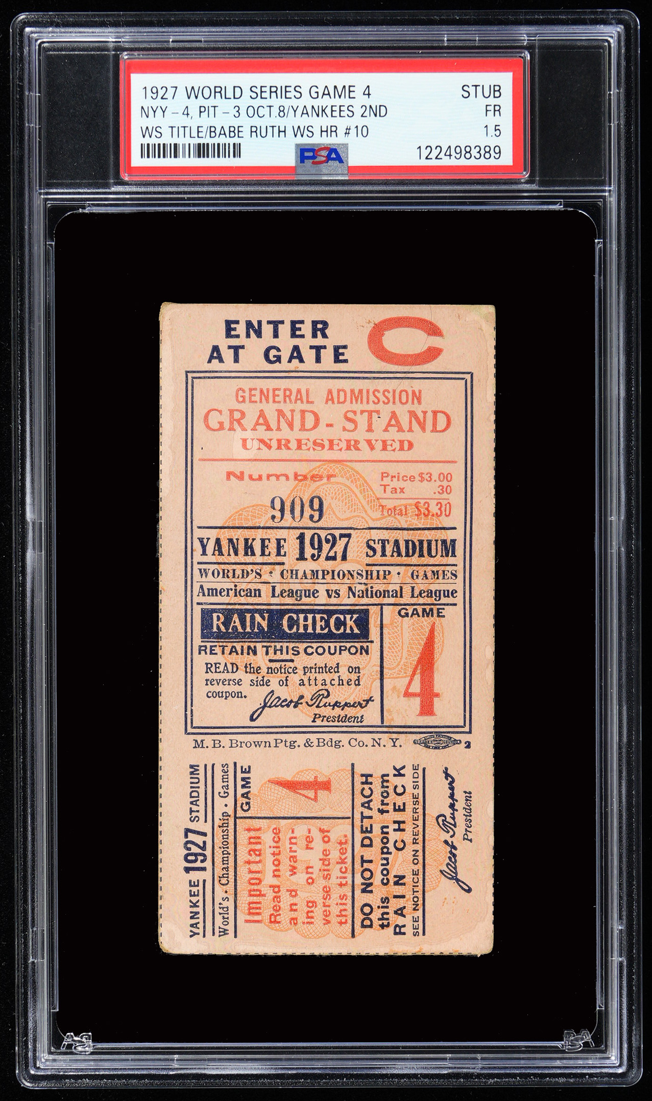 One of the greatest teams in baseball history put the crowning touch on a truly memorable season the day this 1927 World Series Game 4 ticket stub was issued. Played at Yankee Stadium on October 8, 1927, this game saw the Yankees complete a sweep of the Pittsburgh Pirates, to earn the second of their record 27 World Series championships. Legendary slugger Babe Ruth hit the 10th World Series home run of his career in this game, which ended with Earle Combs scoring on a wild pitch in the bottom of the ninth inning. This is the only time a World Series ended on a wild pitch, and it’s ironic that a lineup known as “Murderer’s Row” won in such fashion. PSA had graded this high profile stub FR 1.5.