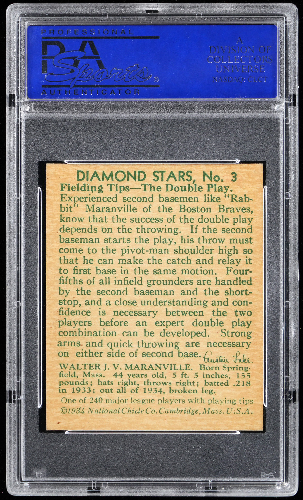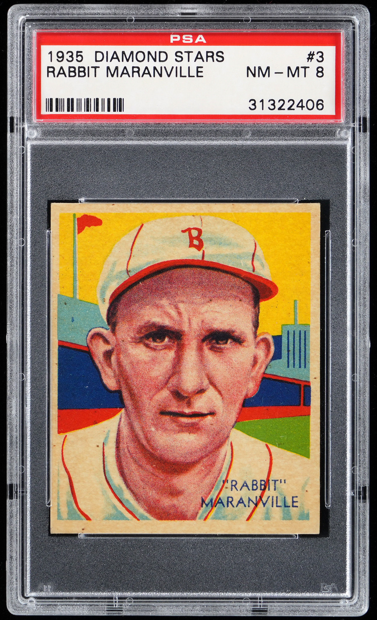 Graded NM-MT 8 by PSA. Hop to the offered 1934-1936 Diamond Stars #3 gum card of Boston Braves Hall of Famer Walter "Rabbit" Maranville. A lower population high-grade portrait that ranks in the upper 8% of all similar copies judged by the authenticator with one higher. Part of a 1934-1936 Diamond Stars PSA graded near set break available throughout this auction.