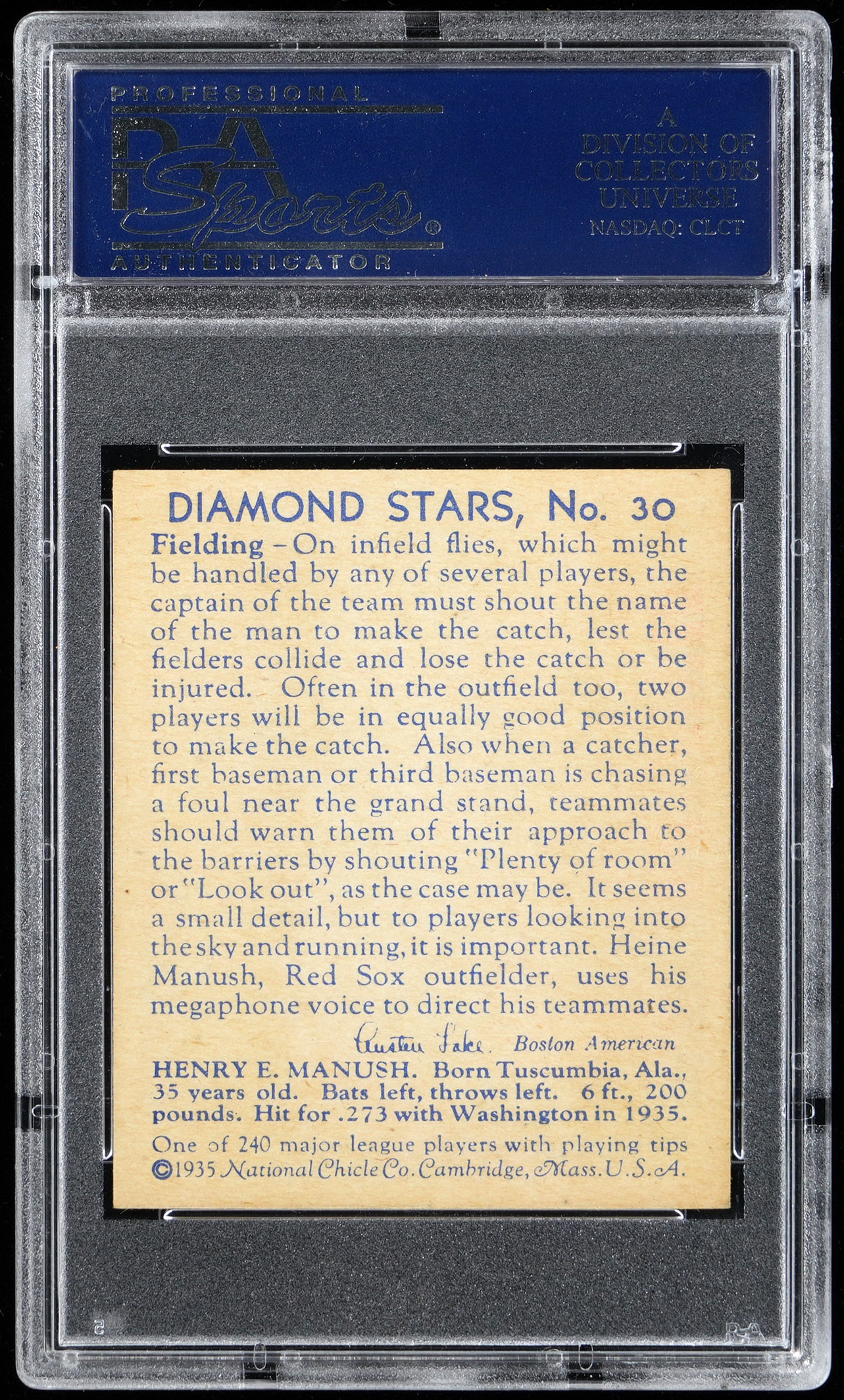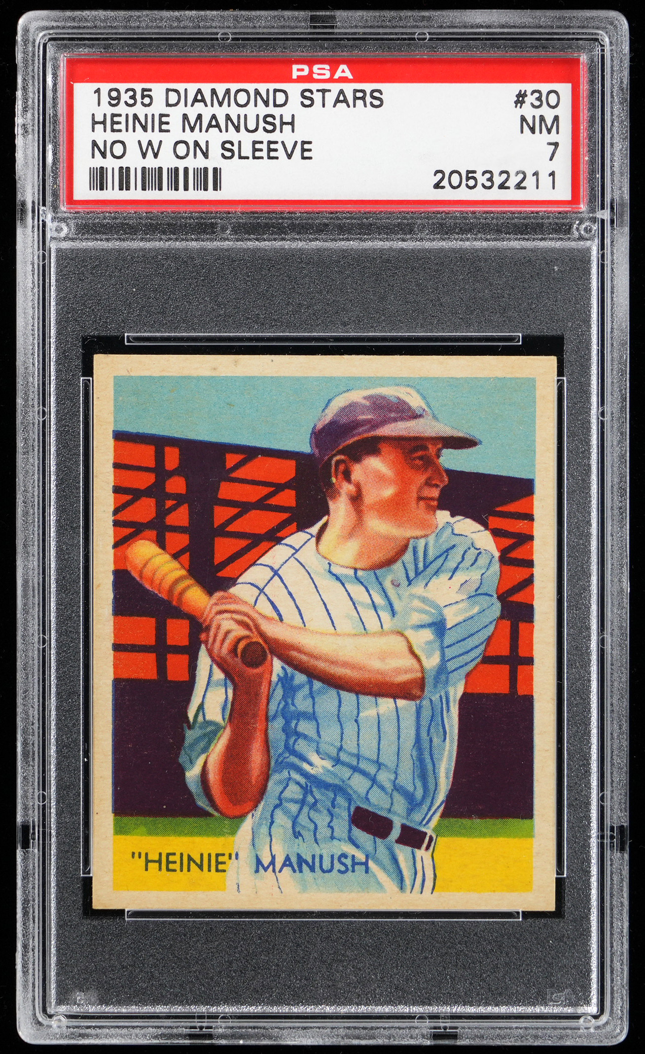 Graded NM 7 by PSA. Boston Red Sox Hall of Famer Henry "Heinie" Manush. Only 16 total copies of this "No W on Sleeve" variation have been evaluated by the grading service with the offered example surviving as 1 of 2 at the grading level with none higher! The dated 1935 blue back (probably released in 1936) comes on the heels of a December 1935 deal in which the star outfielder was shipped from the Washington Senators to Beantown. Part of a 1934-1936 Diamond Stars PSA graded near set break available throughout this auction.