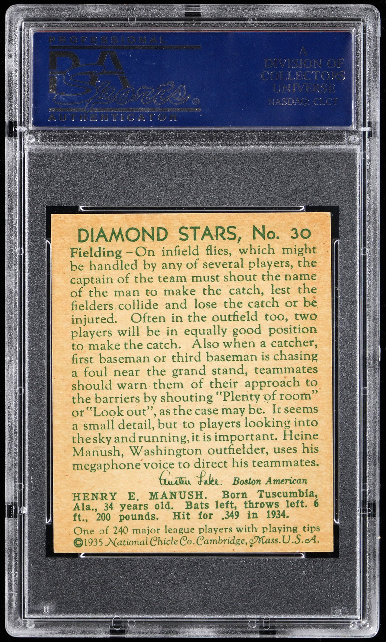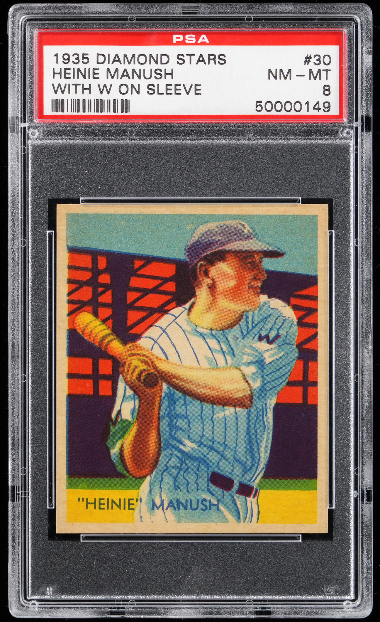 Graded NM-MT 8 by PSA. Washington Senators Hall of Fame outfielder Henry (Heinie) Manush. This beautifully centered "With "W" on Sleeve" version ranks in the upper 7% of all similar copies of the player/variation combination judged by the authenticator. Part of a 1934-1936 Diamond Stars PSA graded near set break available throughout this auction.