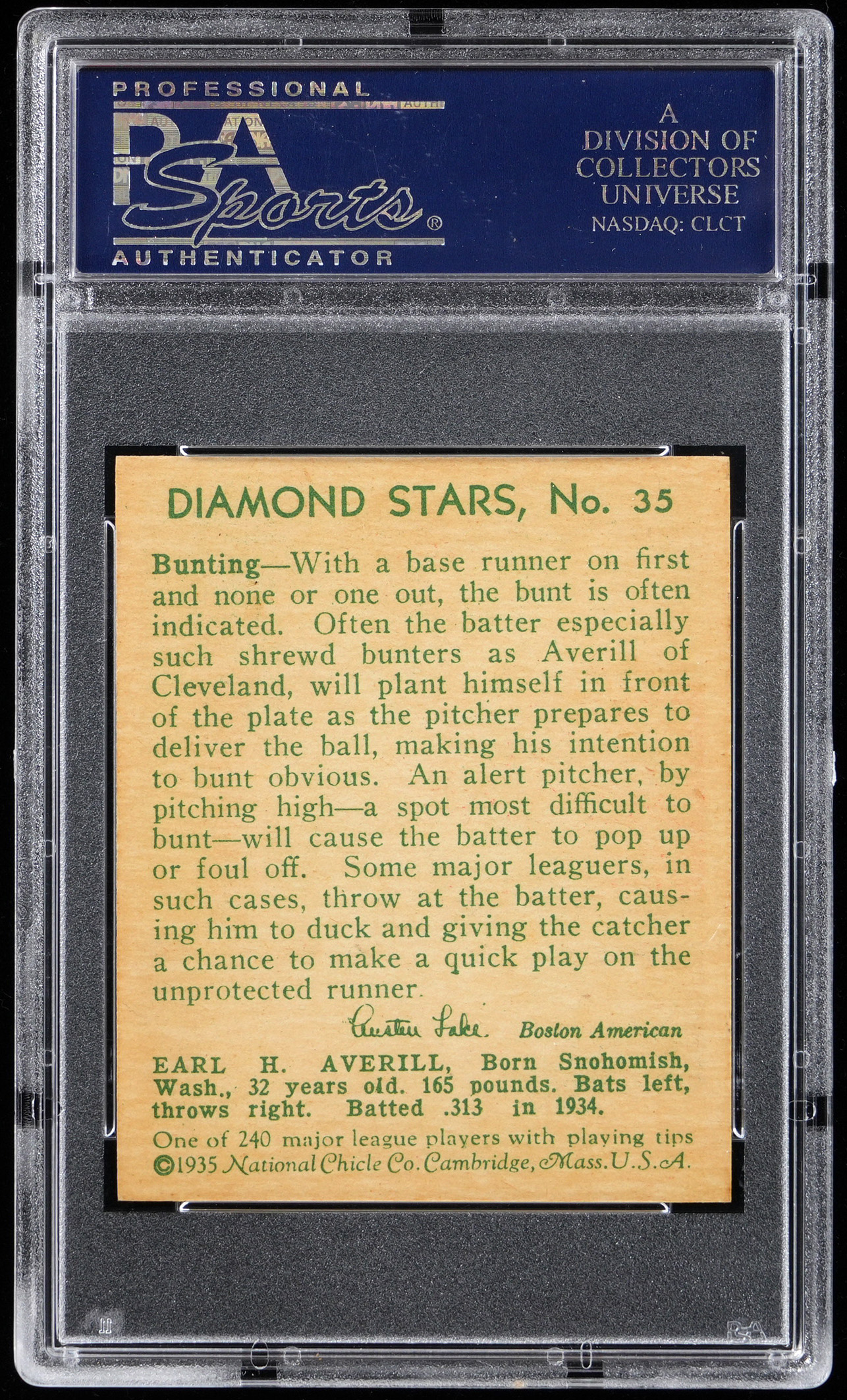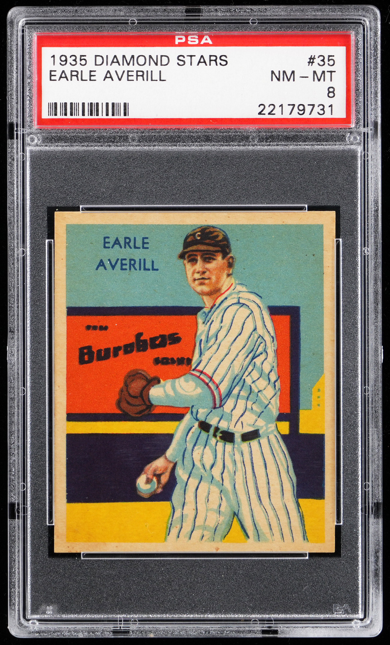 Graded NM-MT 8 by PSA. The kingly "Earl of Snohomish" presides on this high-end 1934-1936 Diamond Stars #35 Earl Averill classic. The accurately centered Cleveland Indians Hall of Famer ranks in the upper 10% of all similar copies evaluated by the grading company with 8 higher. Part of a 1934-1936 Diamond Stars PSA graded set break available throughout this auction.