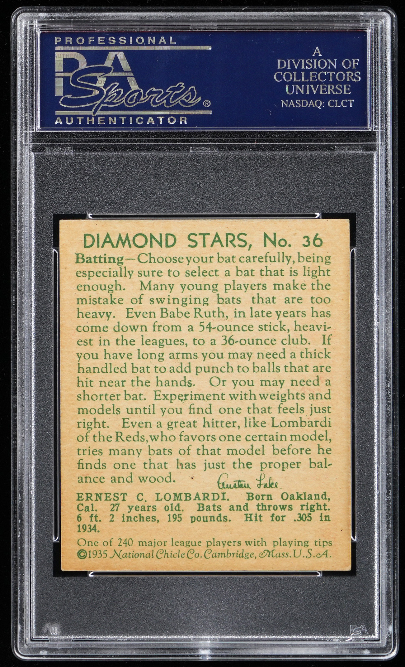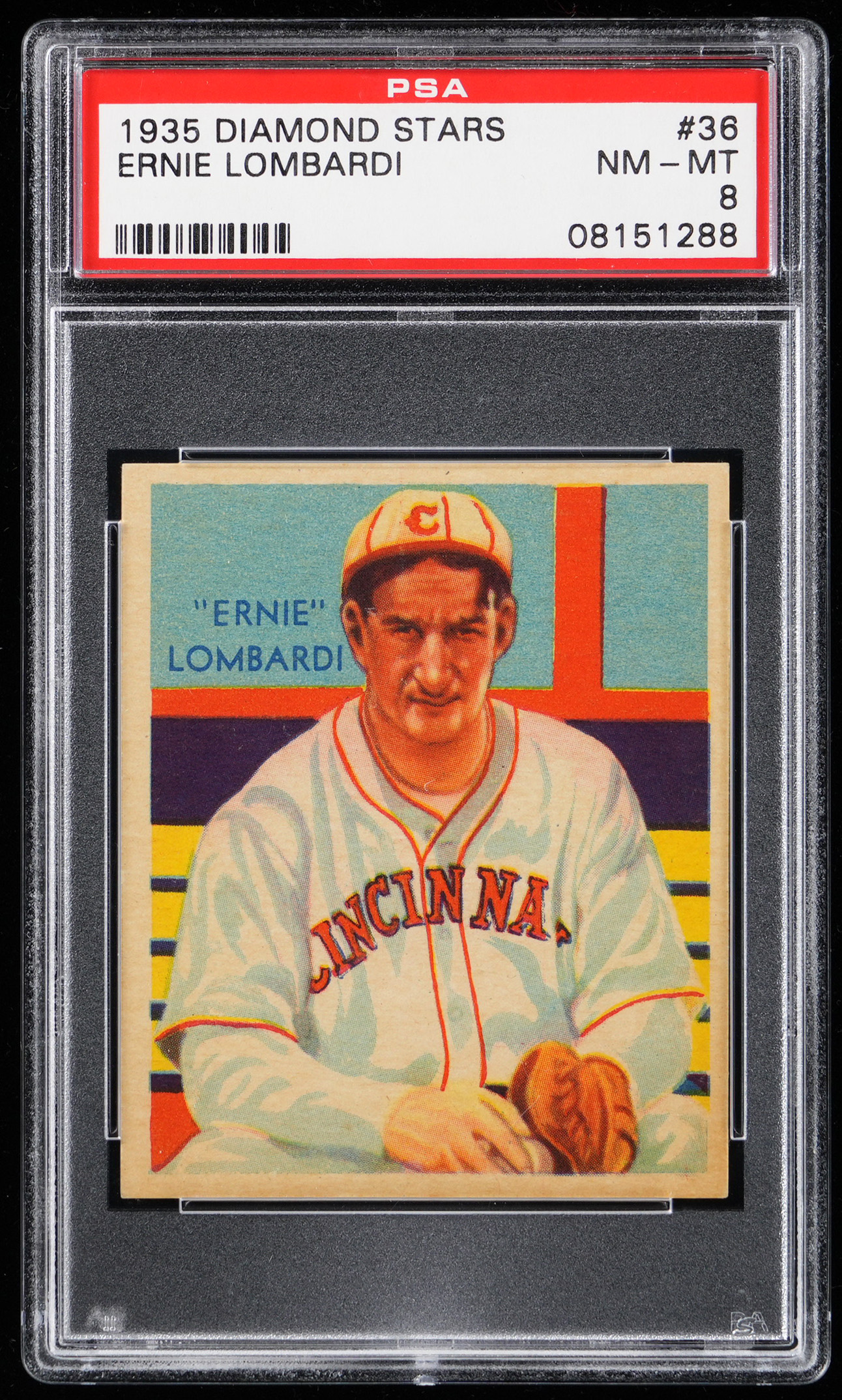 Graded NM-MT 8 by PSA. The stout Cincinnati Reds Hall of Fame catcher Ernie Lombardi. This corrected first name version is exceptionally attractive and presents "on point" with its overall assessment. Ranks in the upper 16% of all similar copies judged by the third-party authenticator with 3 higher. Part of a 1934-1936 Diamond Stars PSA graded near set break available throughout this auction.