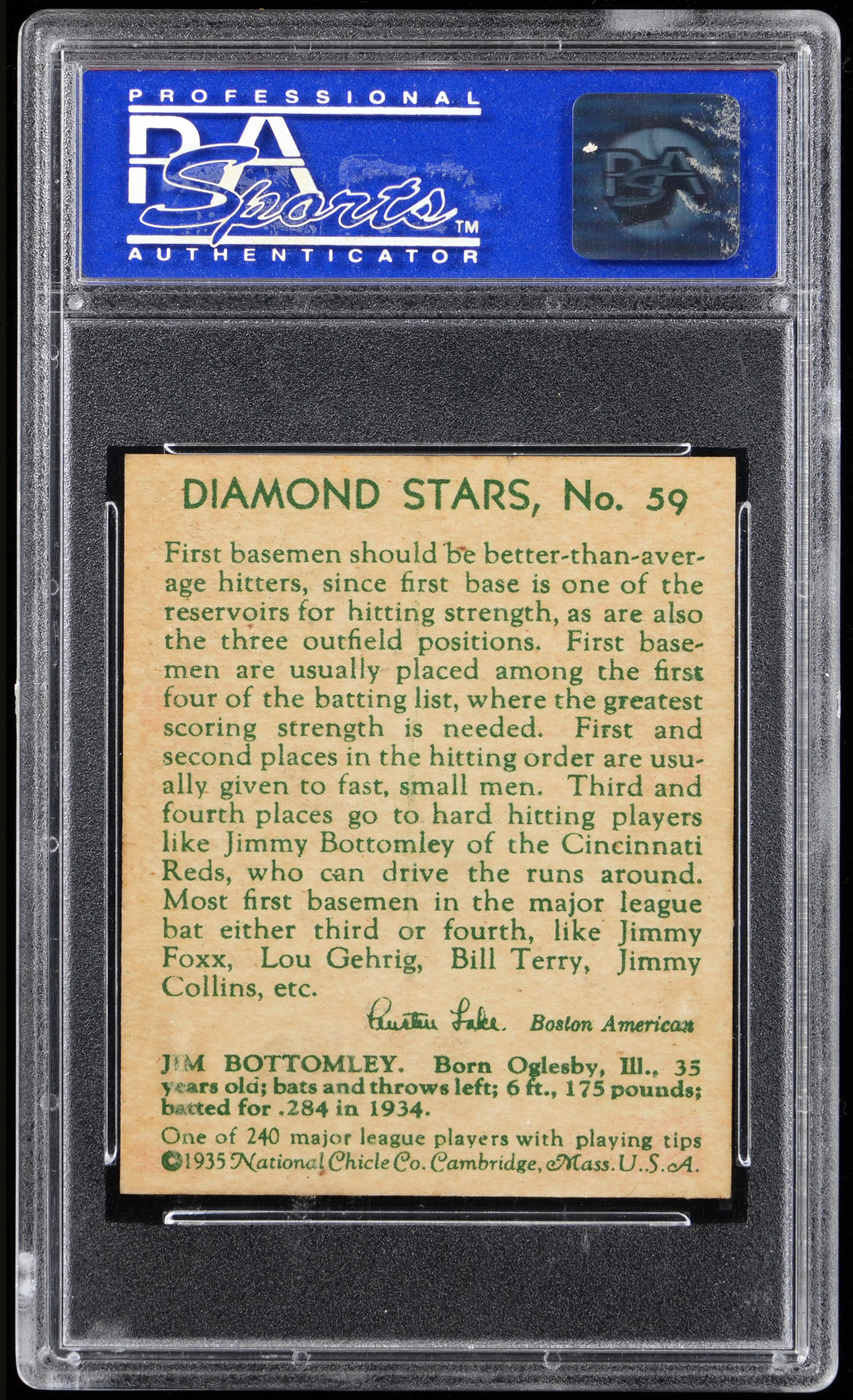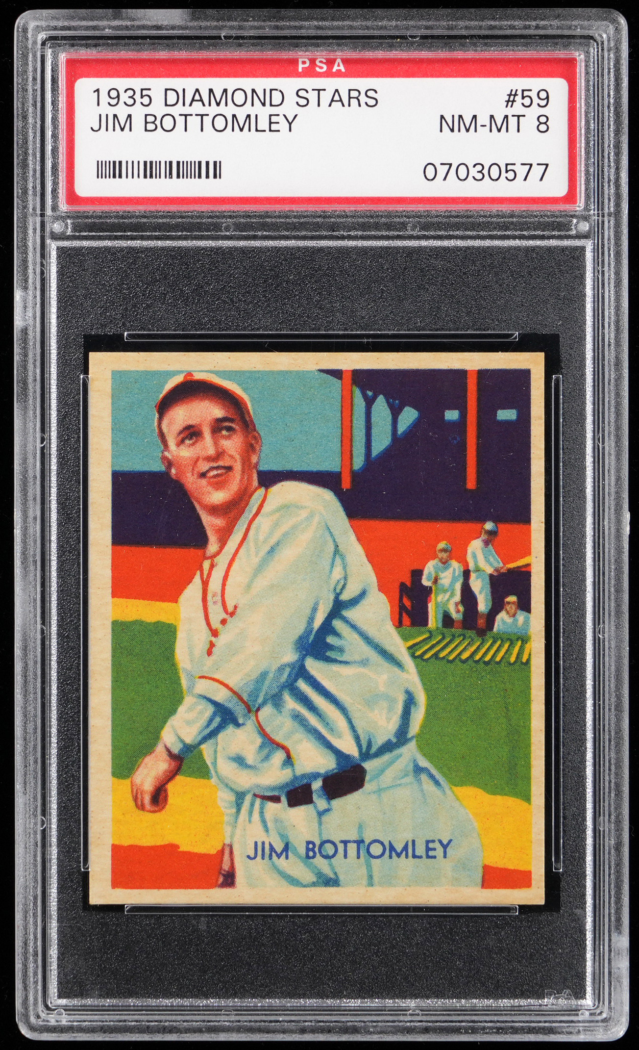 Graded NM-MT 8 by PSA. "Sunny" Jim Bottomley is the subject of the offered 1934-1936 Diamond Stars #59 keepsake. This St. Louis Cardinals Hall of Famer is framed by razor-sharp corners, crisp edges and a captivating action sequence set against period "art deco" illustrations. The dated 1935 green back is clean with bold type. Ranks in the upper 14% of all similar copies judged by the authenticator with 5 higher. Part of a 1934-1936 Diamond Stars PSA graded near set break available throughout this auction.
