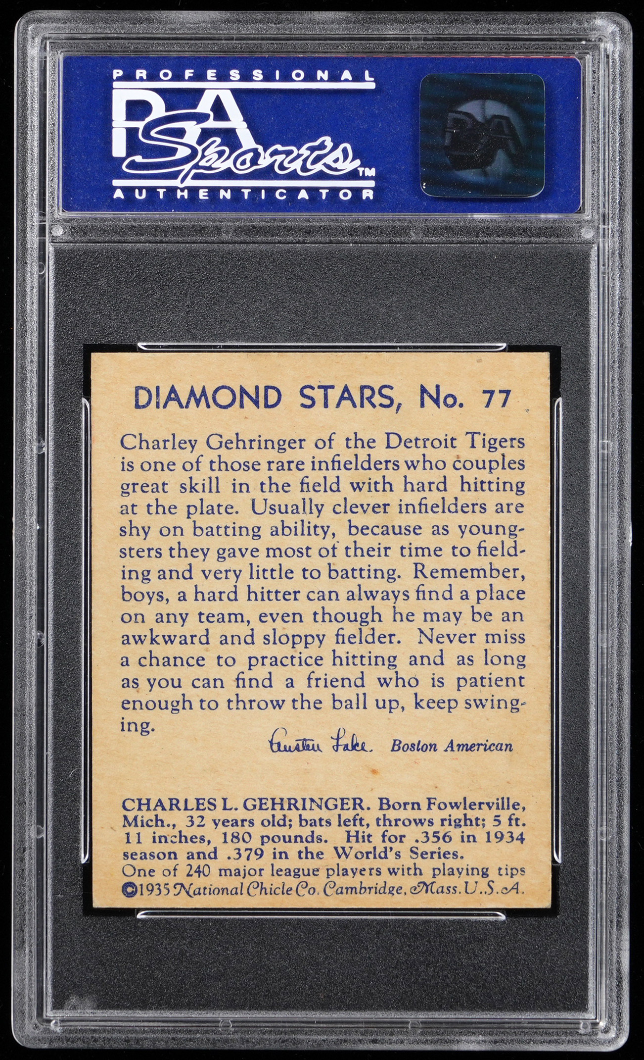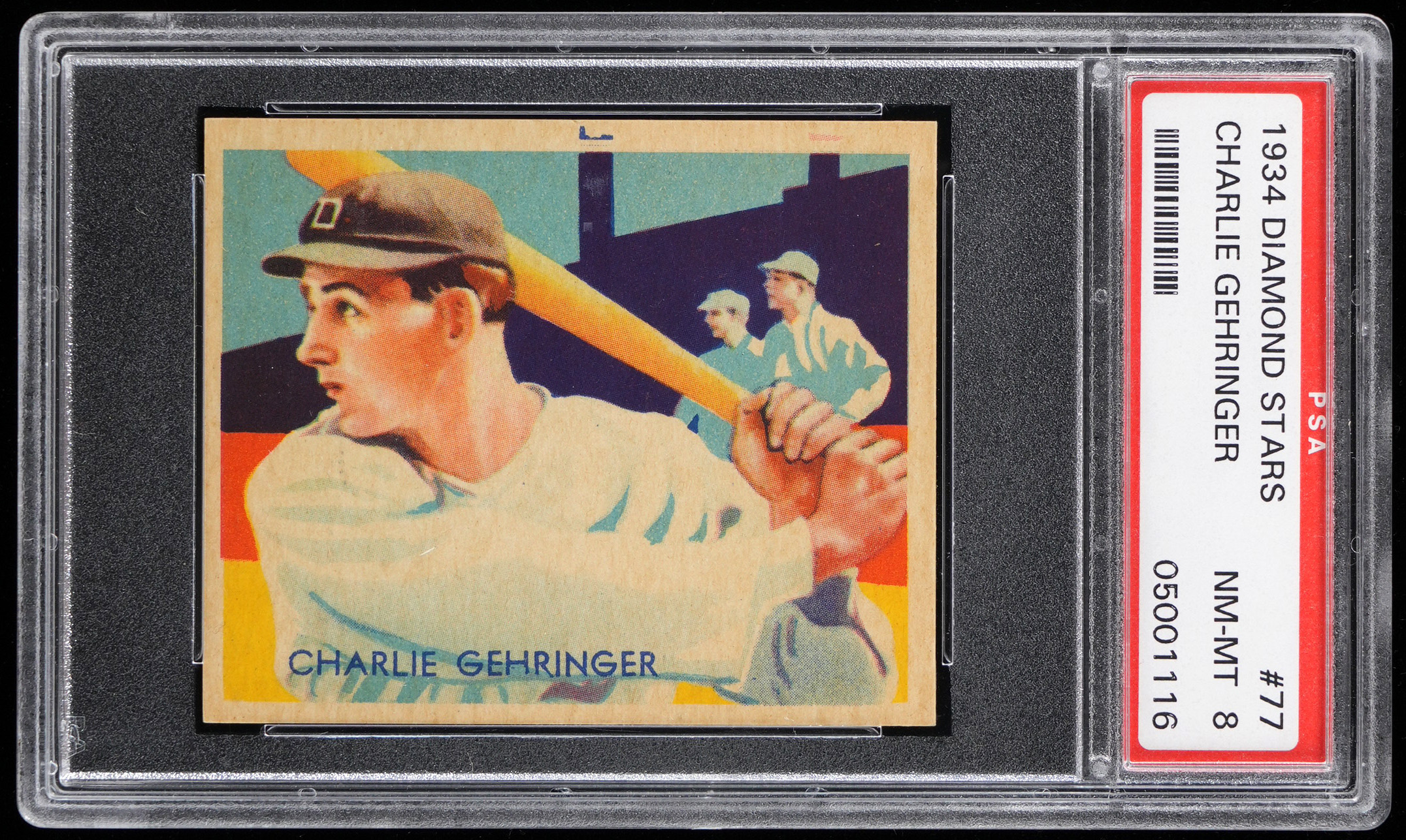 Graded NM-MT 8 by PSA. A profile in diamond fundamentals, the exacting Charlie Gehringer scrutinizes an incoming pitch on the offered 1934-1936 Diamond Stars #77 gum card. This horizontal action pose is simply superb by exhibiting four sharp corners, crisp edges and shimmering art deco surface accents with perfectly contrasted flesh tones. The dated 1935 blue back (mislabeled as 1934 on the flip) is clean. Of the 120 total copies evaluated of the player/back color combination, this Detroit Tigers Hall of Famer ranks as 1 of 9 at the grading level with none higher (top 8%)! Part of a 1934-1936 Diamond Stars PSA graded set break available throughout this auction.