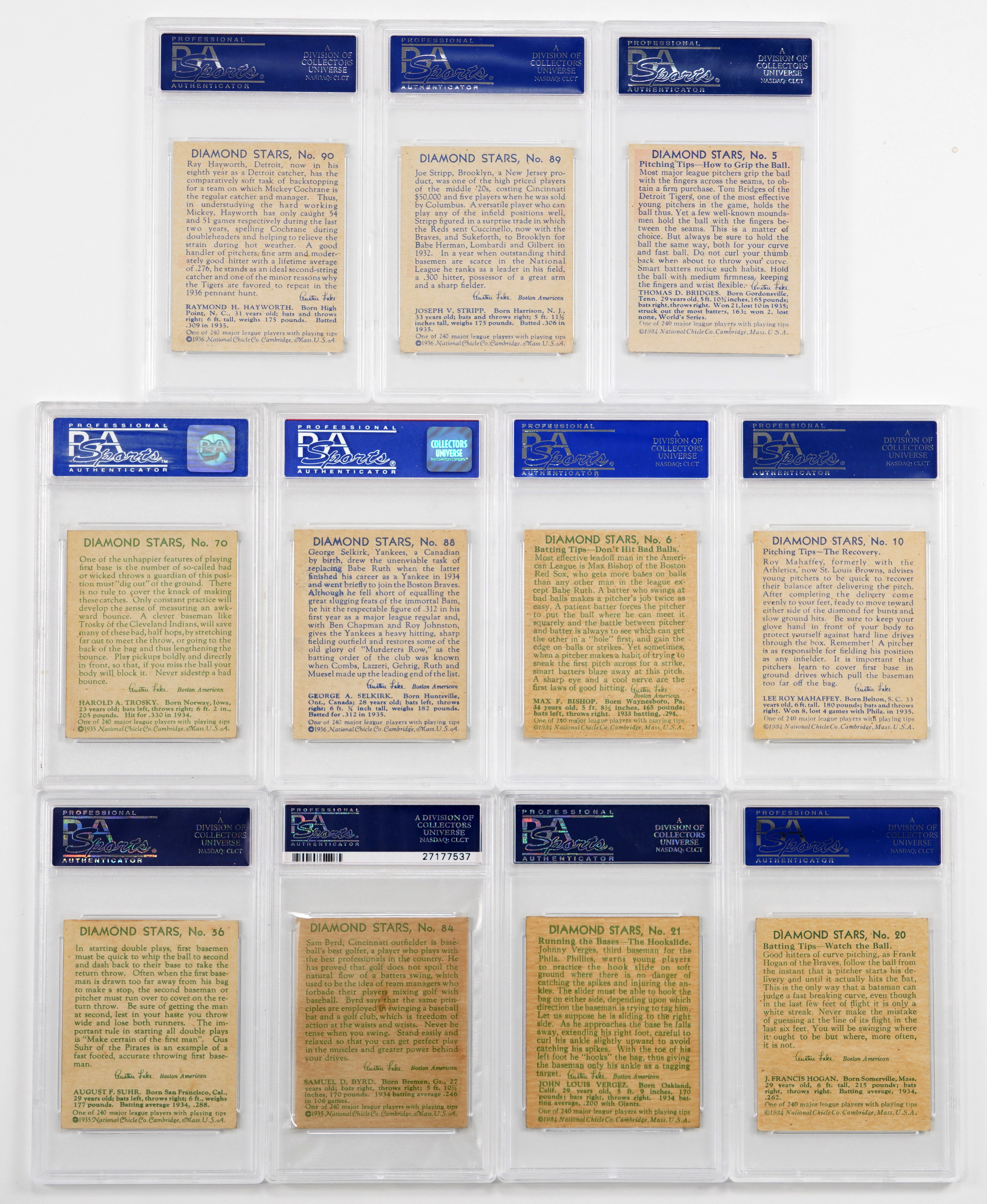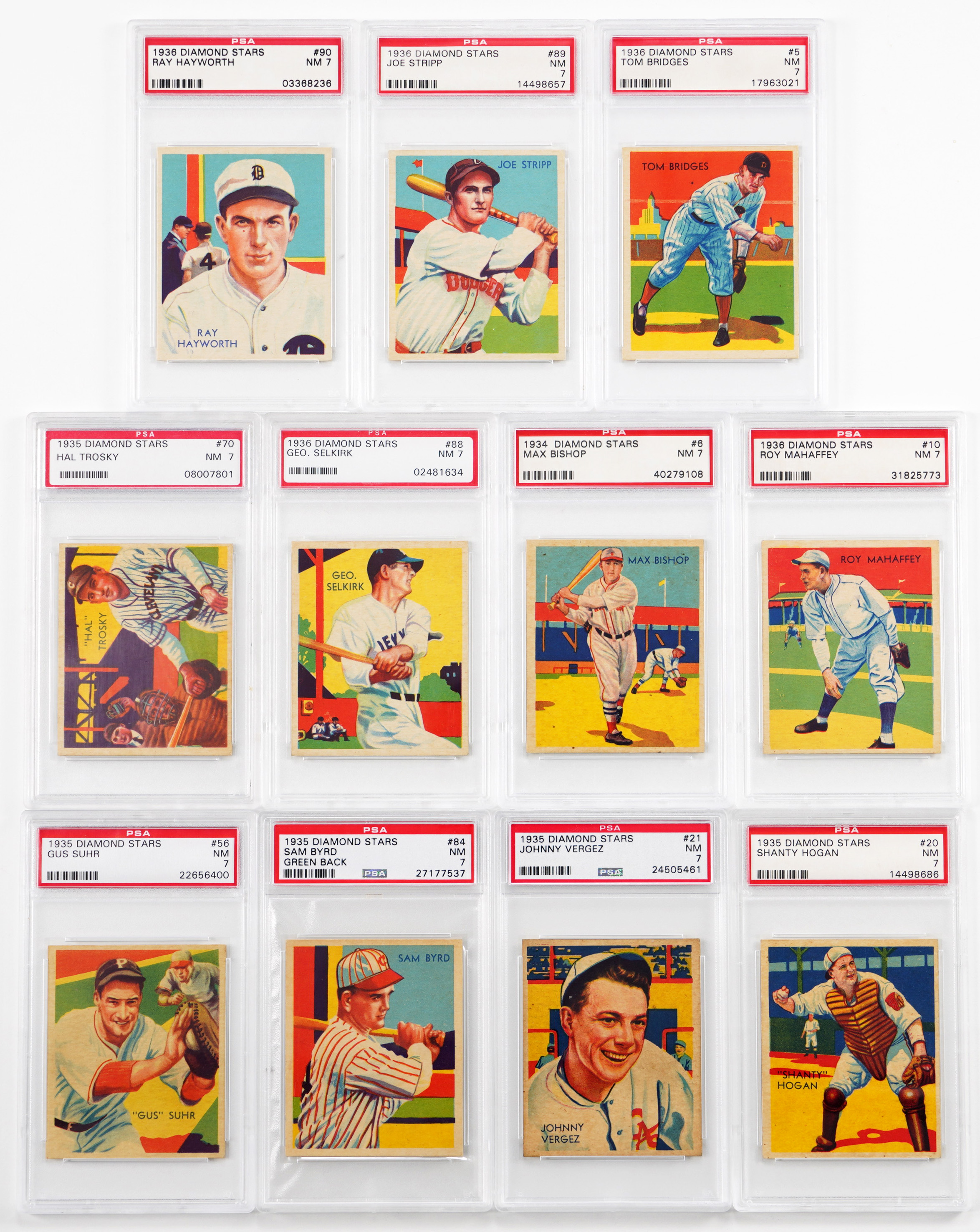 Each graded NM 7 by PSA. Sweep the offered collection of eleven 1934-1936 Diamond Stars singles featuring a trio of tougher high numbers. Unless noted, each low number displays a green back. Includes: #5 Bridges (1936 blue back), #6 Bishop, #10 Mahaffey (1936 blue back), #20 Hogan, #21 Vergez, #56 Suhr, #70 Trosky, #84 Byrd, #88 Selkirk, #89 Stripp and #90 Hayworth. Part of a 1934-1936 Diamond Stars PSA graded near set break available throughout this auction.