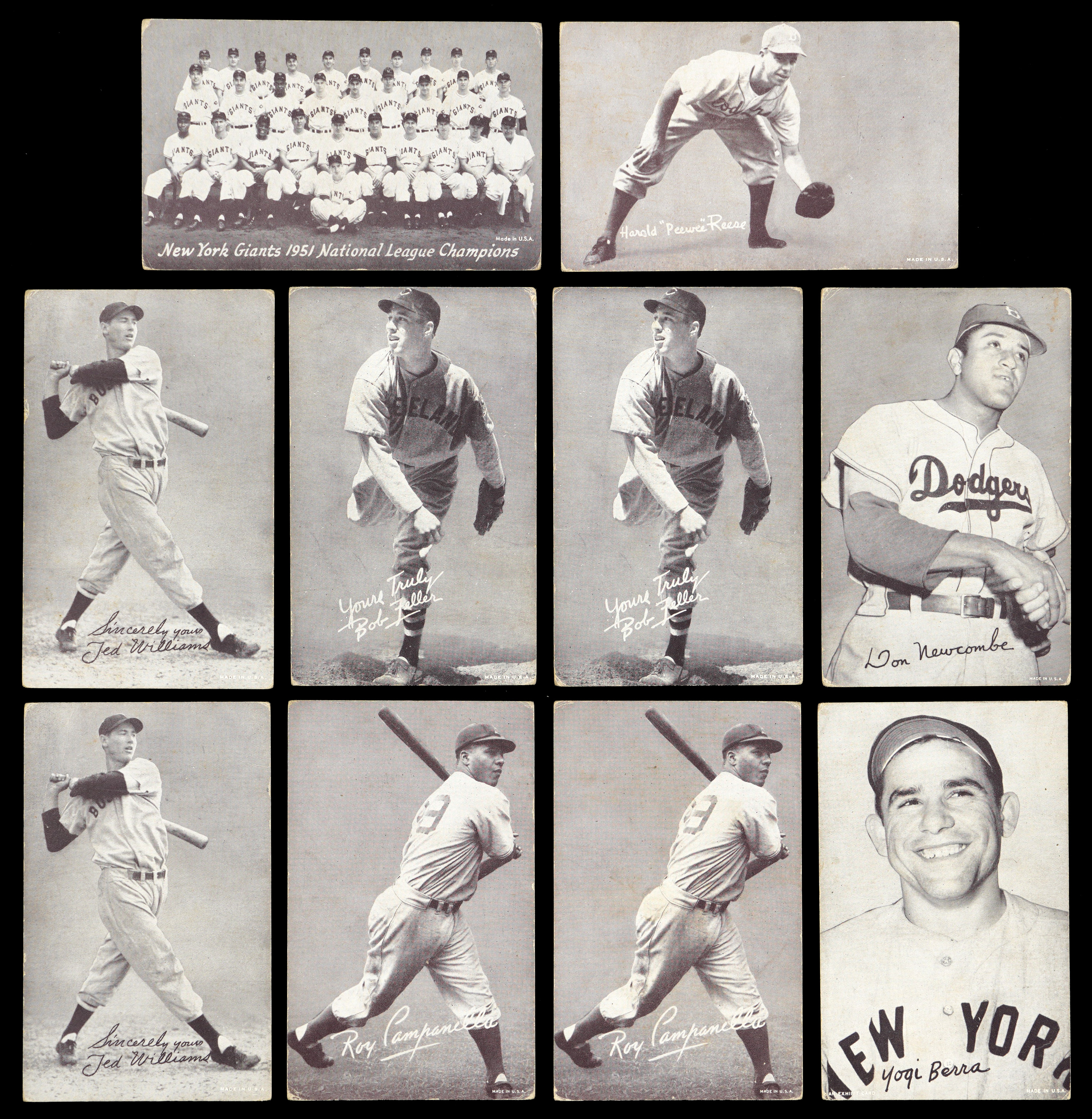 1947-1966 Exhibits: (59 cards, average FR to GD) with Berra (FR, Made In U.S.A. Lower Right), (2) Campanella (both GD), D. DiMaggio (GD), Doby (FR, with An Exhibit Card), (2) Doerr (GD, FR, both with An Exhibit Card Lower Left), Irvin (GD), (2) Kell (both GD), Kiner (GD), (2) Lemon (one GD, one PR, reverse writing, Glove Not Visible), (2) Newcombe (GD, FR, Shaking Hands), (2) Newhouser (both GD), (2) Reese (both GD, Ball Not Visible), Slaughter (GD), Spahn (FR, “B” on Cap), 1951 Giants Team (GD)