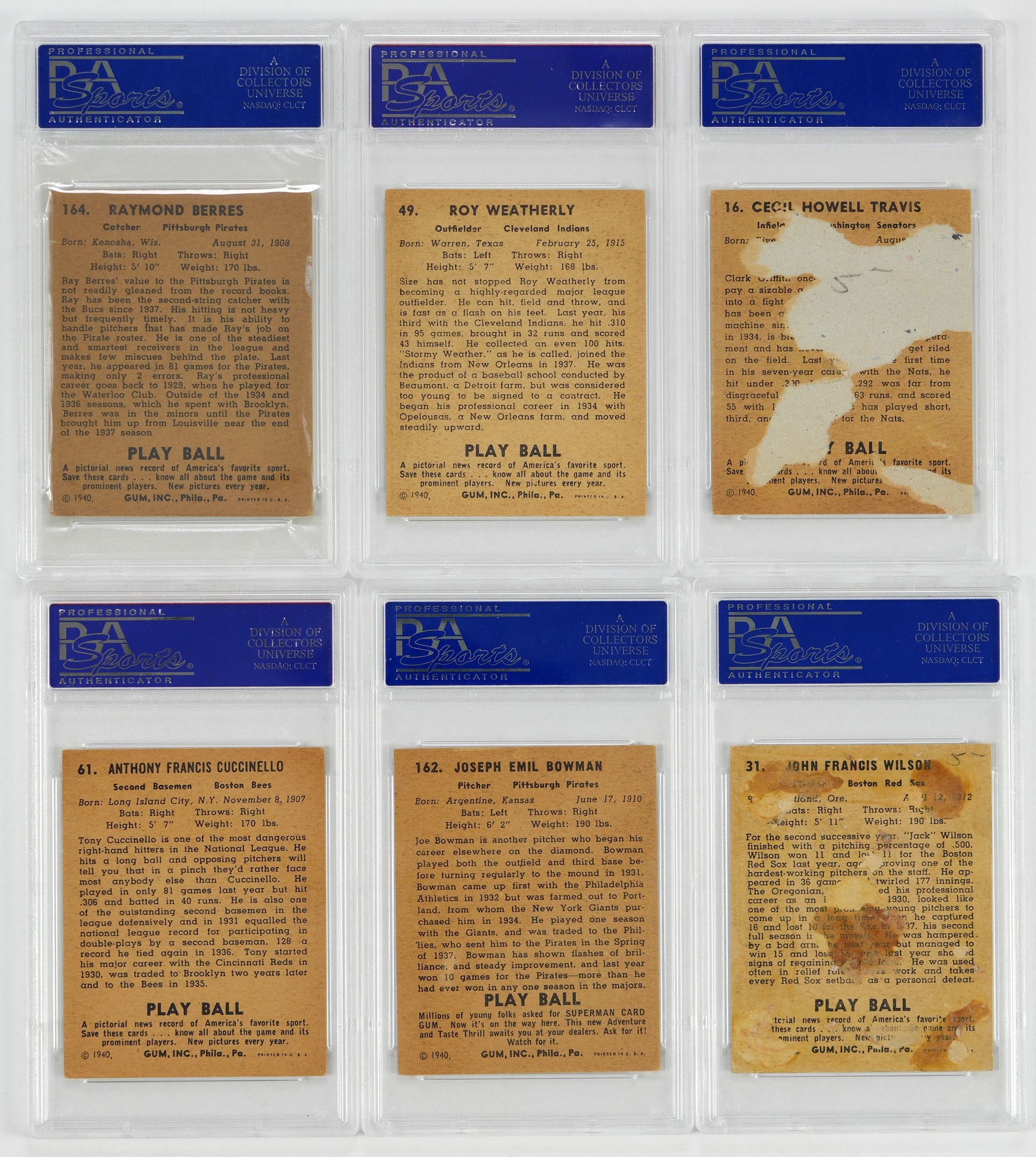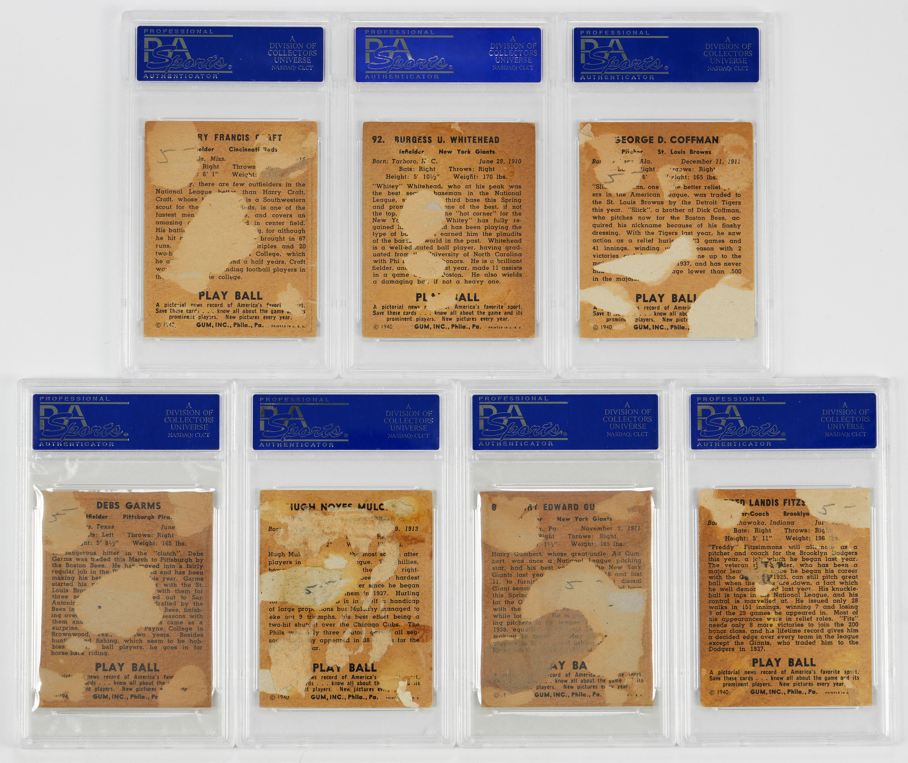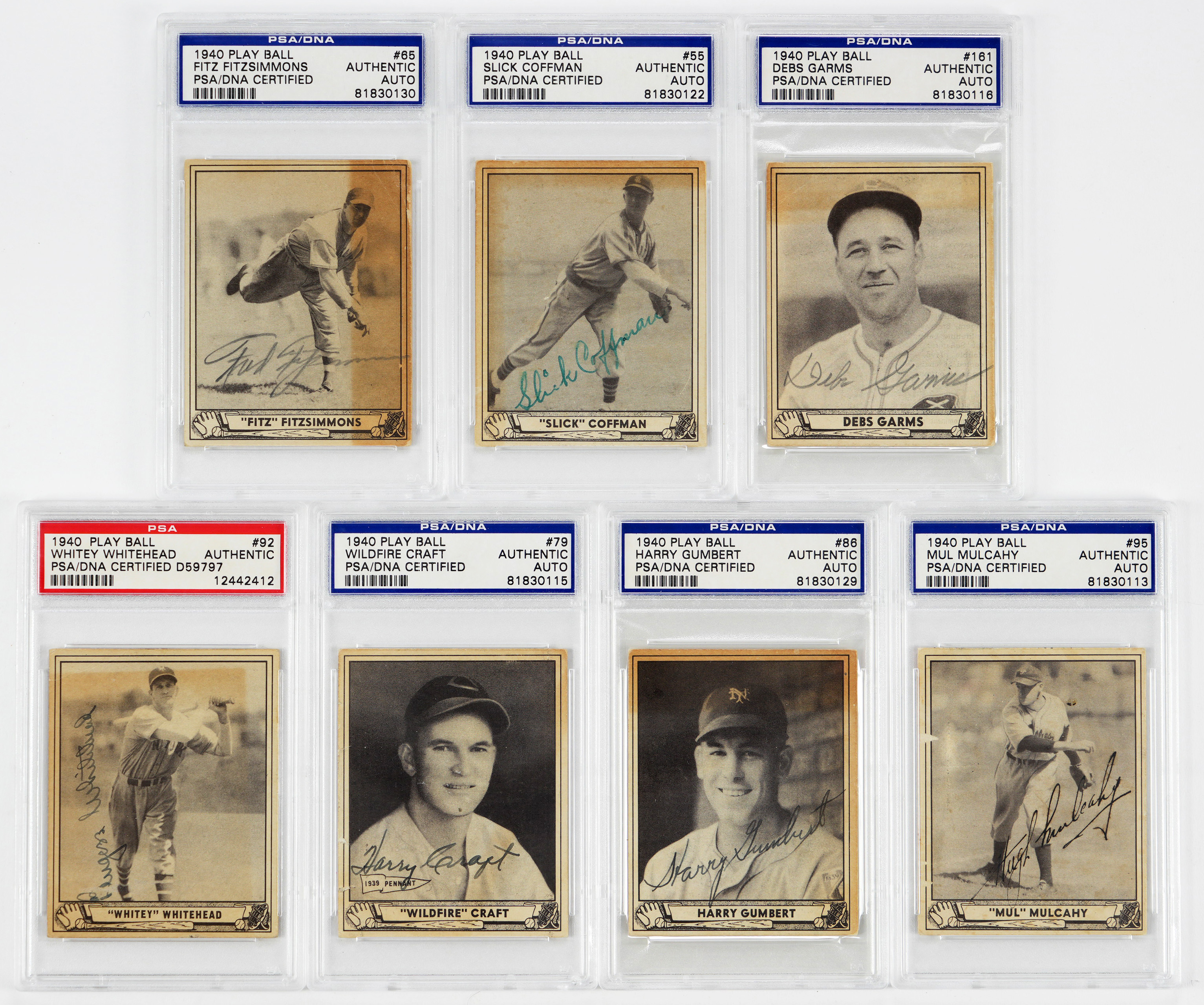 Each signatured judged Authentic by PSA/DNA and encapsulated. Timeless collection of (13) 1940 Play Ball autographed cards. Unless noted, each of the average ("7-8") signatures are placed on surfaces that display reverse paper loss/residue. Includes: #16 Travis, #31 J. Wilson, #49 Weatherly (card VG-EX), #55 Coffman, #61 Cuccinello (card VG), #65 Fitzsimmons, #79 Craft, #86 Gumbert, #92 Whitehead, #95 Mulcahy, #161 Garms, #162 Bowman (card VG-EX) and #164 Berres (card VG).