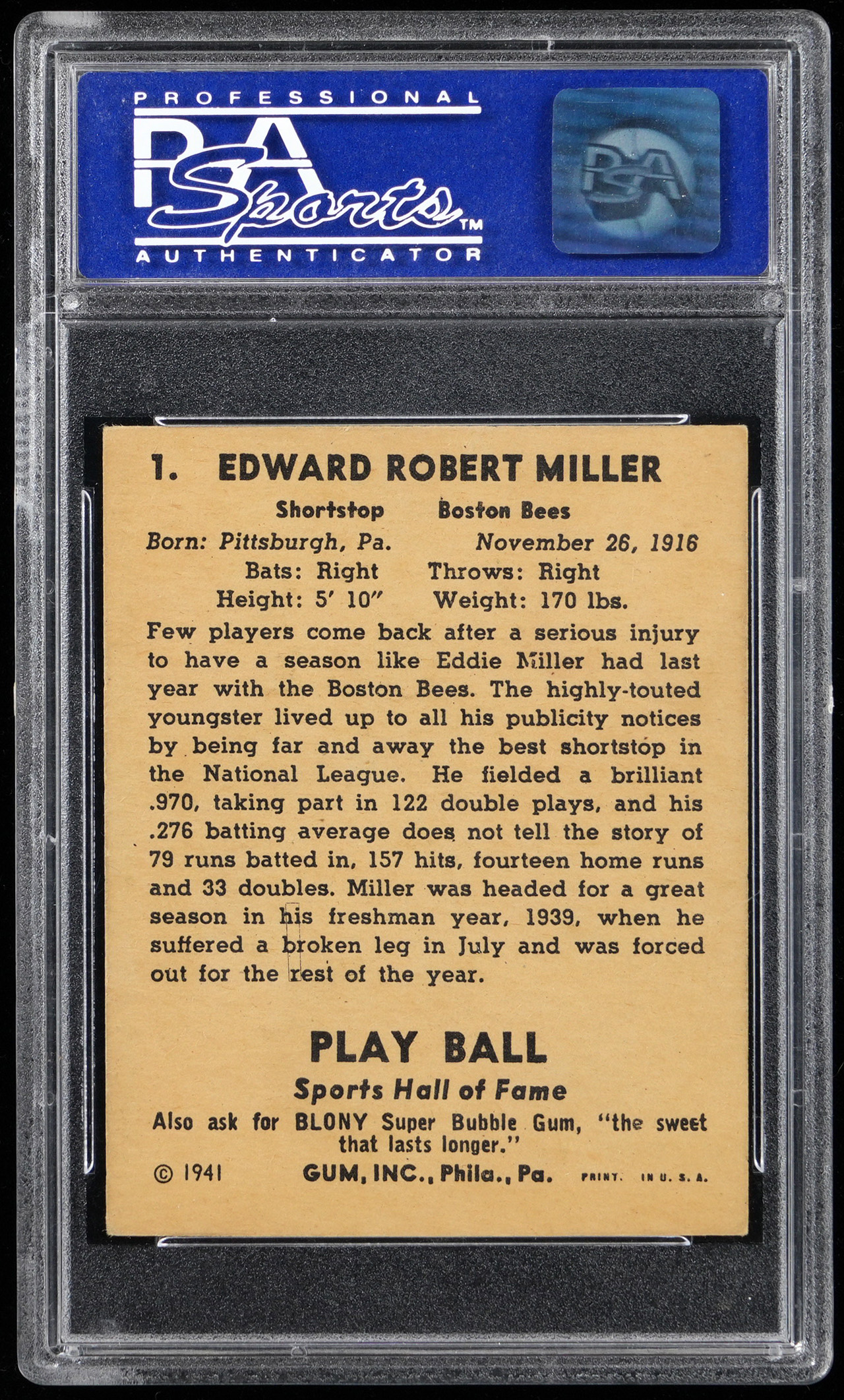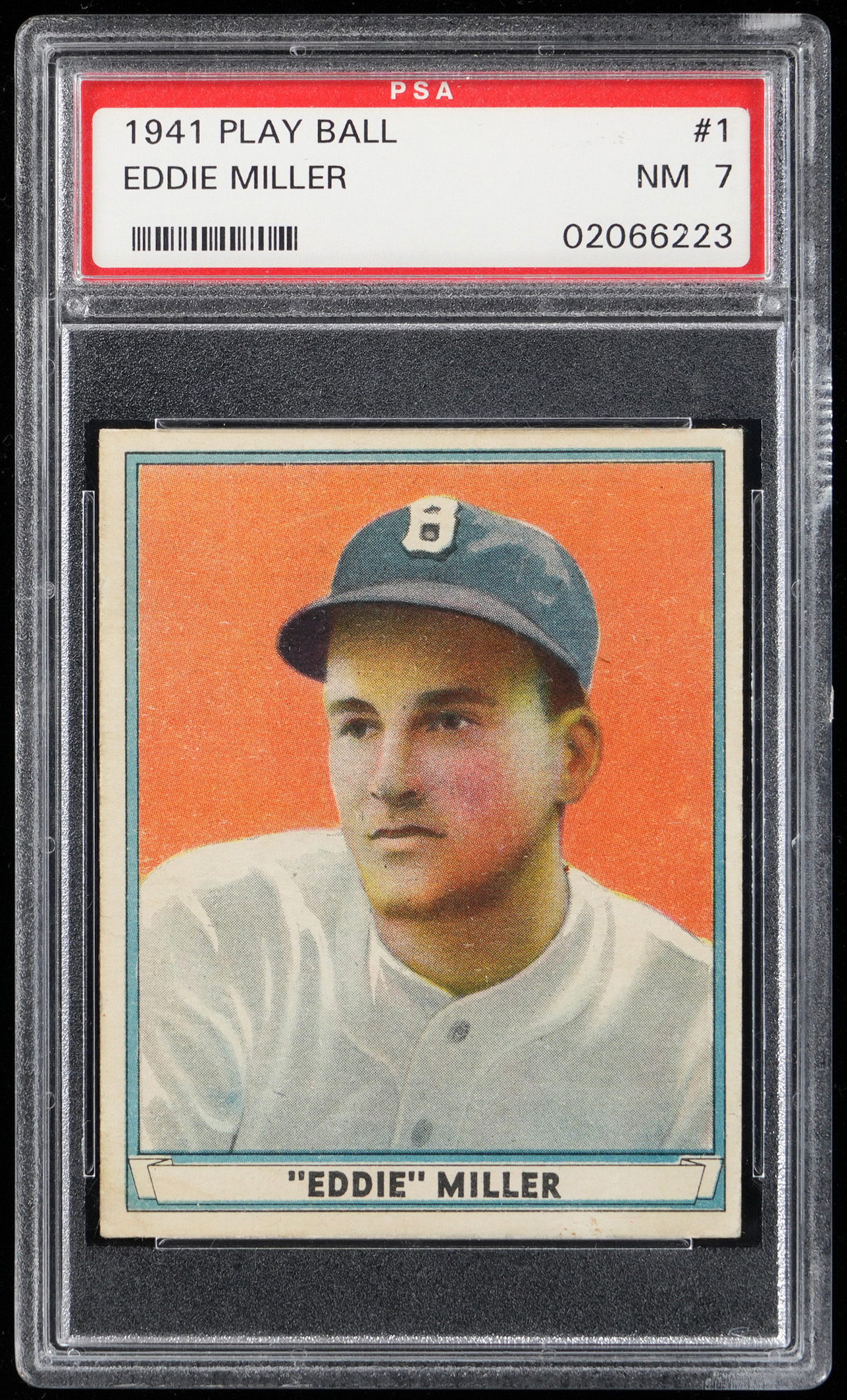 Graded NM 7 by PSA. Boston Bees All-Star Eddie Miller. This lead-off single ranks in the upper 14% of all similar copies judged by the authenticator. Part of a 1941 Play Ball PSA graded near set break available throughout this auction.