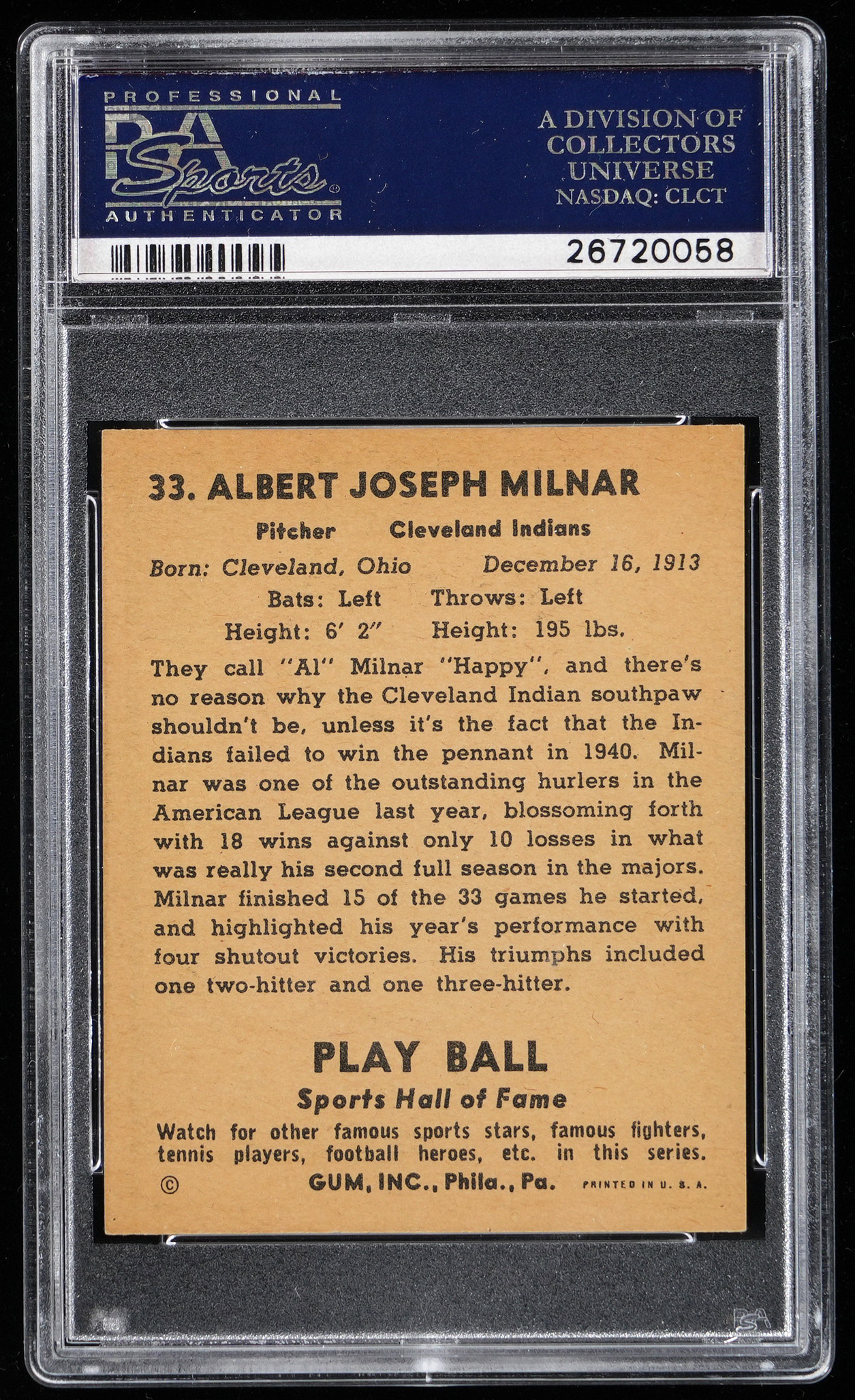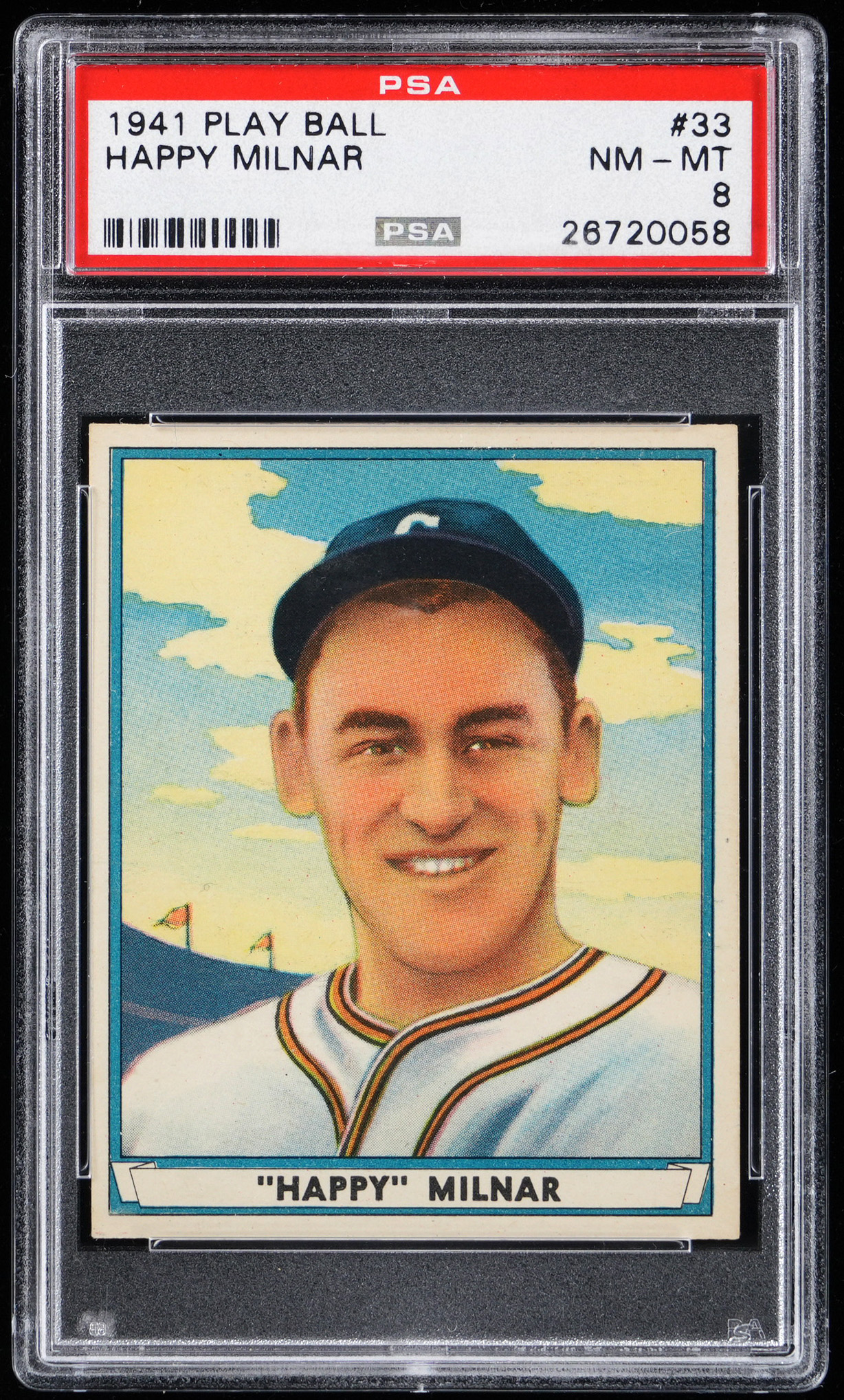 Graded NM-MT 8 by PSA. Cleveland Indians All-Star Al (Happy) Milnar. Ranks in the upper 11% of all similar copies judged by the authenticator with only 3 higher. Part of a 1941 Play Ball PSA graded near set break available throughout this auction.