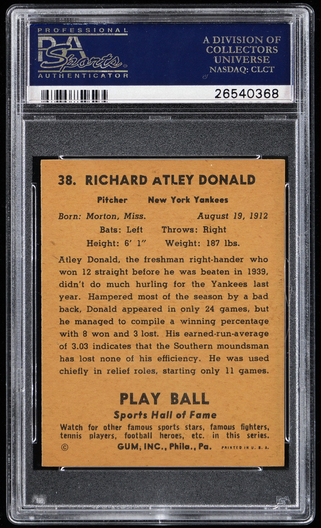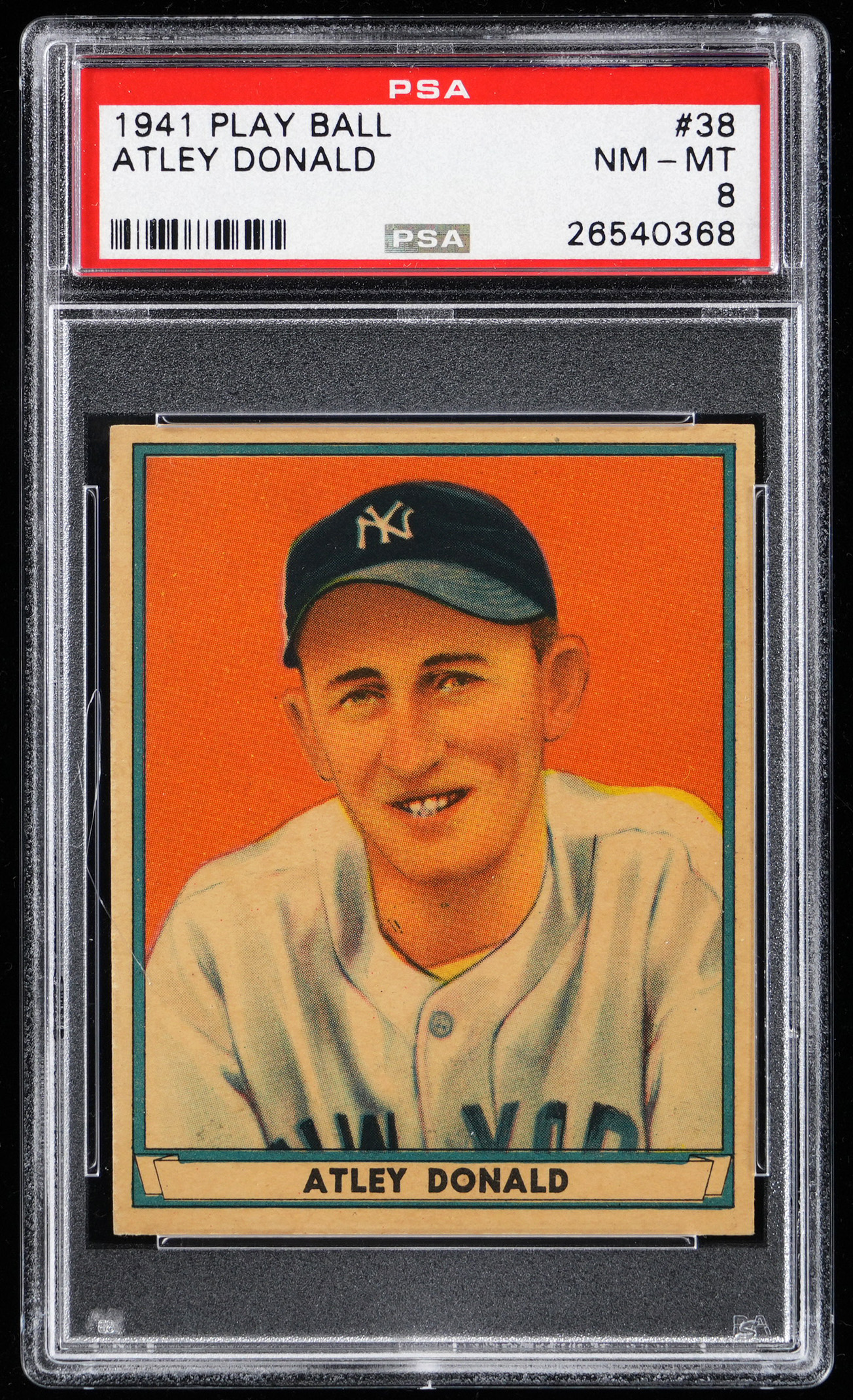 Graded NM-MT 8 by PSA. New York Yankees pitcher Atley Donald. Ranks in the upper 13% of all similar copies judged by the authenticator with 7 higher. Part of a 1941 Play Ball PSA graded near set break available throughout this auction.