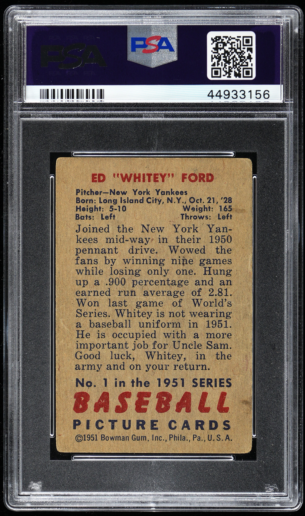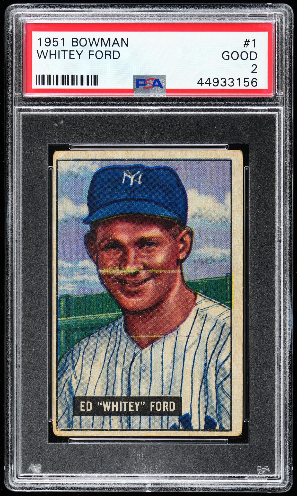 Graded GOOD 2 by PSA. "The Chairman of the Board" directs the offered 1951 Bowman #1 Whitey Ford rookie card. This stack topper promotes the New York Yankees Hall of Fame southpaw at the outset of his storied career!