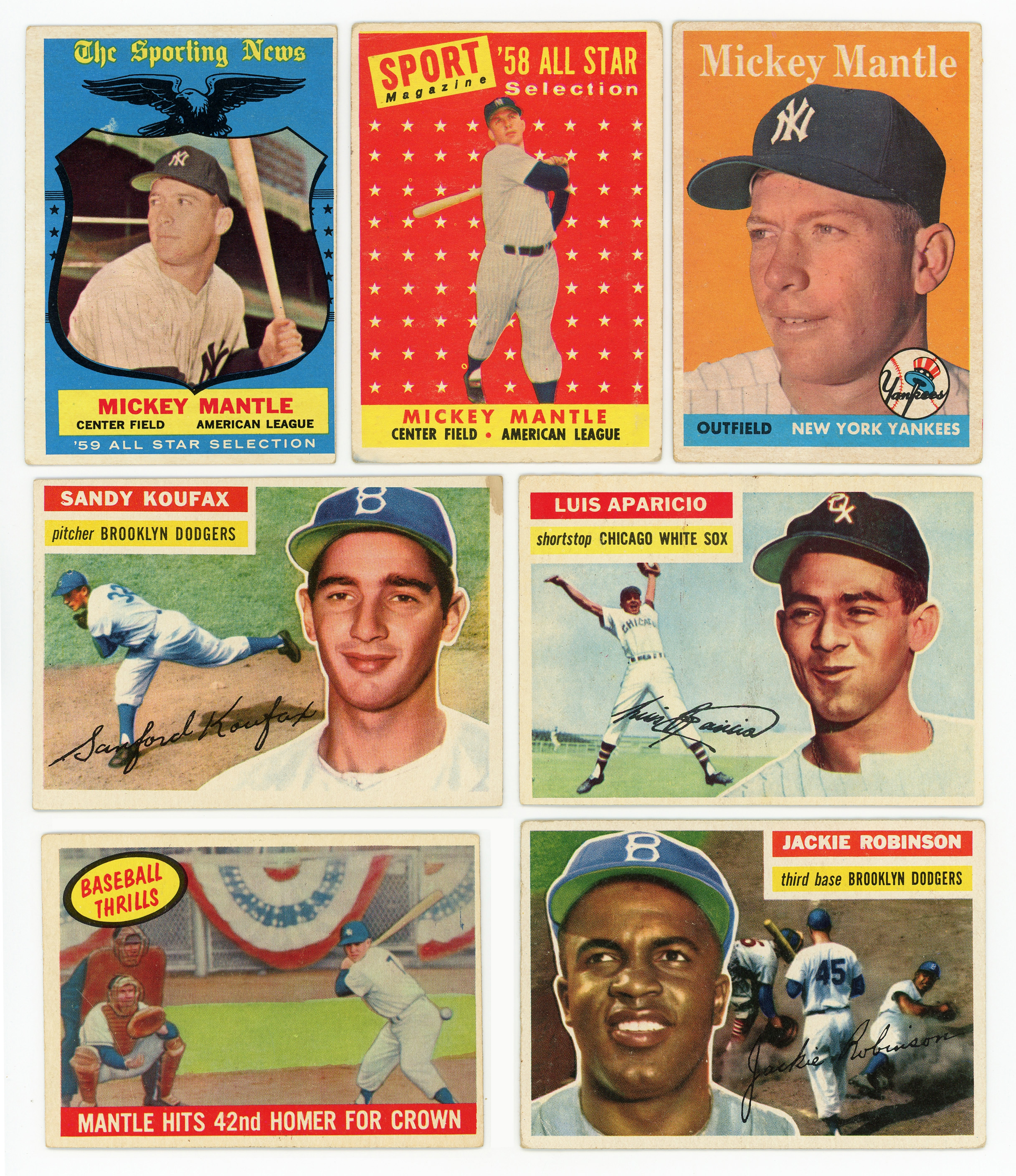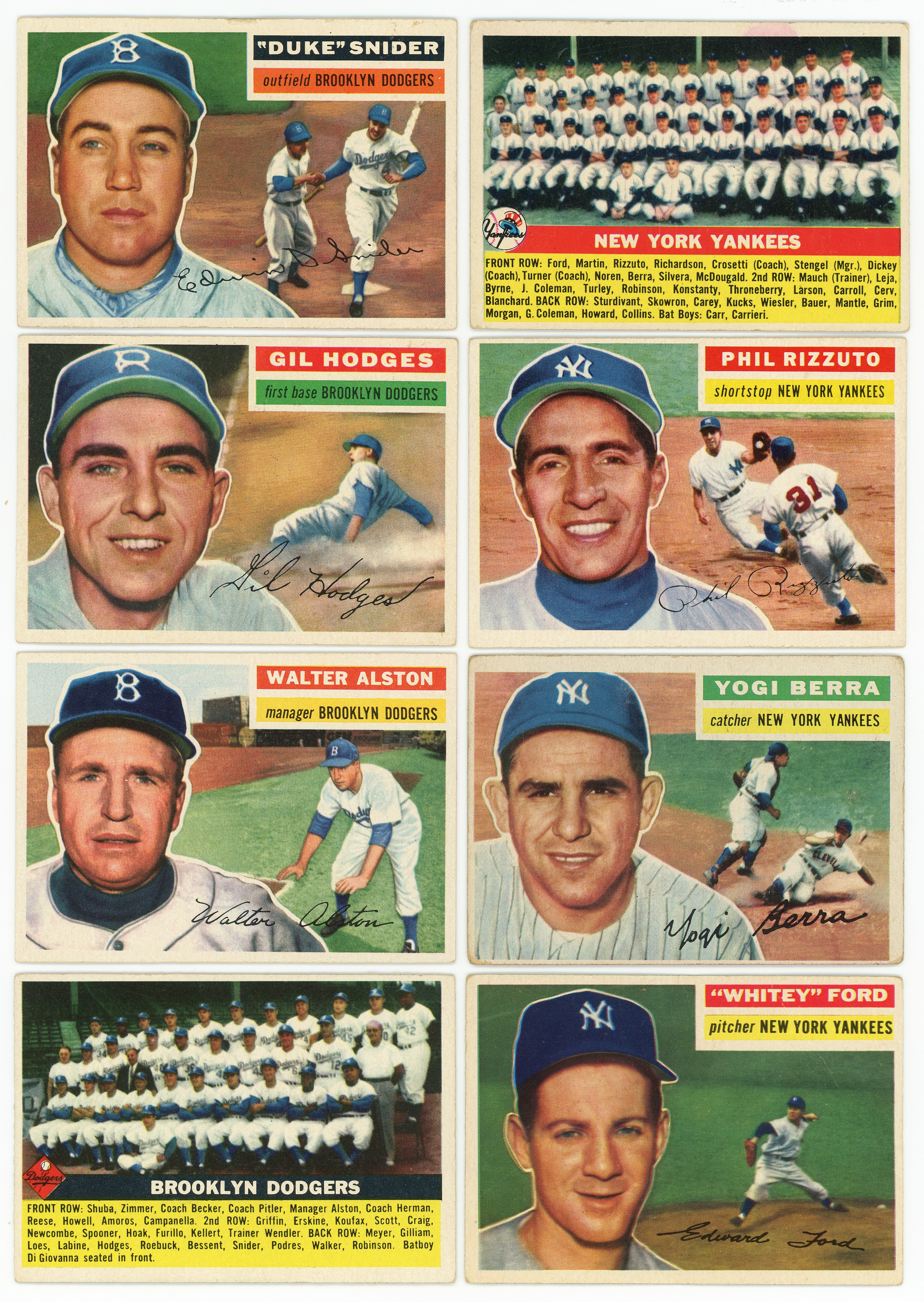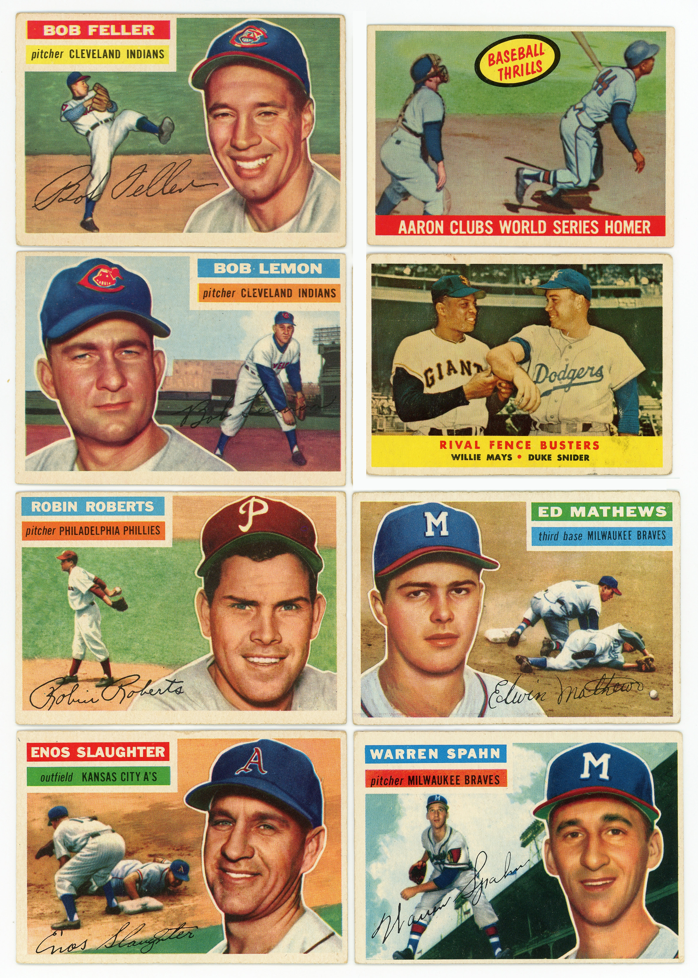 1956 Topps: (59 cards, average GD to VG) with #8 Alston (EX), #10 Spahn (VG), #15 Banks (VG-EX), #30 J. Robinson (GD), #79 Koufax (VG, stain), #101 Campanella (VG-EX), #107 Mathews (VG), #109 Slaughter (VG), #110 Berra (FR), #113 Rizzuto (EX), #140 Score RC (EX-MT), #145 Hodges (VG-EX), #150 Snider (VG), #166 Dodgers Team (VG), #180 Roberts (VG-EX), #200 Feller (GD), #226 Giants Team (VG), #240 Ford (FR), #251 Yankees Team (GD, stain), #255 Lemon (VG-EX), #292 Aparicio RC (VG-EX);