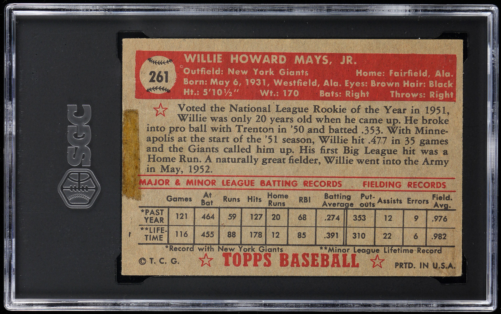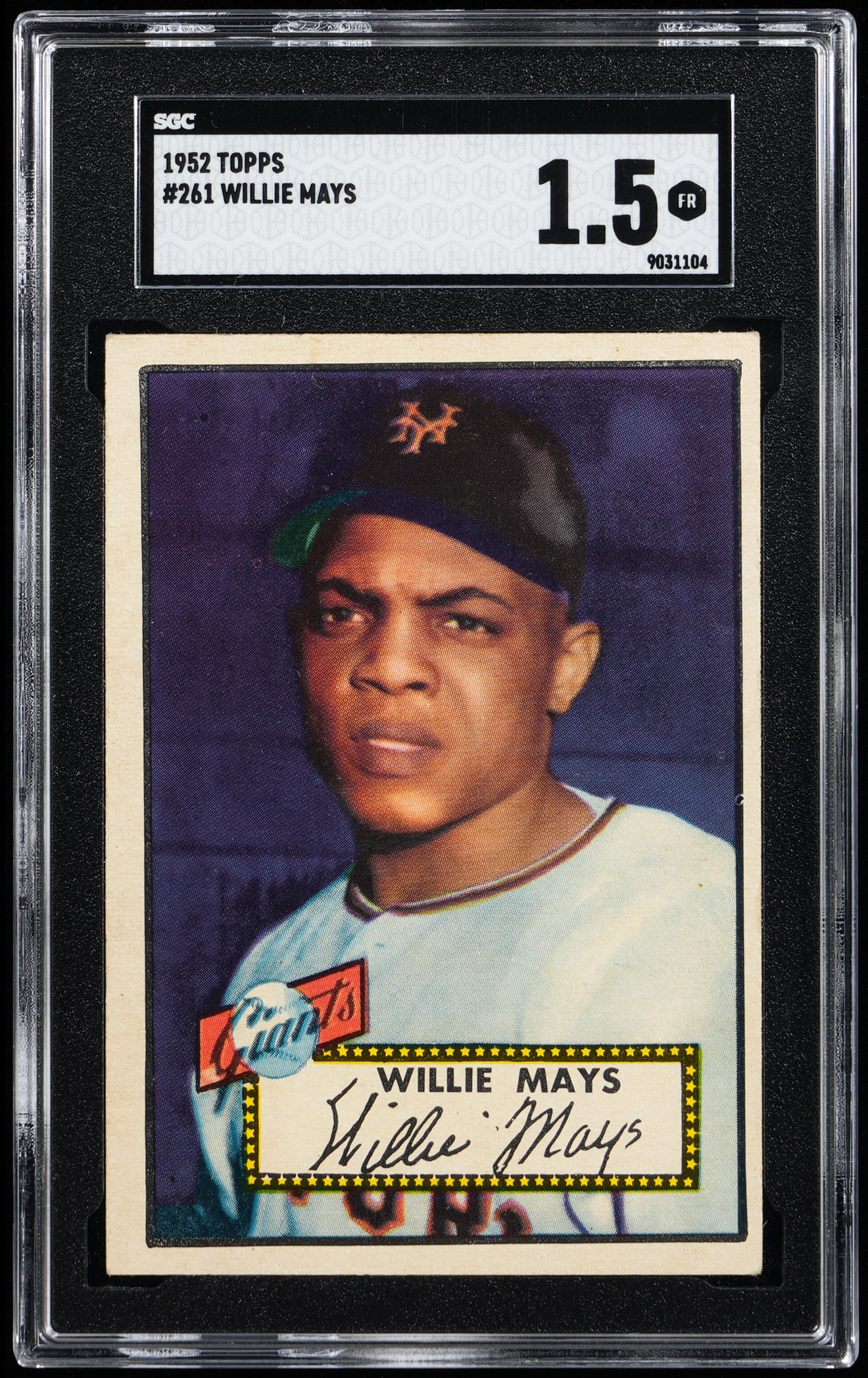 Graded FAIR 1.5 by SGC. A superb 1952 Topps #261 Willie Mays example. This first Topps card of the five-tool New York Giants Hall of Fame legend is the undisputed key to the 1952 Topps #1-310 low series and pictures Mays as he readies to take the National League by storm. With exception to a slight diamond cut, the front is crystal clear with barely touched corners, snow white edges and captivating player/uniform details. A nearly inch-long sliver of tape found on the middle left edge of the reverse accounts for Mays' overall judgment. Despite that technical factor, this early "Say Hey" still exhibits fantastic overall eye appeal!