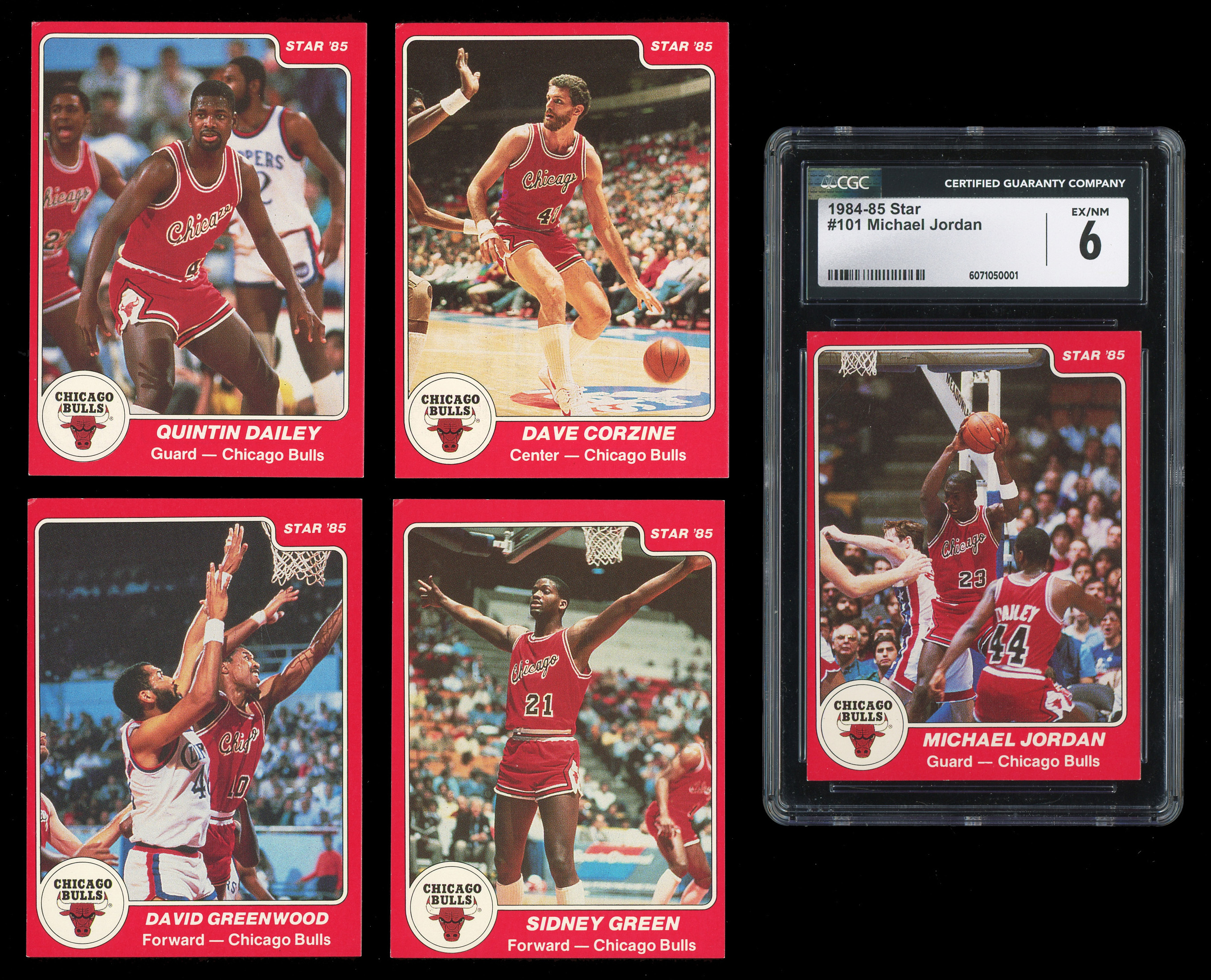 Few players are more collected on a global hobby scale than Hall of Famer Michael Jordan. Pre-dating his 1986-1987 Fleer Basketball release by a full two seasons is the offered 1984-1985 Star Basketball Chicago Bulls team set. This unsealed 12-card issue showcases a young #101 Michael Jordan securing a rebound against the hapless New Jersey Nets. Graded EX/NM 6 by CGC. This cornerstone of His Airness ranks as the lone copy at the grading level with only one better. Despite a slight ding on the upper left corner (the rest of the Bulls team presents similarly), this keynote #23 still exhibits outstanding eye appeal. With Jordan material soaring in value on the secondary market, there is only one way to go for this rookie legend!