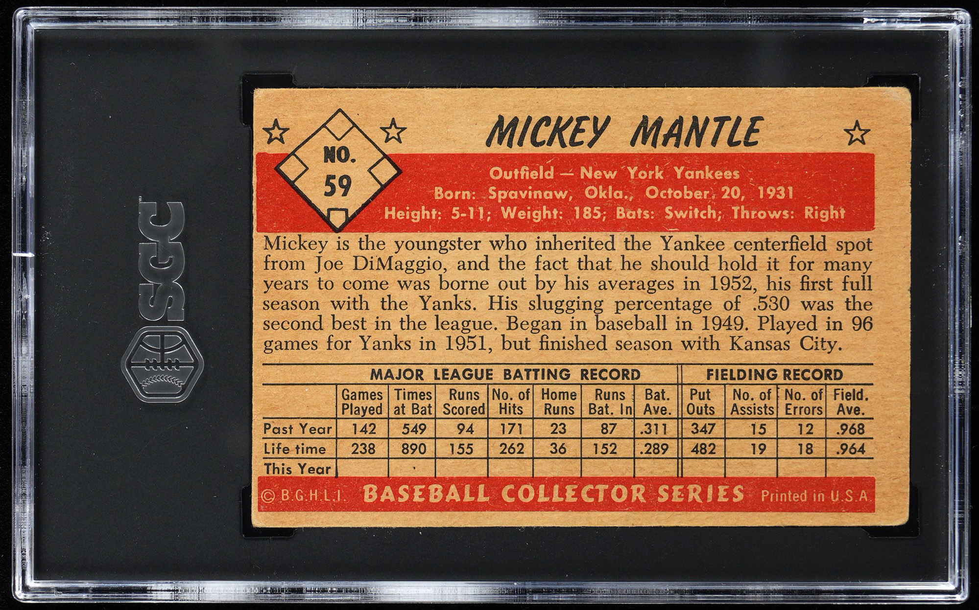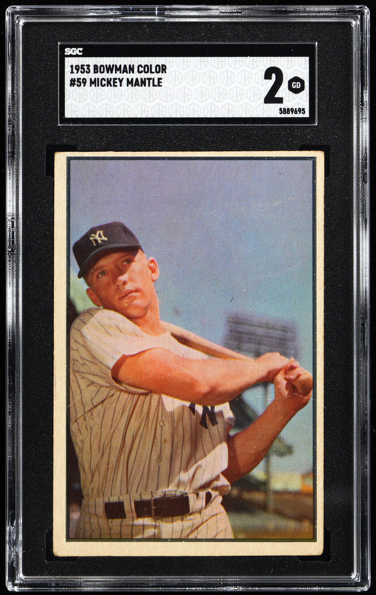 Graded GOOD 2 by SGC. Look out, pitcher - here comes Mickey Mantle! The pinstriped slugger follows through against a Yankee Stadium backdrop on the offered 1953 Bowman Color #59 gum card.