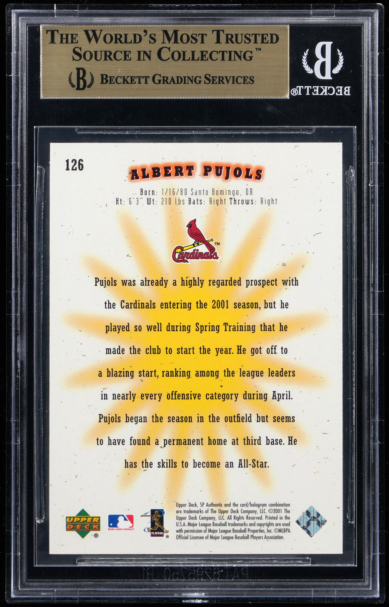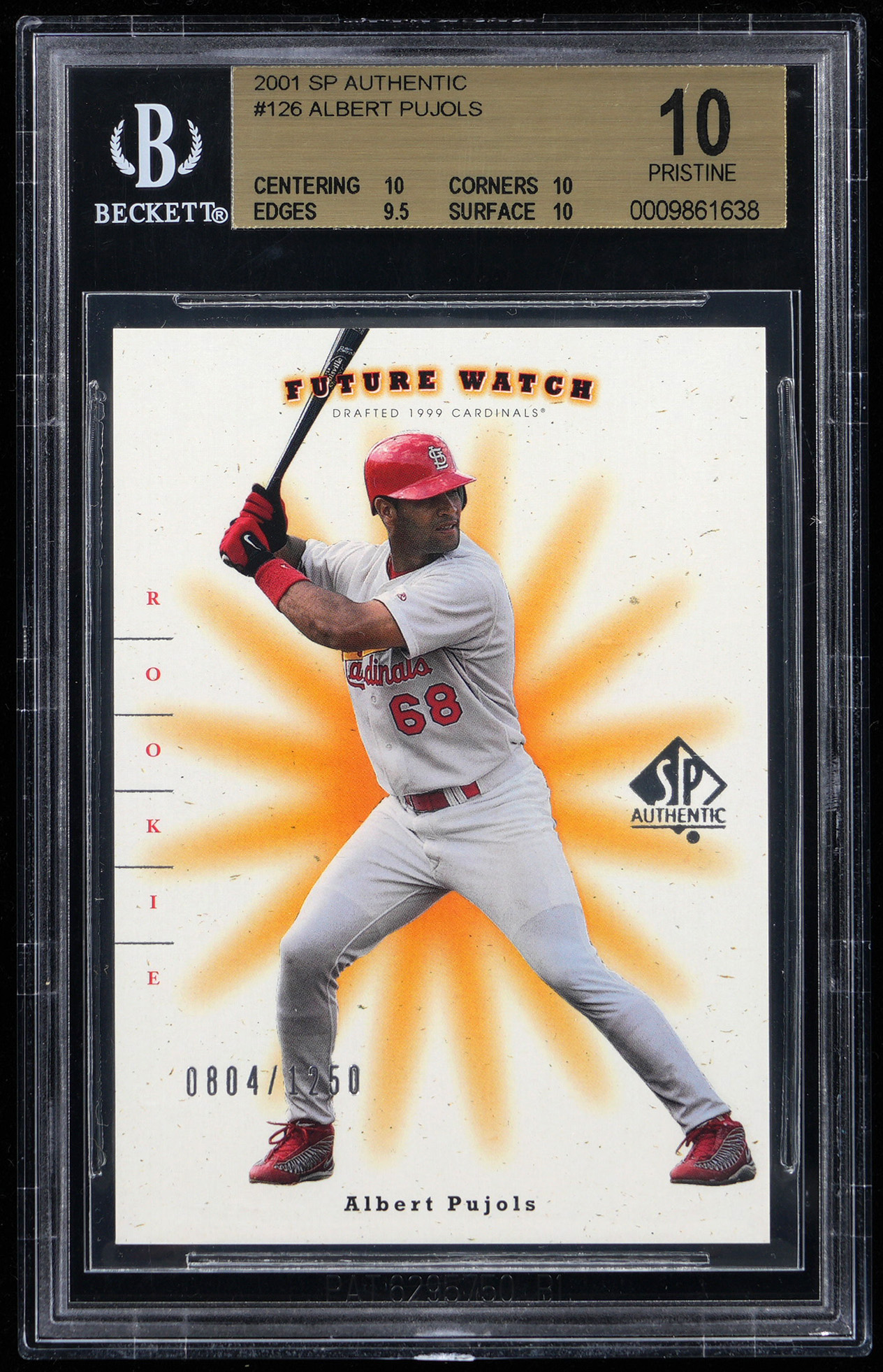 Graded PRISTINE 10 by BGS and serially numbered #0804/1250. As one of only two members of the 700 Home Run/3,000 Hit Clubs (Hank Aaron is the other), Cooperstown is in the near future for St. Louis Cardinals great Albert Pujols. As such, rookie material of "The Machine" is a sure-fire "blue chip" opportunity. Turn your bidding efforts toward the offered 2001 SP Authentic #126 rookie card with three 10 sub-grades! The overall condition breakdown is as follows: Centering: 10; Corners: 10; Edges: 9.5 and Surface: 10.