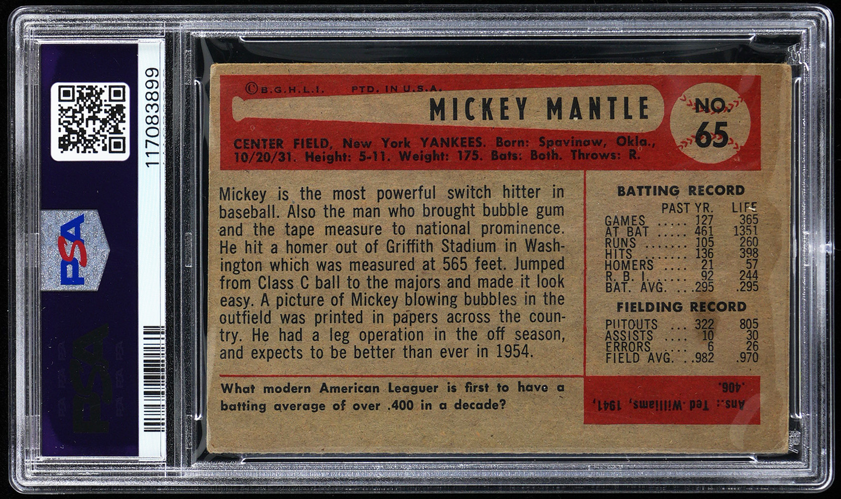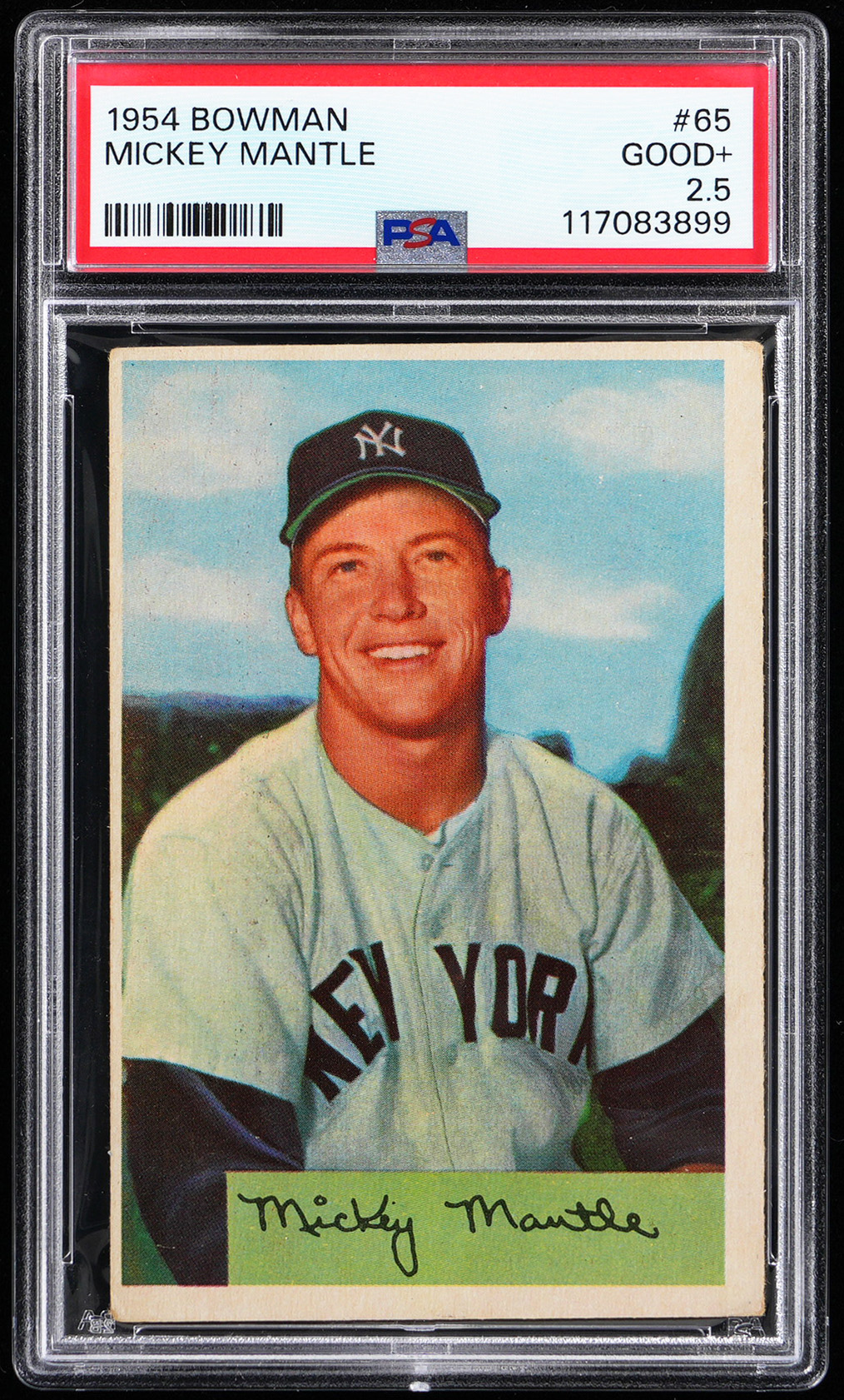 Graded GOOD+ 2.5 by PSA. The toolsy Oklahoma native is showcased on the offered 1954 Bowman #65 Mickey Mantle gum card. The surface is crease-free and beset by only moderate corner/edge wear and factory errant centering. The reverse is wax stain-free with strong biographical text. New York Yankees Hall of Famer.