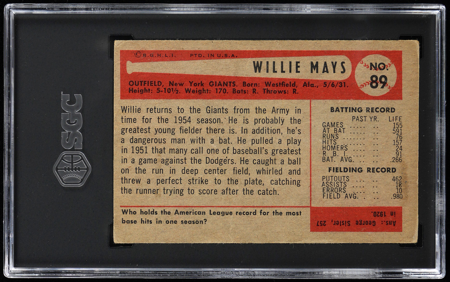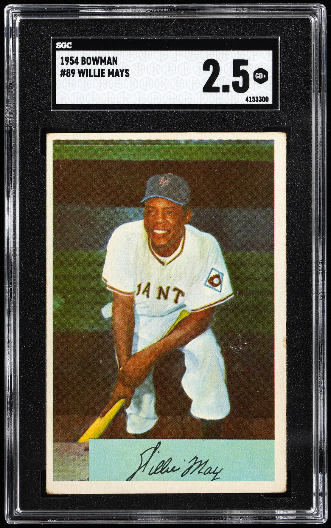 Graded GOOD+ 2.5 by SGC. From the season in which Vic Wertz became the unfortunate victim of "the catch" arrives the offered 1954 Bowman #90 Willie Mays keystone. New York Giants Hall of Famer.