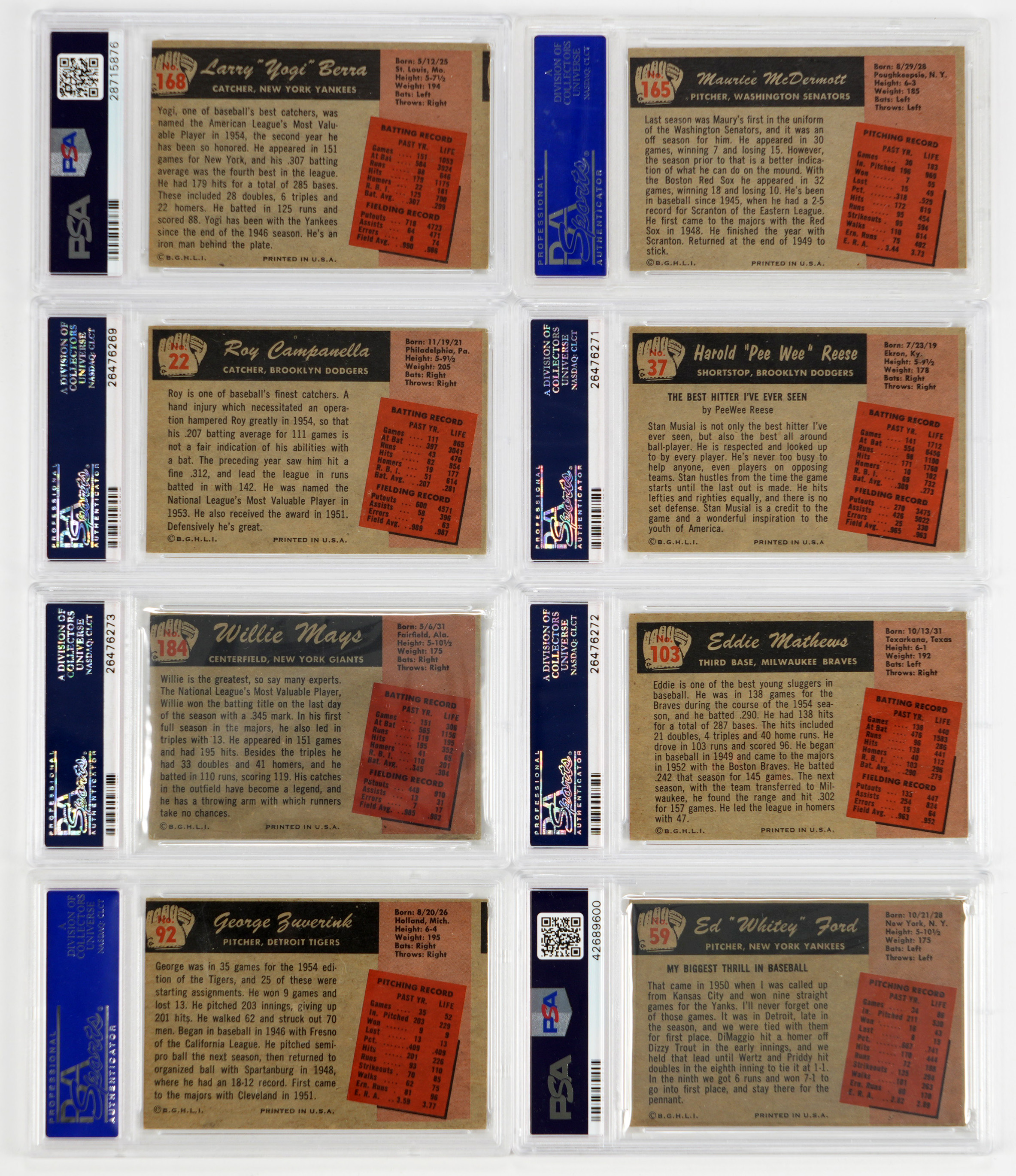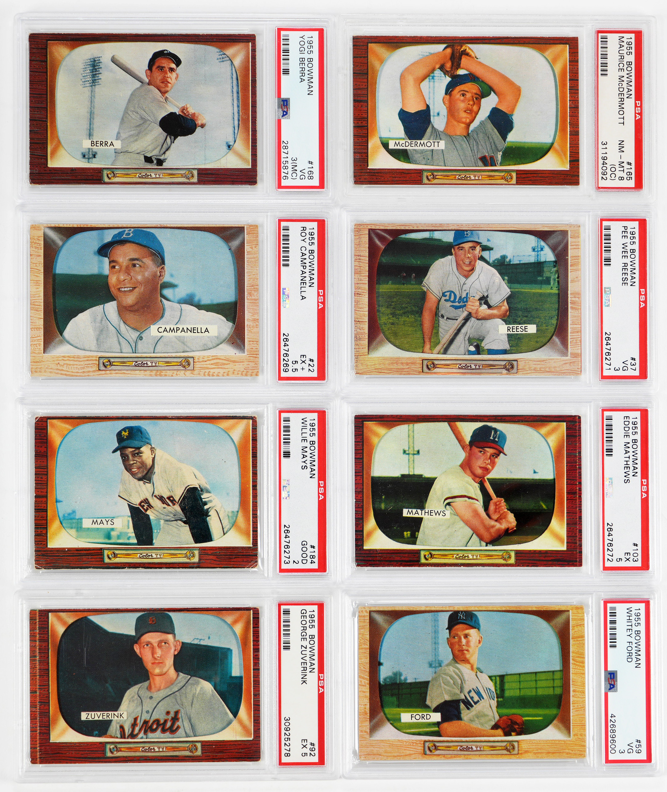 Each graded by PSA. "Say Hey" and gang are the focus of these (8) 1955 Bowman singles featuring a six-pack of Hall of Famers. Includes: PSA NM-MT 8 (oc): #165; PSA EX+ 5.5: #22 Campanella; PSA EX 5: (2 cards) with #92, #103 Mathews; PSA VG 3: (3 cards, includes one qualifier) with #37 Reese, #59 Ford, #168 Berra (mc) and PSA GOOD 2: #184 Mays.