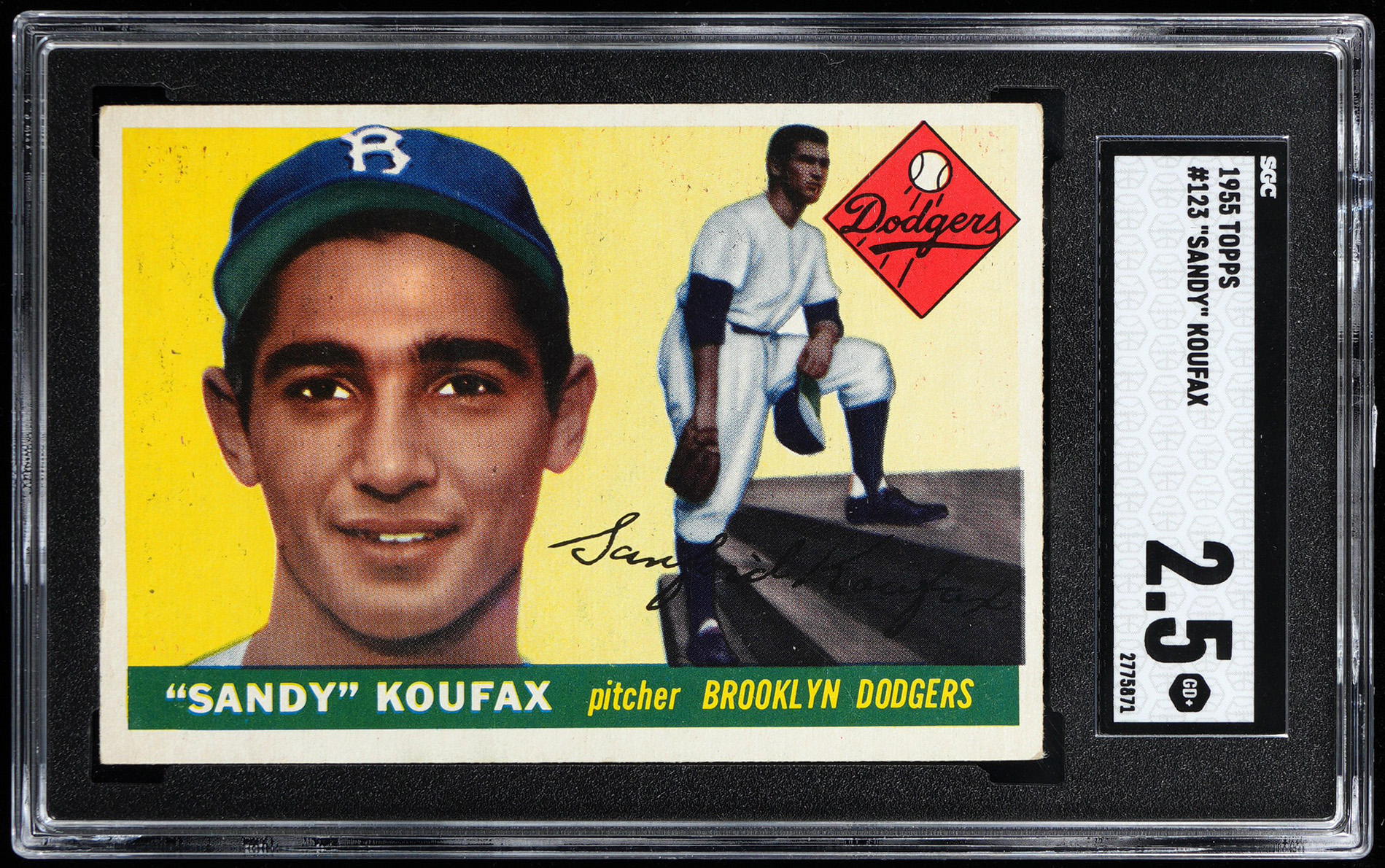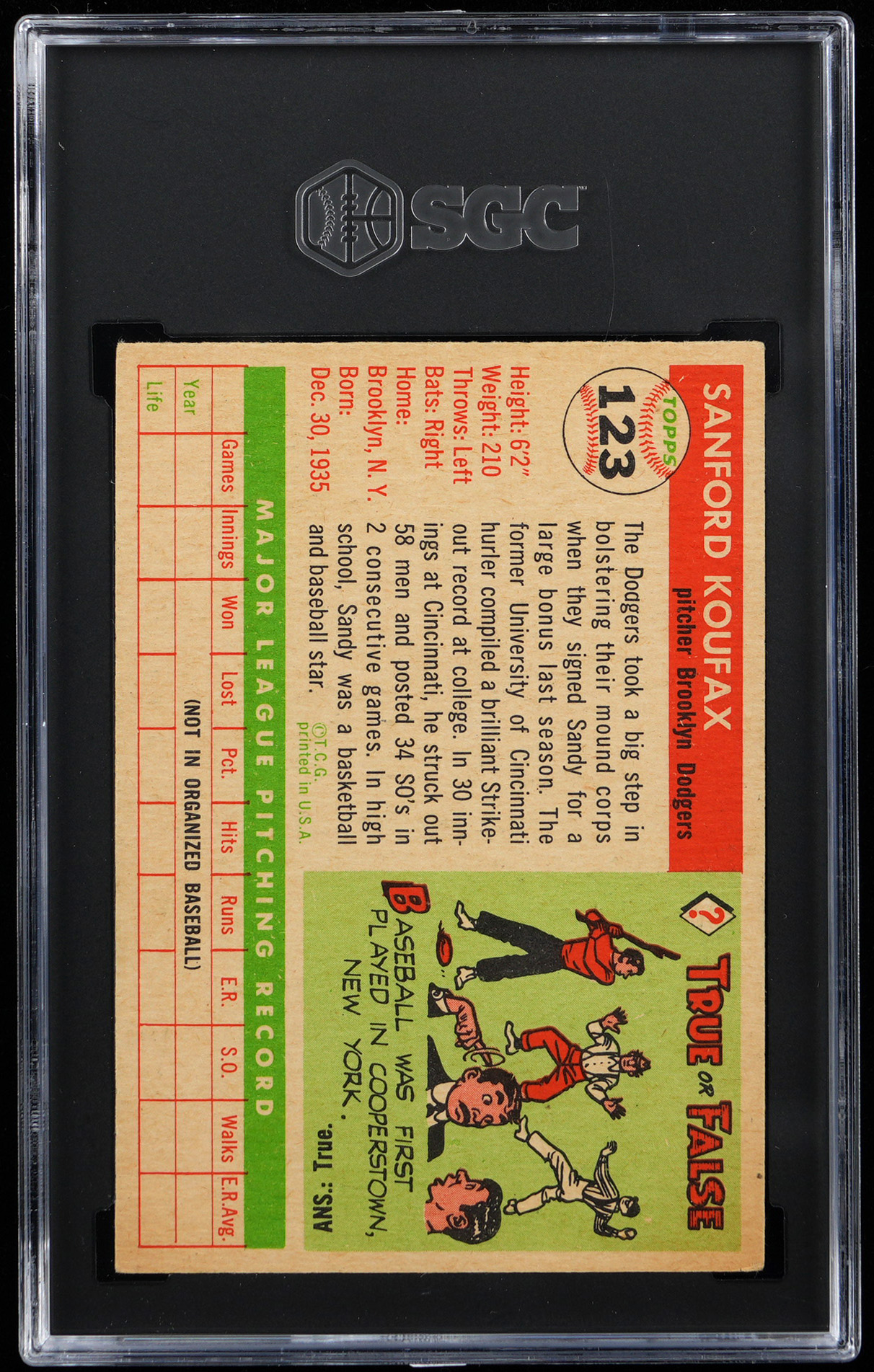 Graded GOOD+ 2.5 by SGC. Seize the offered 1955 Topps #123 Sandy Koufax rookie card. This frontline Brooklyn Dodgers Hall of Fame ace stands the test of time on this eye-catching debut.