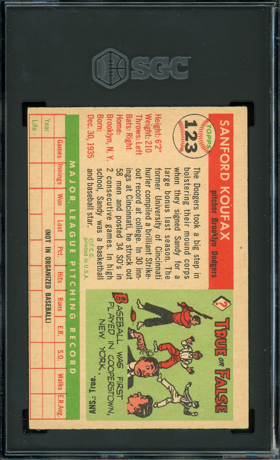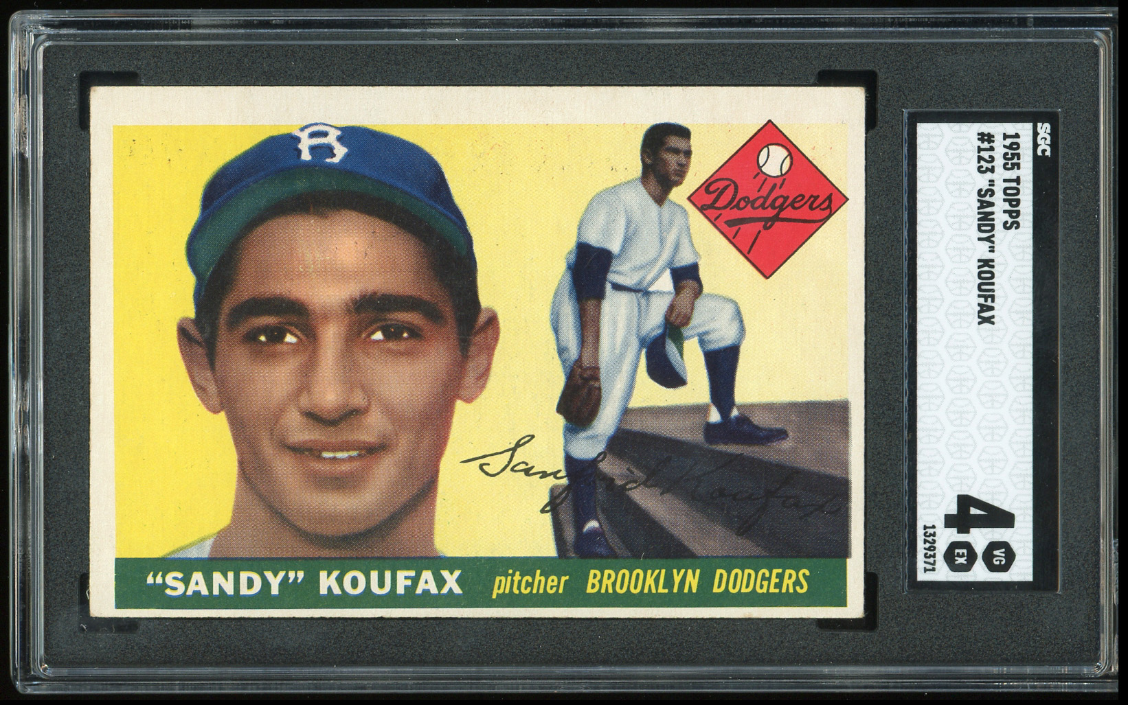 Graded VG/EX 4 by SGC. Keynote 1955 Topps #123 Sandy Koufax rookie card. This future Brooklyn Dodgers Hall of Fame ace is crease-free with only moderately touched corners, creamy edges and blazing dual action/portrait colors. Despite moderately errant top-to-bottom centering, this first-ballot legend still presents admirably.