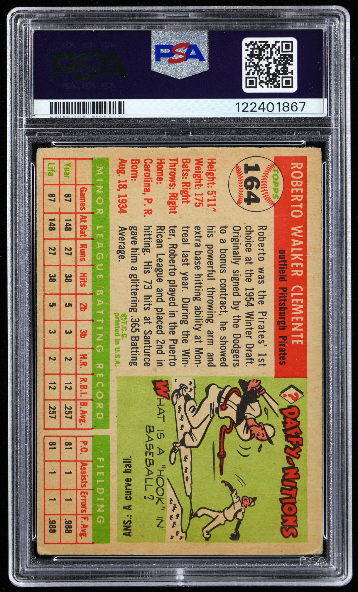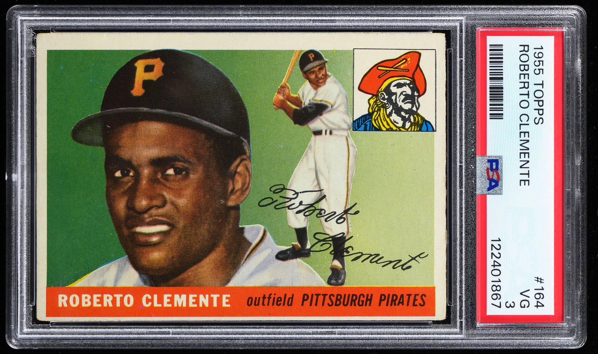 Graded VG 3 by PSA. Superb 1955 Topps #164 Roberto Clemente rookie card. This mid-grade classic of the Pittsburgh Pirates Hall of Famer is a fine option for set collectors!