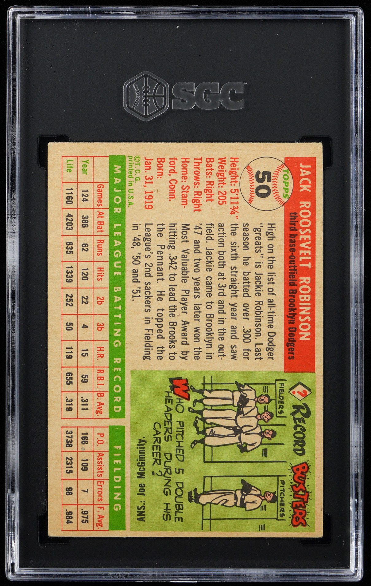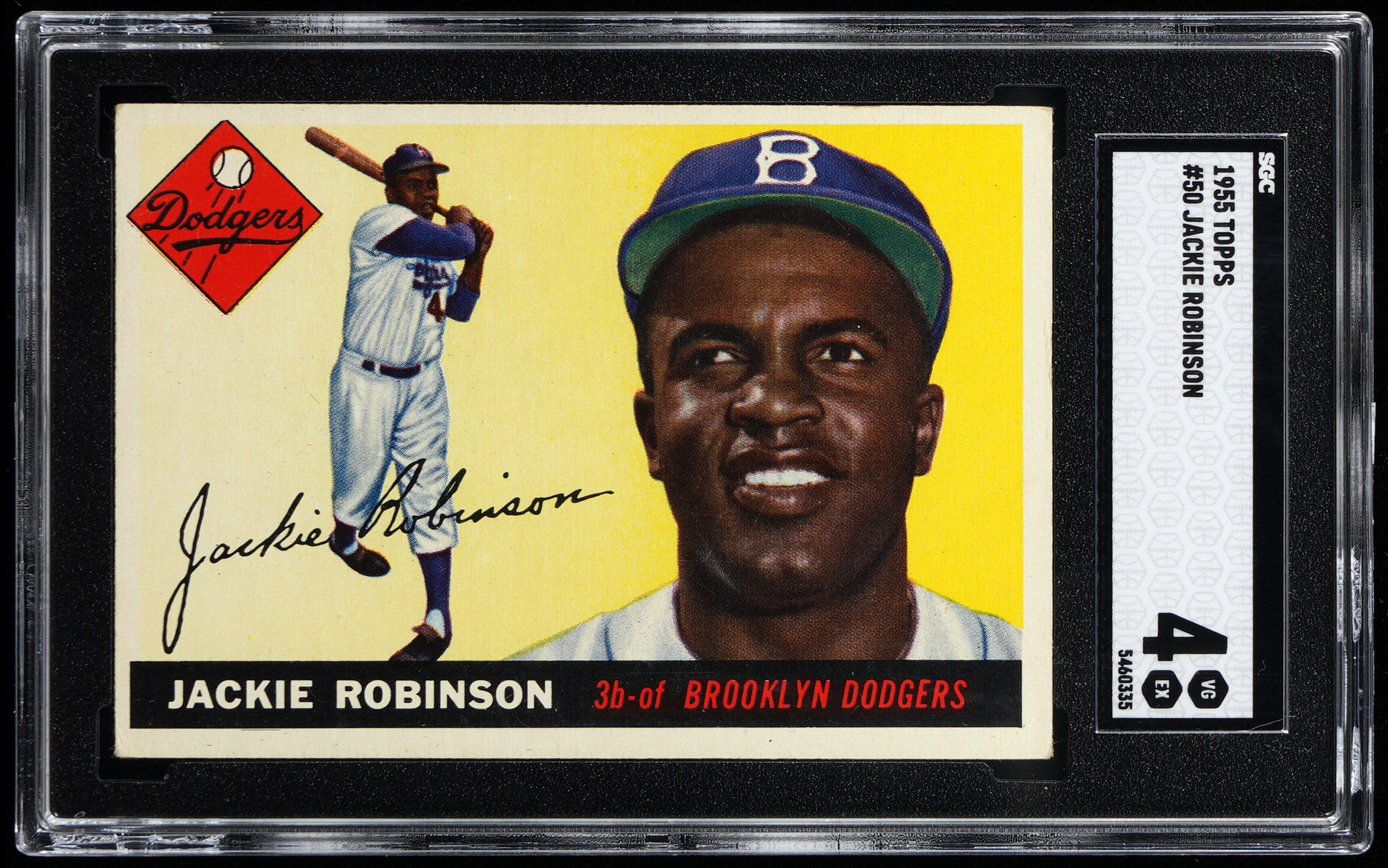 Graded 4 VG-EX by SGC. The second-to-last gum card of #42 is available with the offered 1955 Topps #50 Jackie Robinson example. Despite factory errant left-to-right centering, this handsome dual action/portrait pose is otherwise crease-free with glistening surface colors. Full diamond version.