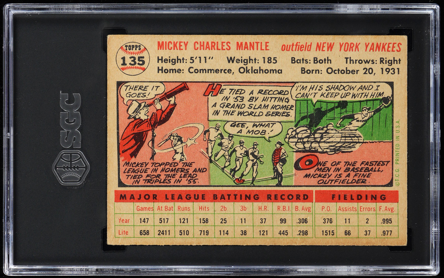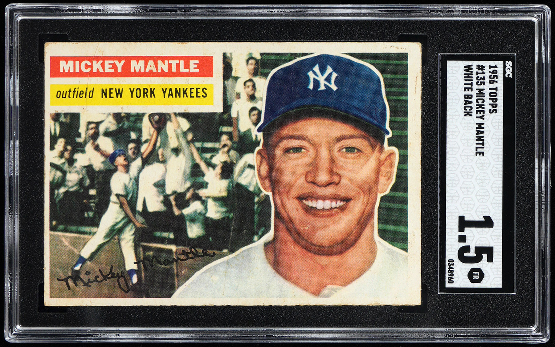 Graded FAIR 1.5 by SGC. Finish your 1956 Topps project by scoring the offered #135 Mickey Mantle. This centerpiece presents at the peak of its overall judgment and displays a tougher white back.