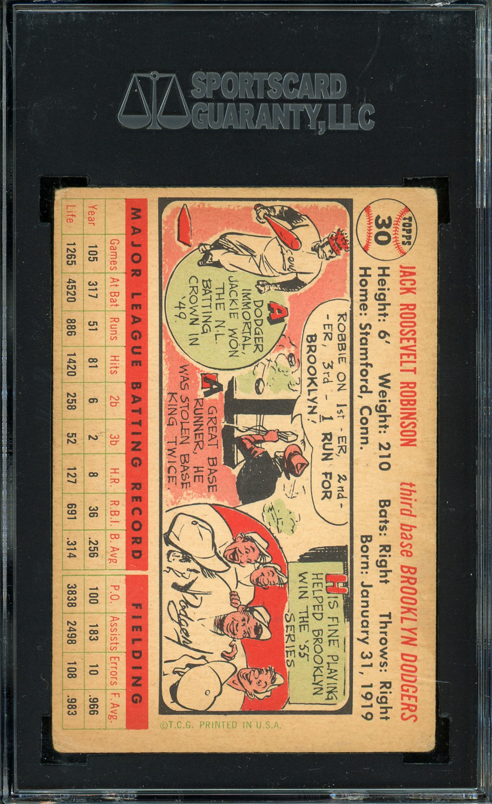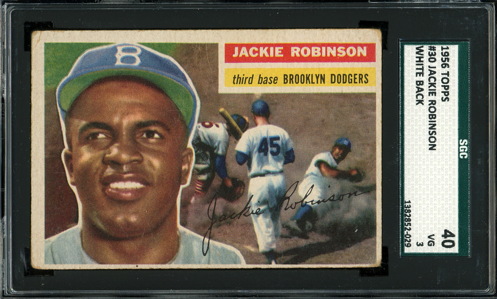 Graded VG 3 by SGC. The last cardboard representation of Jackie Robinson's transformative career. This Brooklyn Dodger Hall of Famer is graced with a white back.