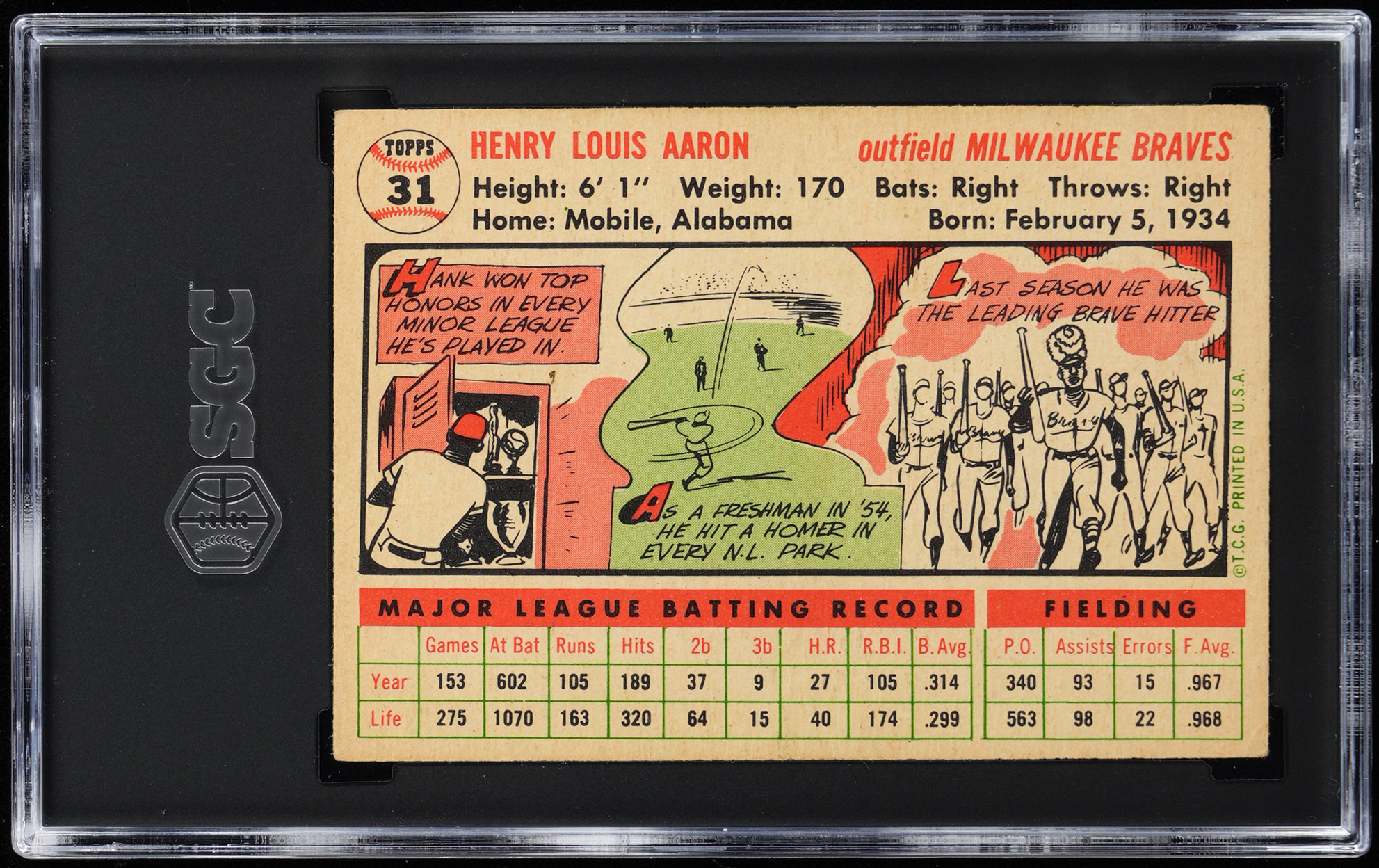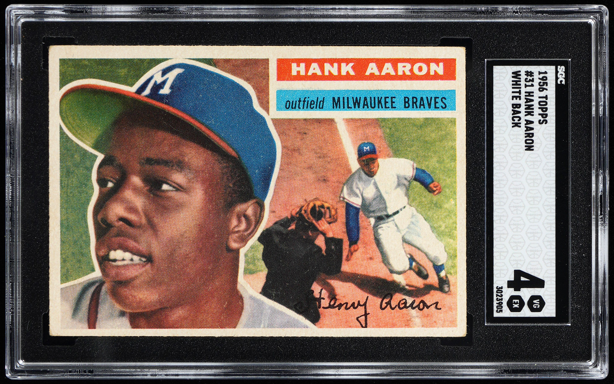 Graded VG/EX 4 by SGC. Milwaukee Braves Hall of Fame legend Hank Aaron. White back version.