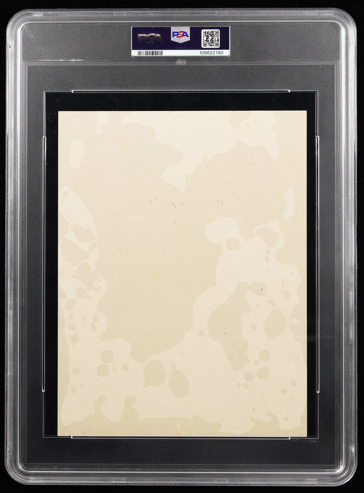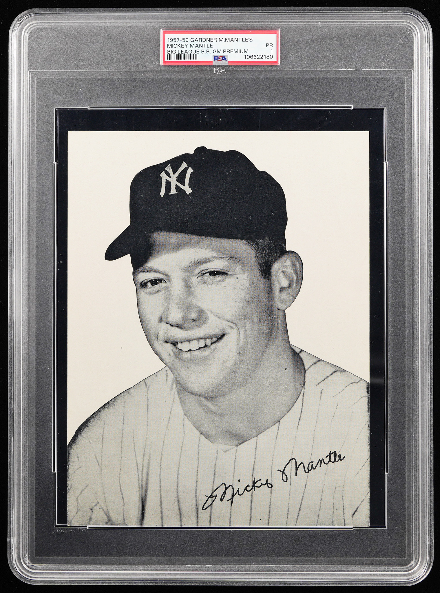 Graded POOR 1 by PSA. Only 30 total examples of the offered 1957-1959 Gardner Mickey Mantle's Big League Baseball Premium have been judged by the authenticator. This handsome black-and-white portrayal of the New York Yankees Hall of Famer measures 6-7/8 x 8-15/16" and is printed on thin paper stock. Despite multiple surface wrinkles scattered throughout, the overall presentation of this #7 oddball specialty is not severely impacted and the blank reverse is clean. If the image appears familiar, it was also used for "The Mick" on the 1954 Dan-Dee Potato Chips and 1953-1955 Stahl-Meyer issues.
